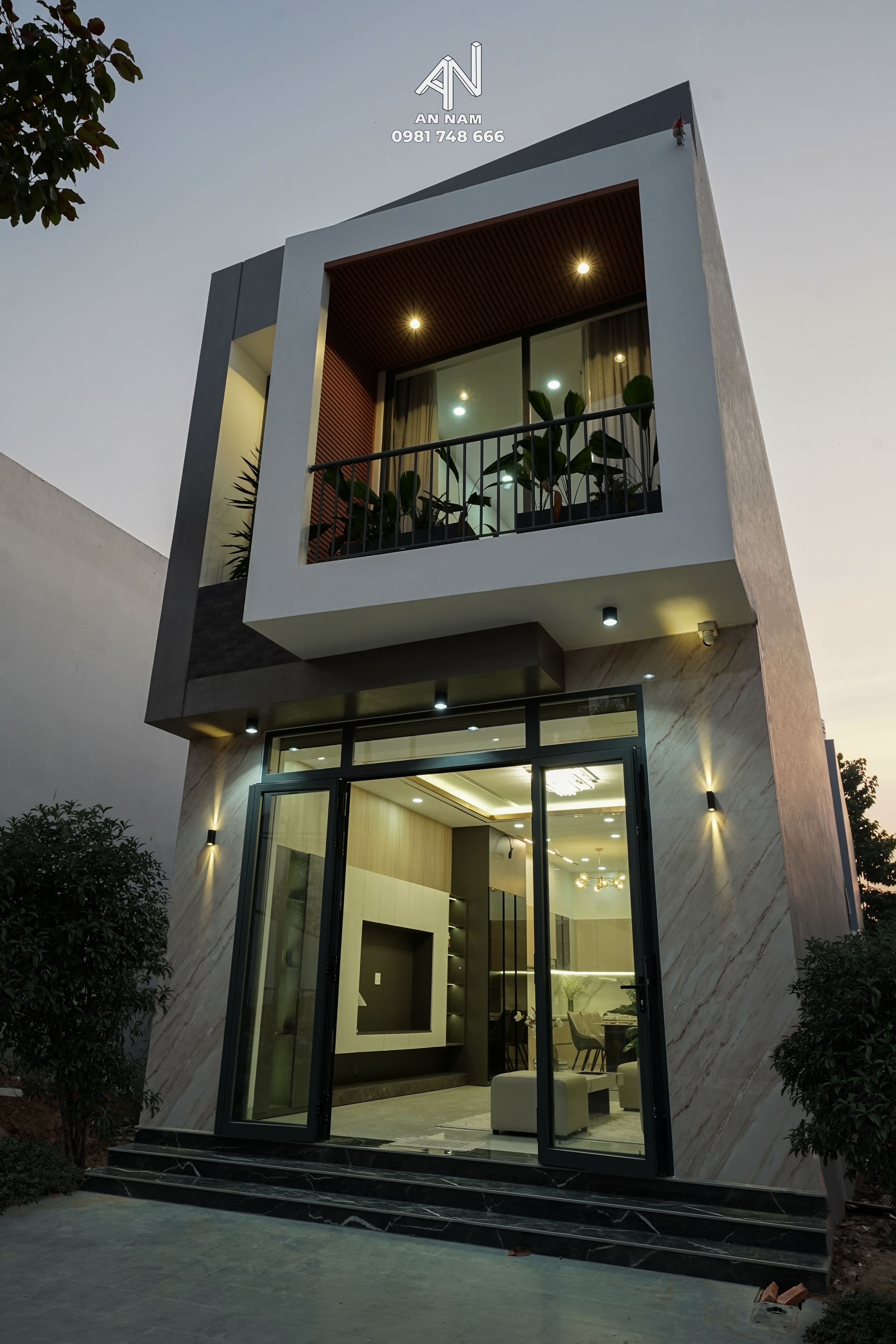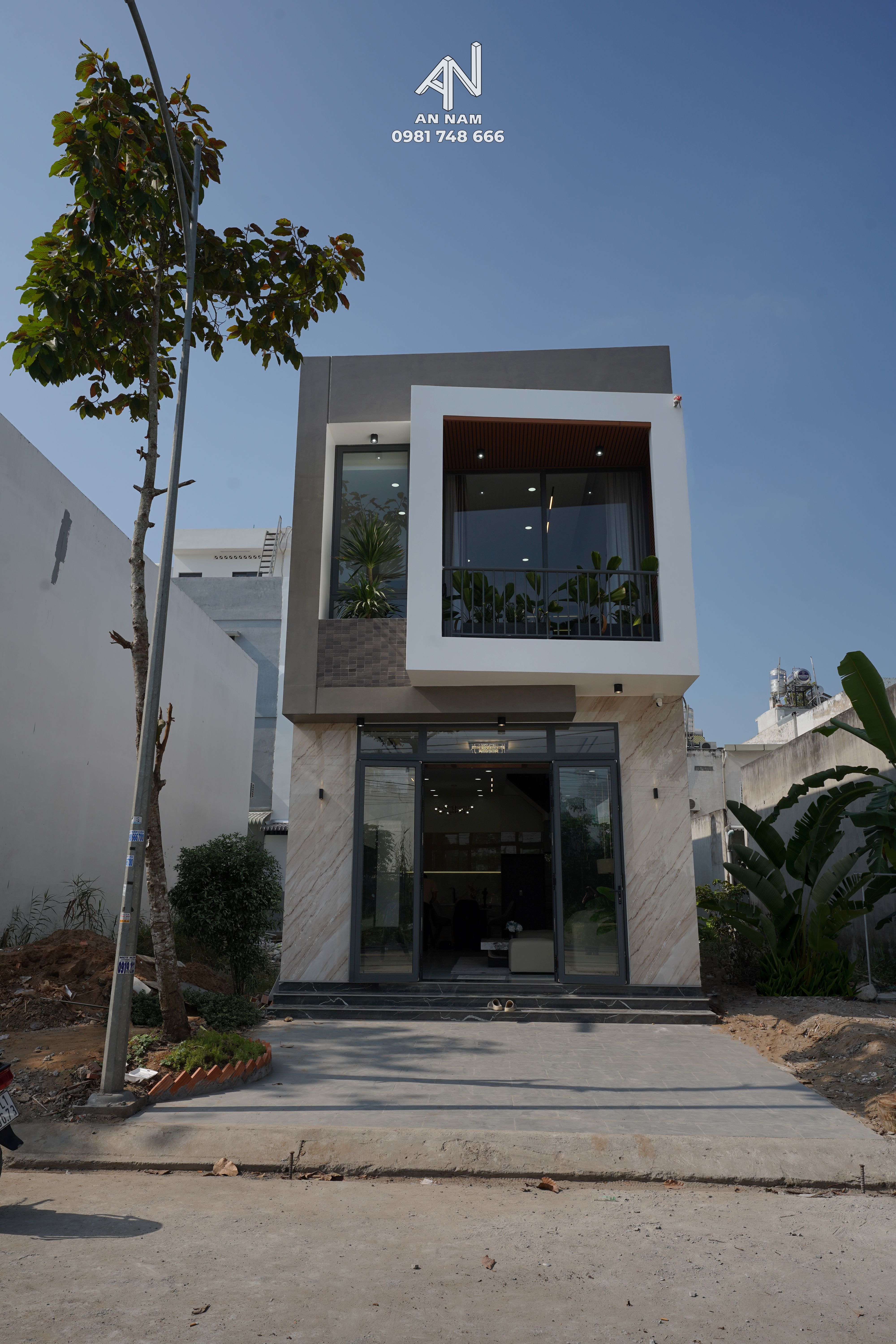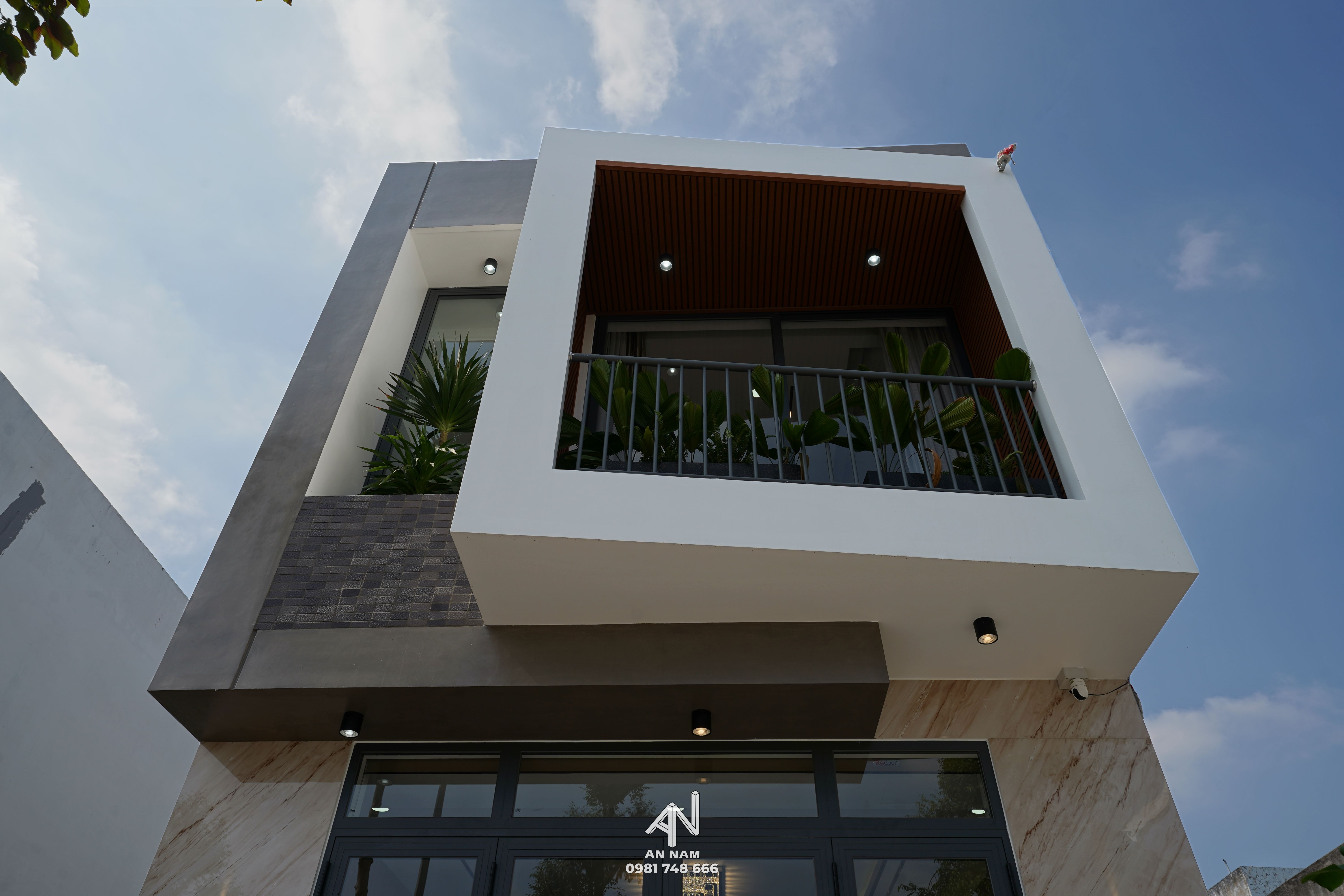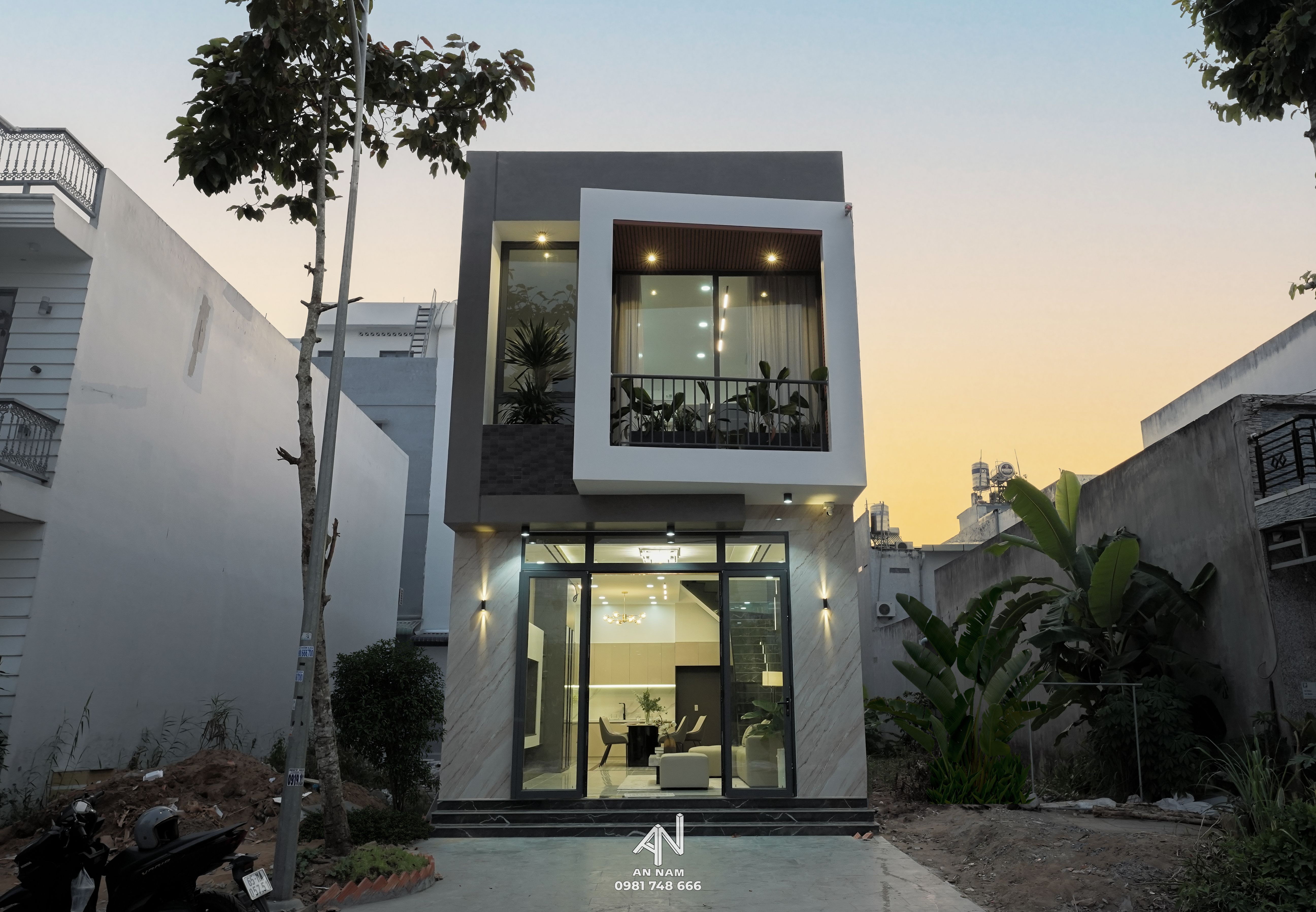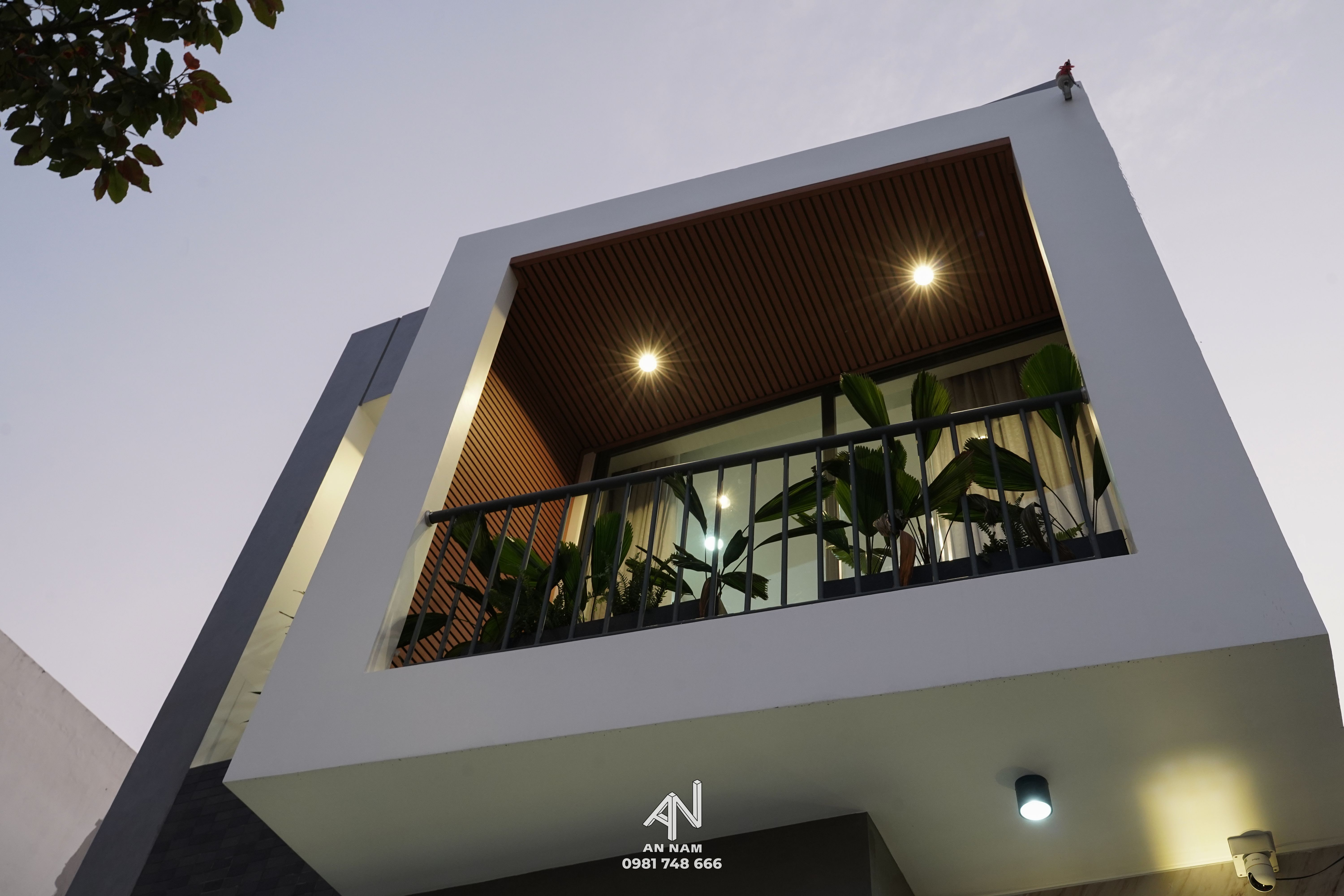 Ngôi nhà 1 trệt 1 lầu ấn tượng với kiến trúc vuông vắn, khoẻ khoắn, hình khối rõ ràng kết hợp cùng tone màu trắng xám thanh lịch.