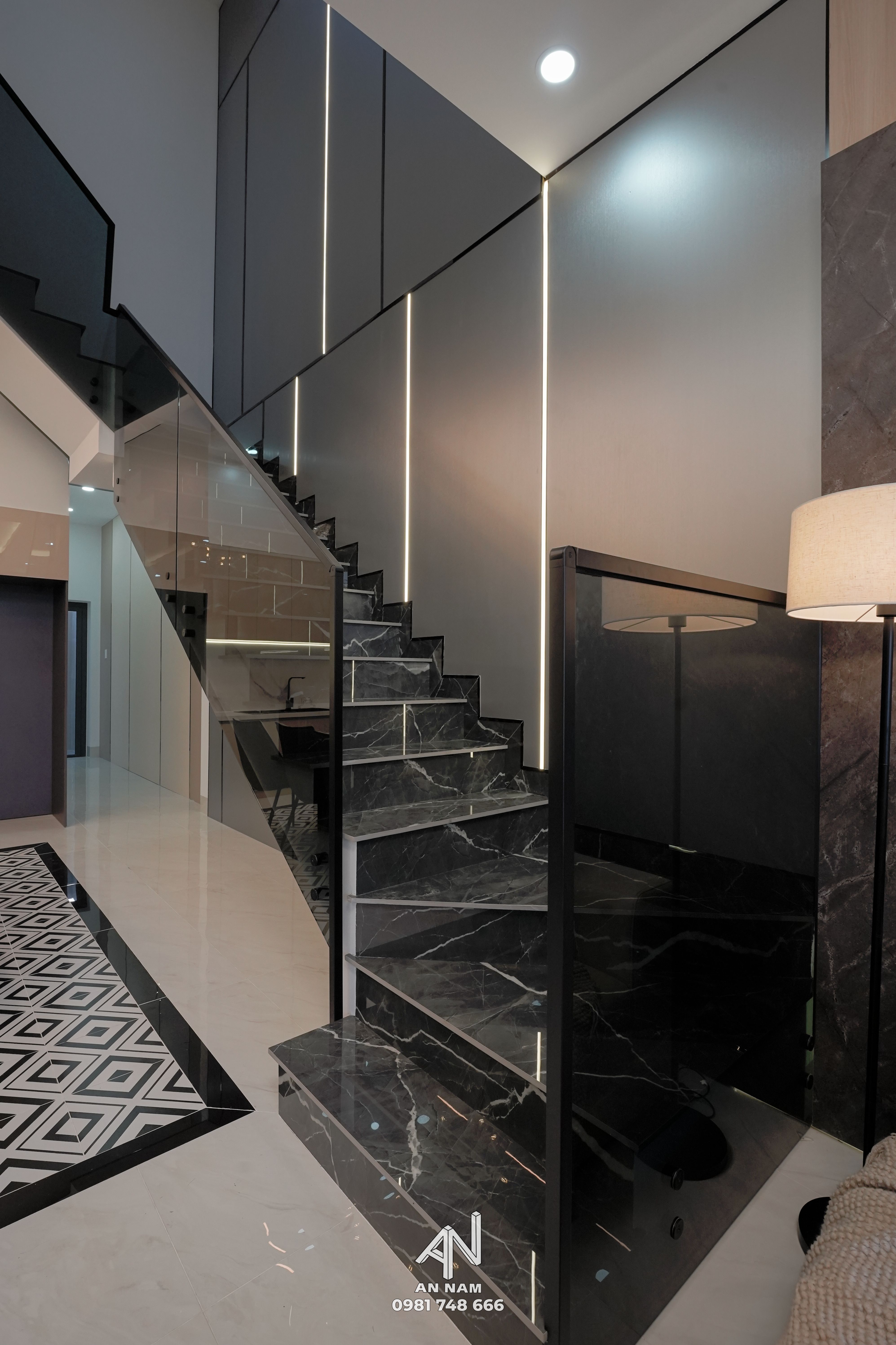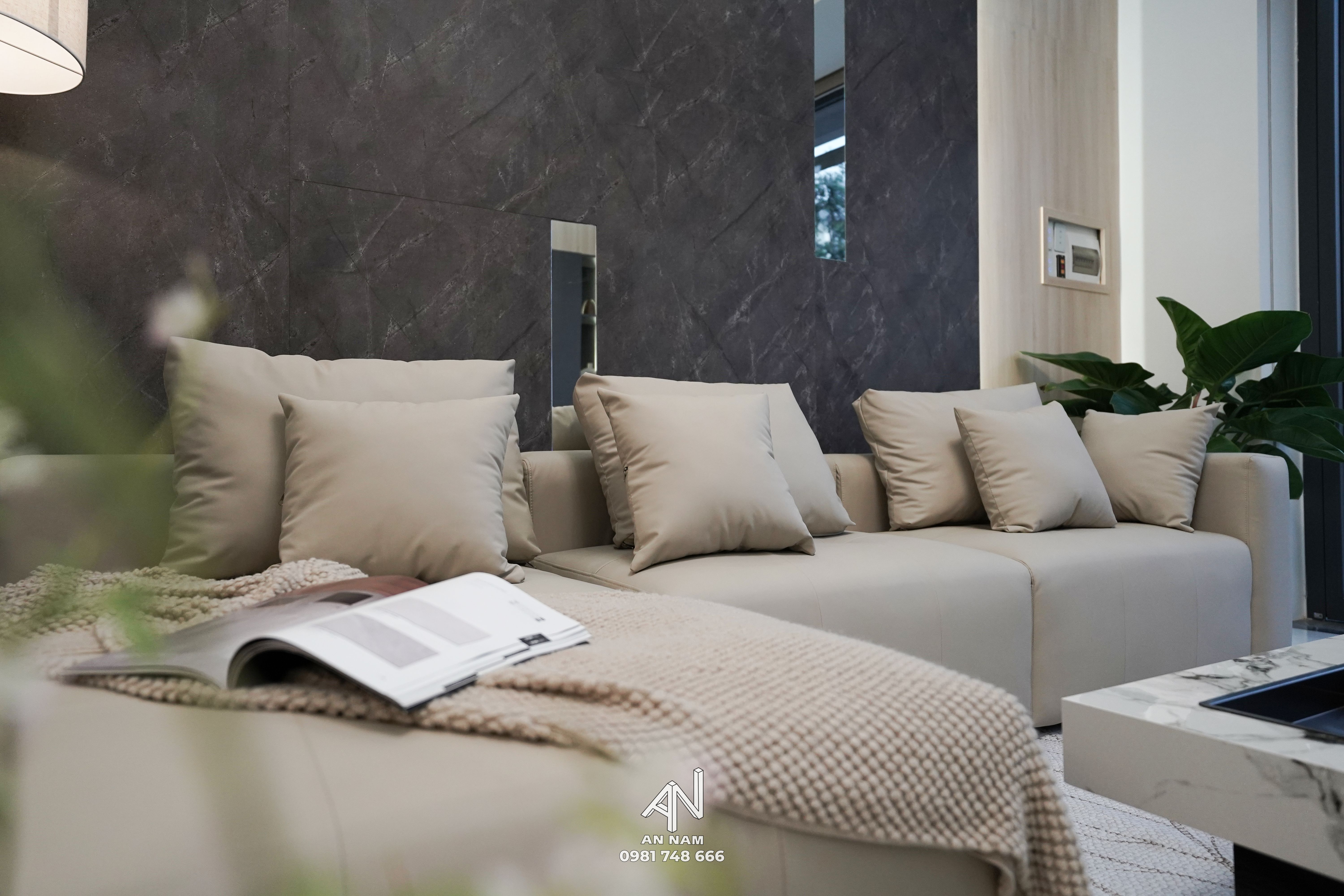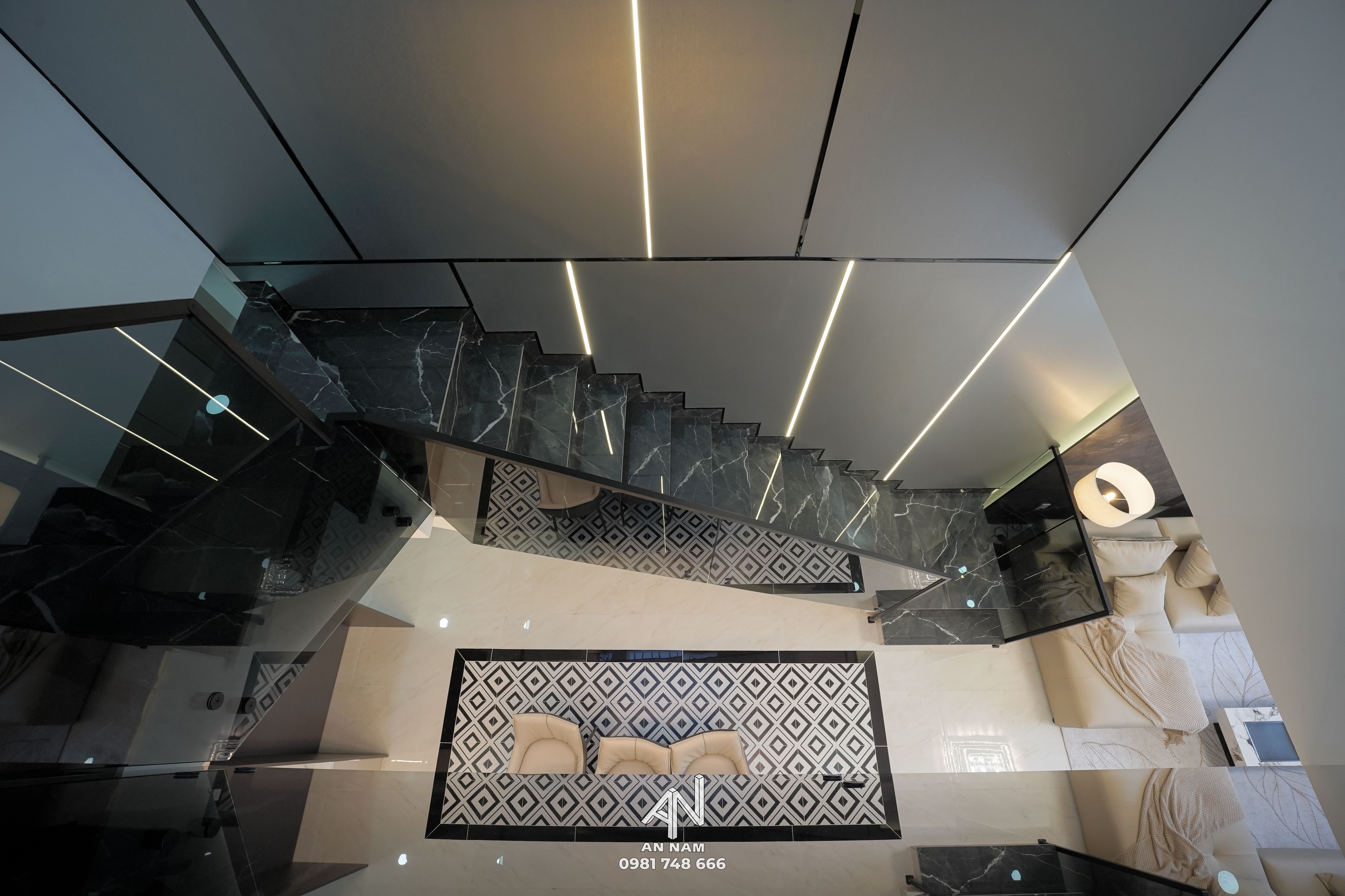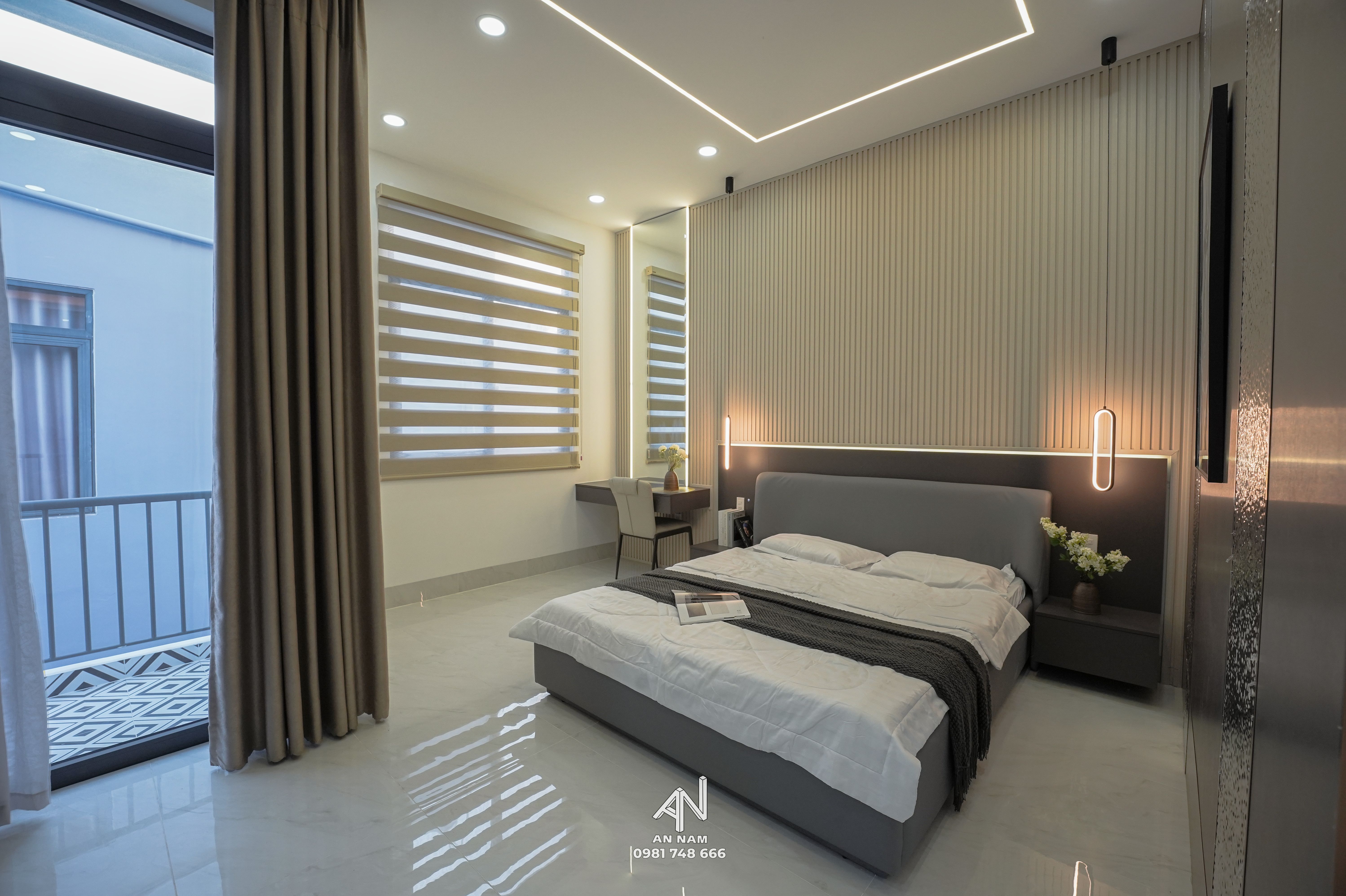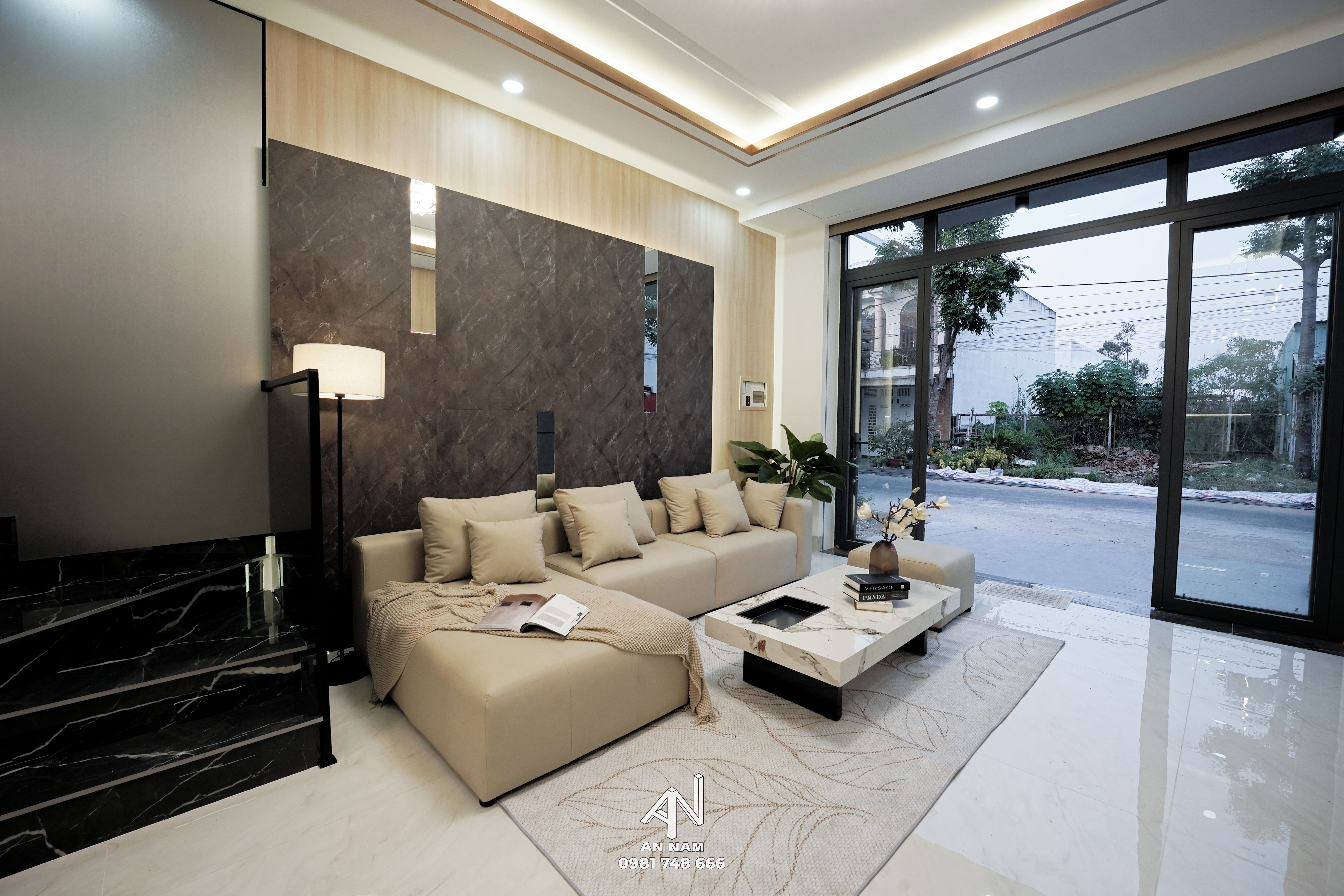 Ngôi nhà 1 trệt 1 lầu ấn tượng với kiến trúc vuông vắn, khoẻ khoắn, hình khối rõ ràng kết hợp cùng tone màu trắng xám thanh lịch.