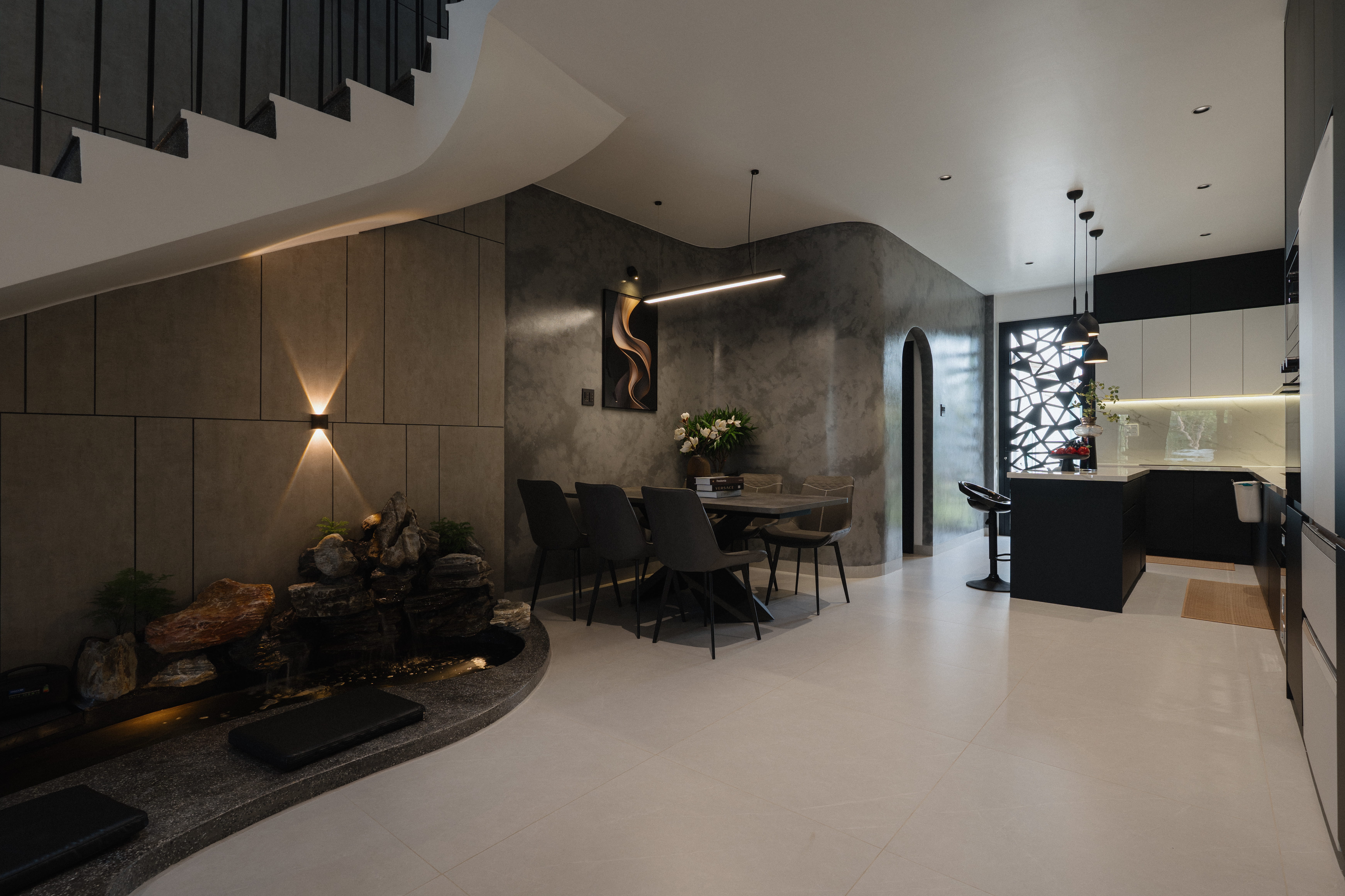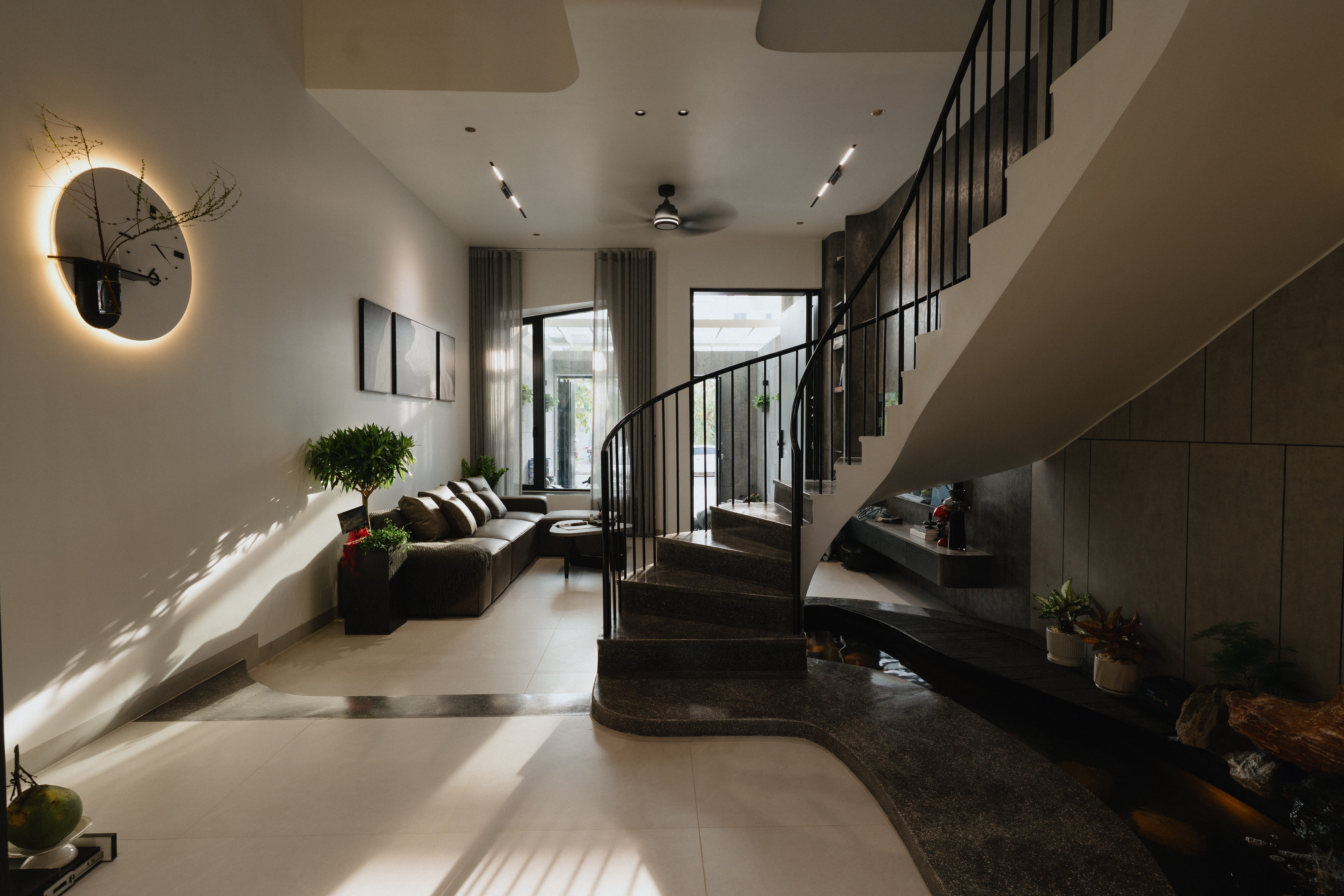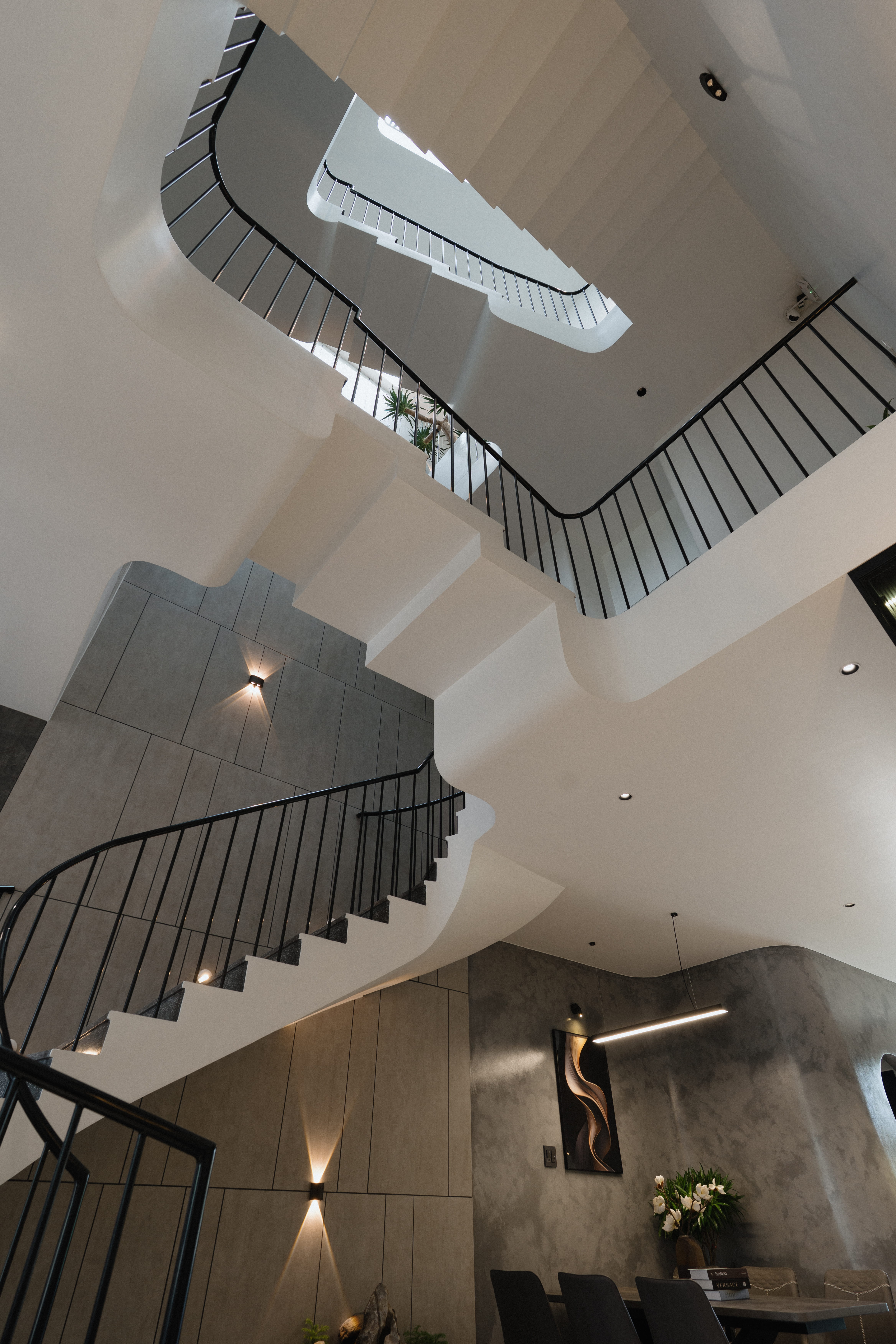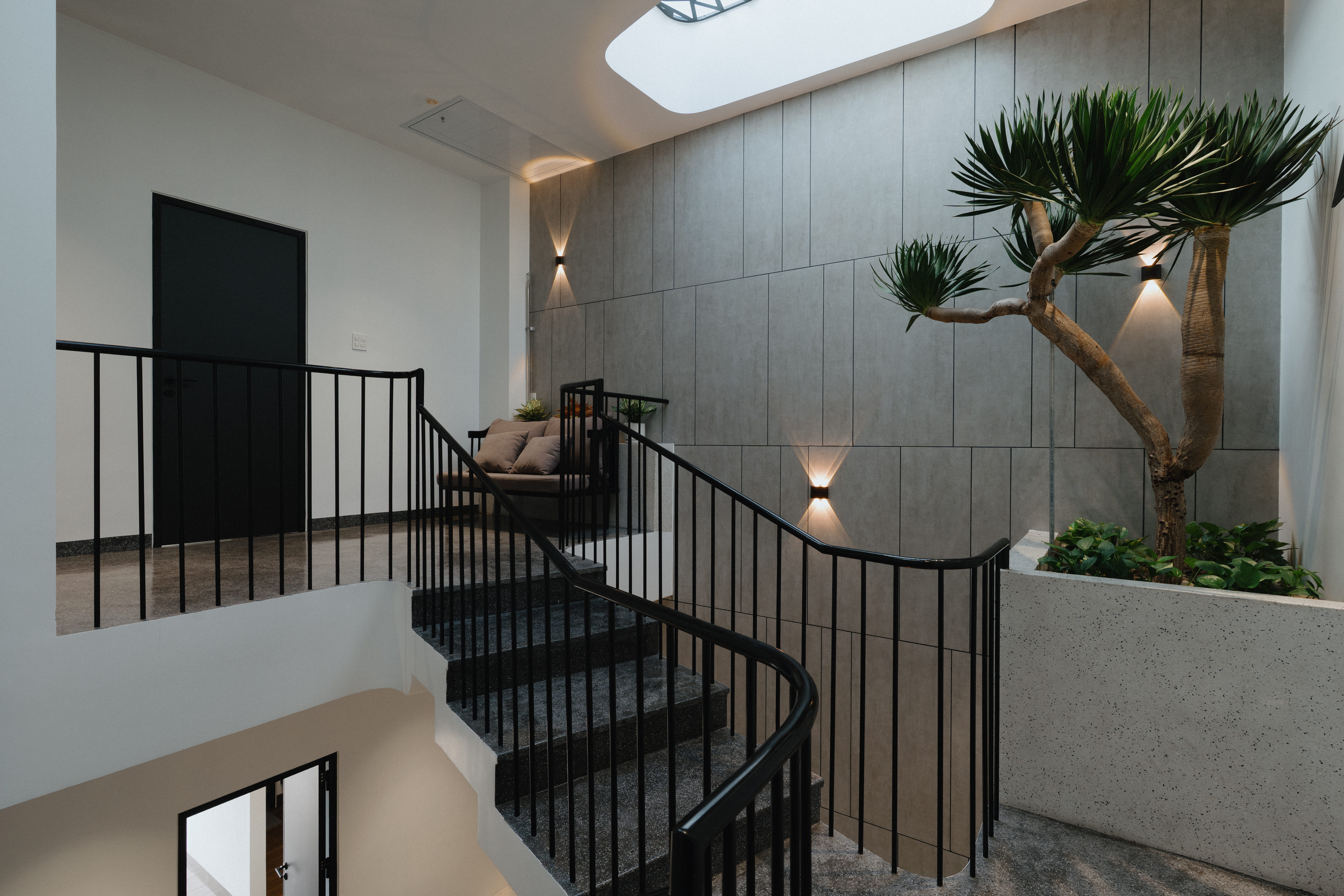 Điểm nhấn là hệ cầu thang lệch tầng độc đáo kết nối 3 tầng lầu kết hợp hệ giếng trời lớn giúp căn nhà vừa thông thoáng, vừa tràn ngập ánh sáng.