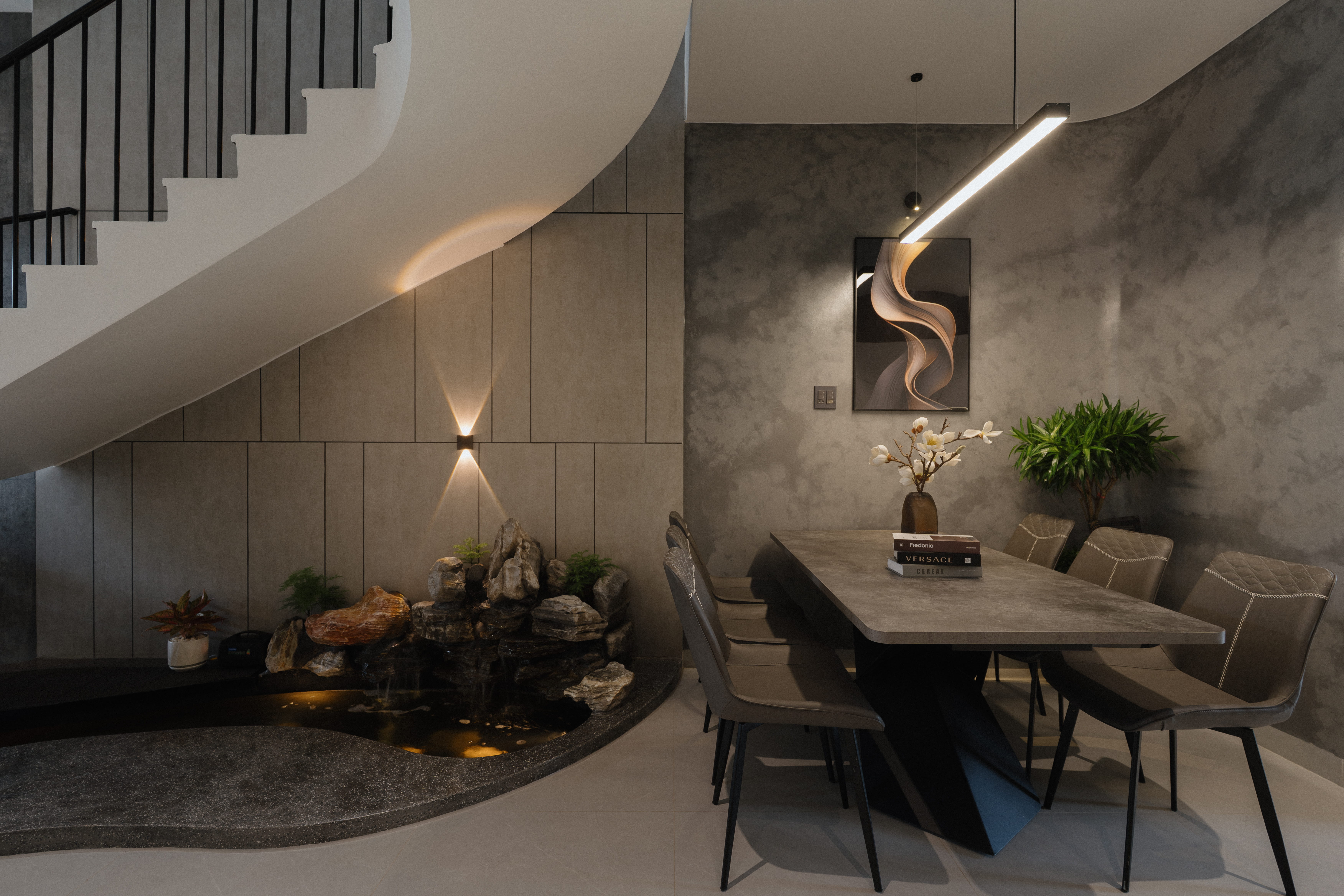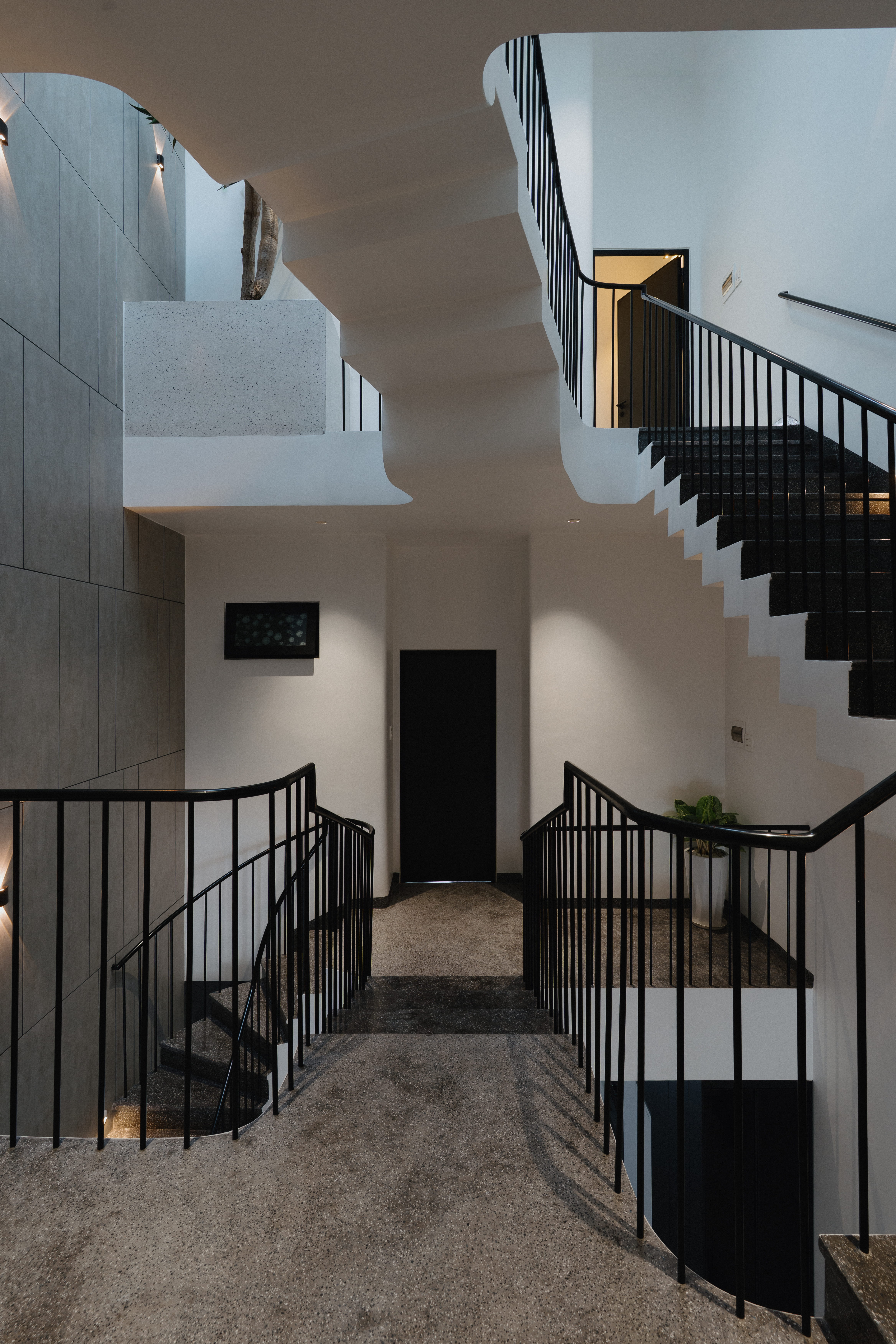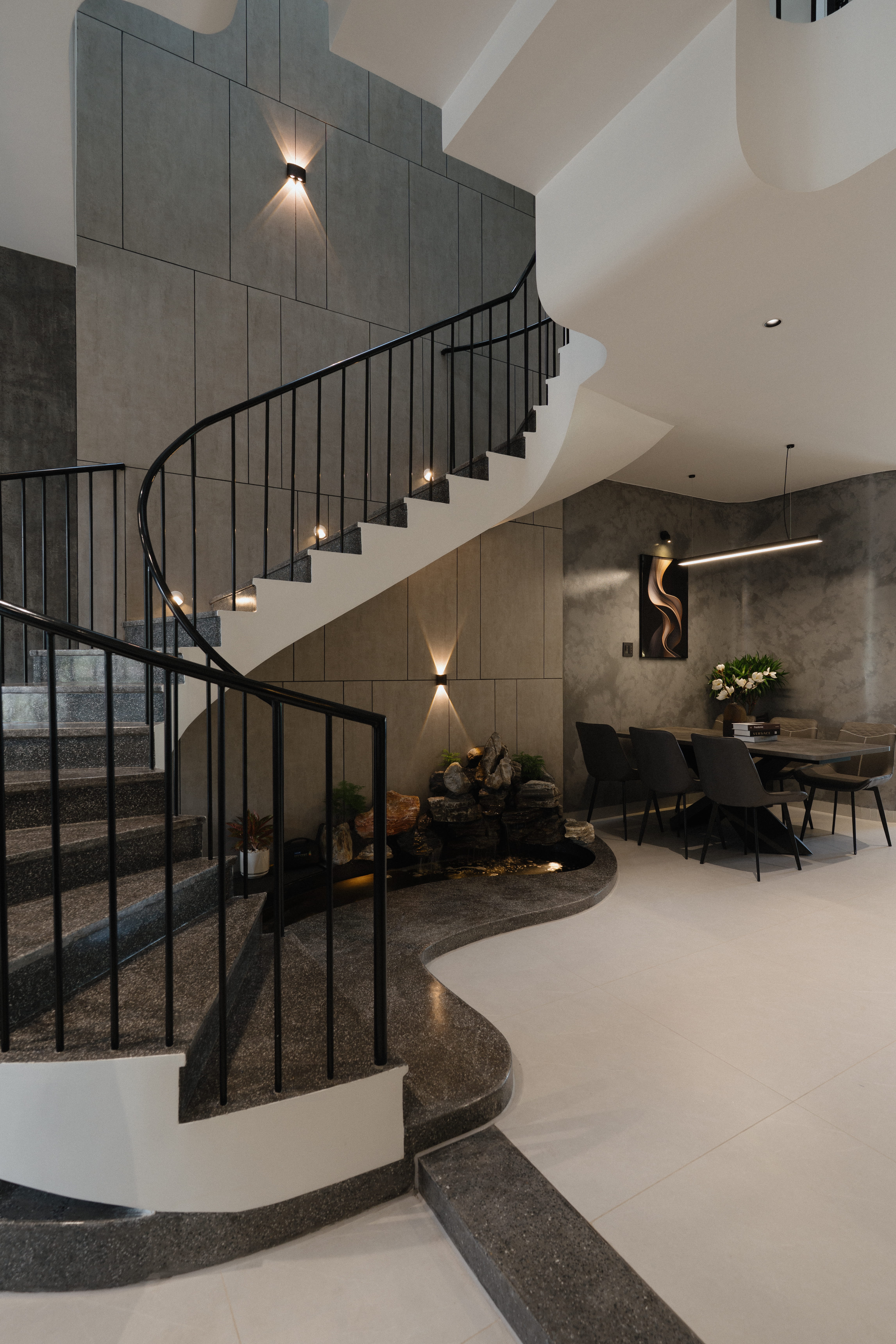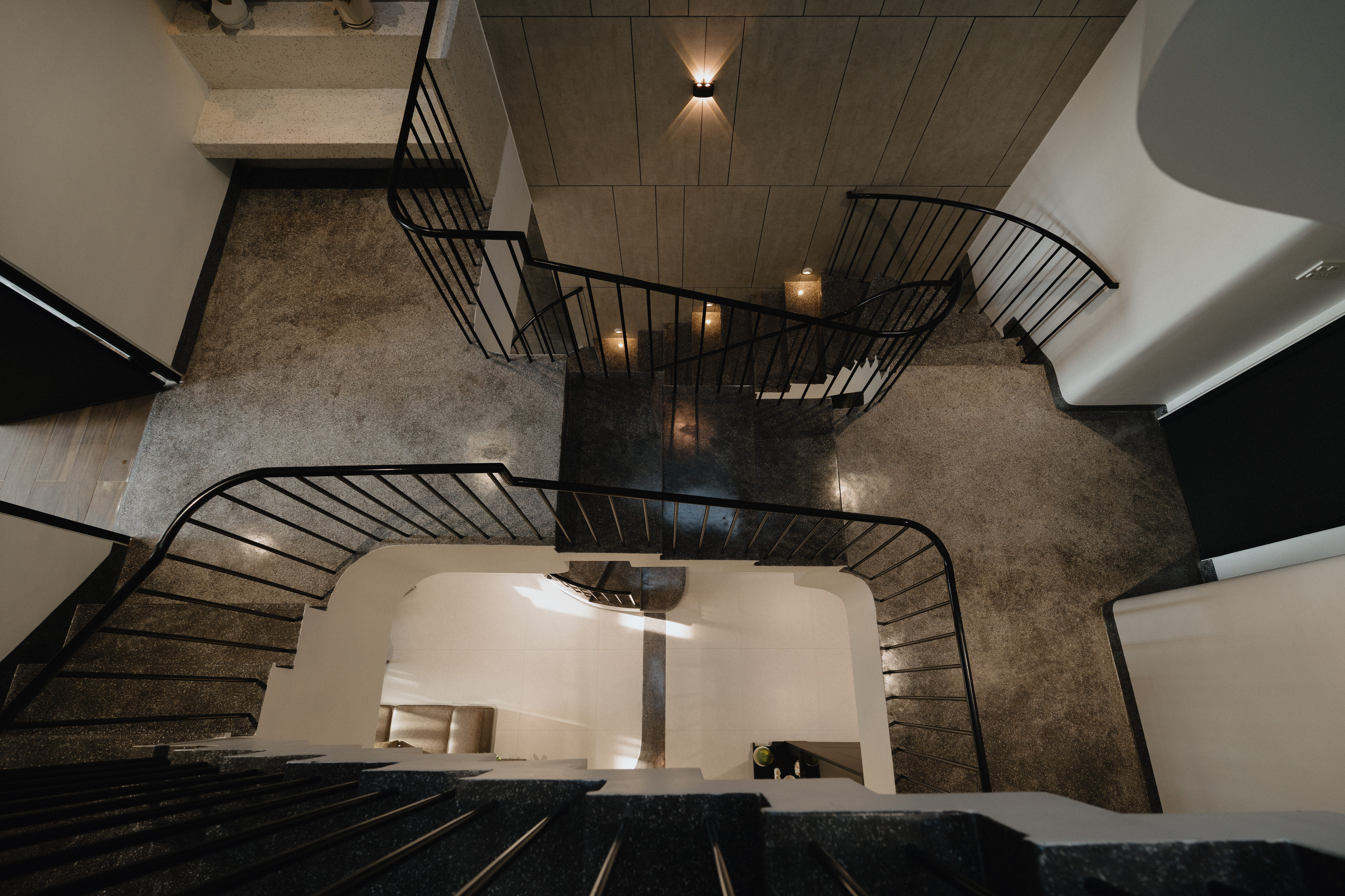 Điểm nhấn là hệ cầu thang lệch tầng độc đáo kết nối 3 tầng lầu kết hợp hệ giếng trời lớn giúp căn nhà vừa thông thoáng, vừa tràn ngập ánh sáng.