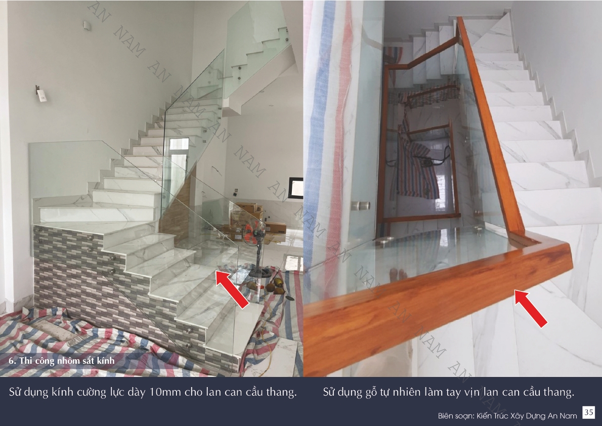 6. Đối với cầu thang kính, bạn nên dùng kính cường lực 10mm hoặc kính an toàn, tay vịn gỗ có thể sử dụng gỗ bên, gỗ óc chó, gỗ sồi.. tùy theo phong cách và sở thích của bạn