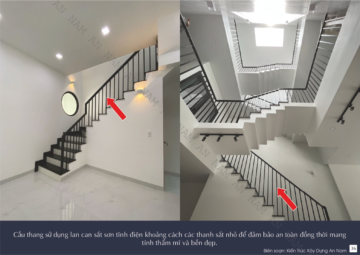 7. Đối với cầu thang sắt, bạn cần lưu ý vấn đề an toàn cho trẻ nhỏ: thanh phải là thanh dọc để trẻ không leo trèo có thể té ngã, khoảng cách giữa các thanh phải đủ nhỏ để trẻ không chui lọt qua khe hở