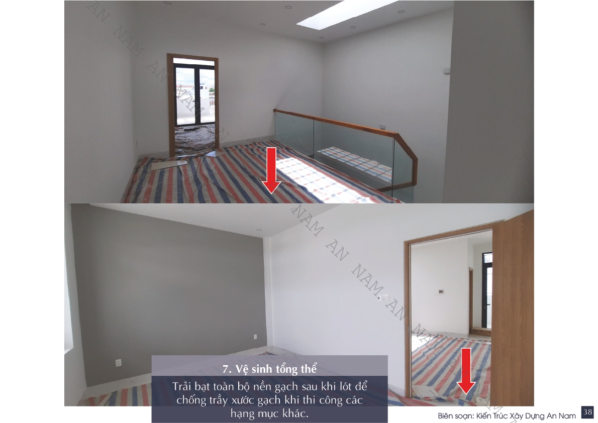 8. Phải giữ ron gạch sạch sẽ bằng cách trải tấm cao su hoặc dán băng keo lên đường ron gạch, nếu không ron gạch sẽ bám bụi đất, rất khó vệ sinh và kém thẩm mỹ