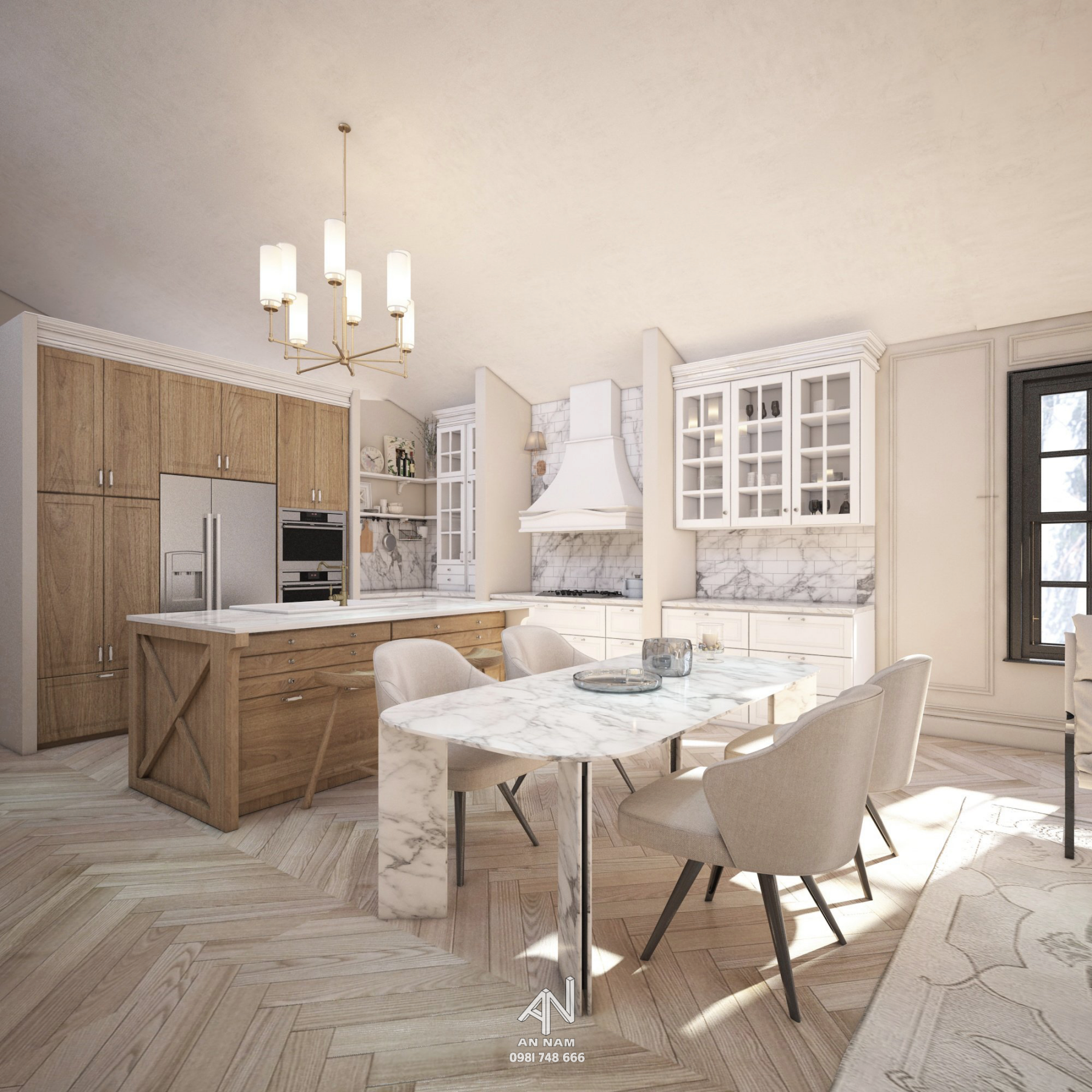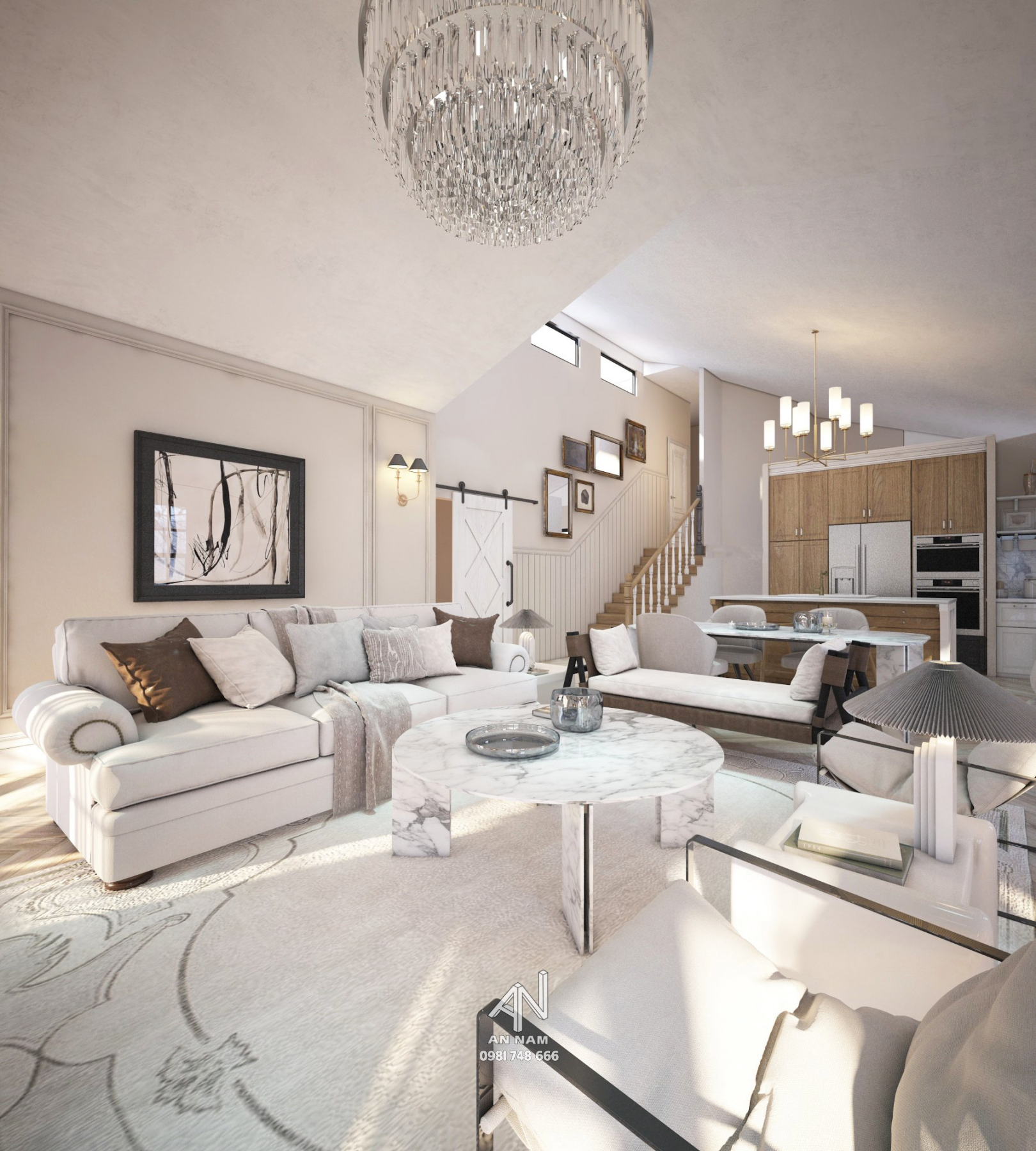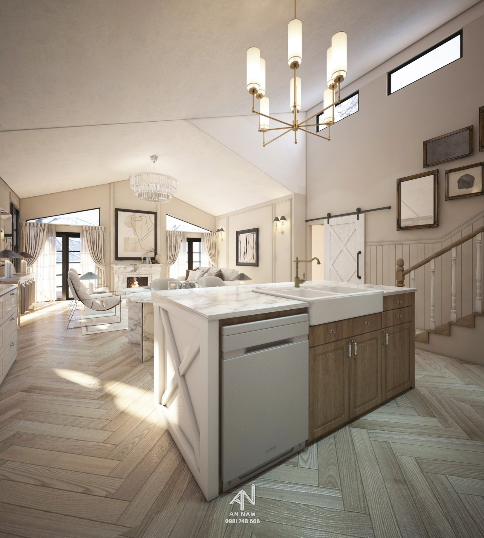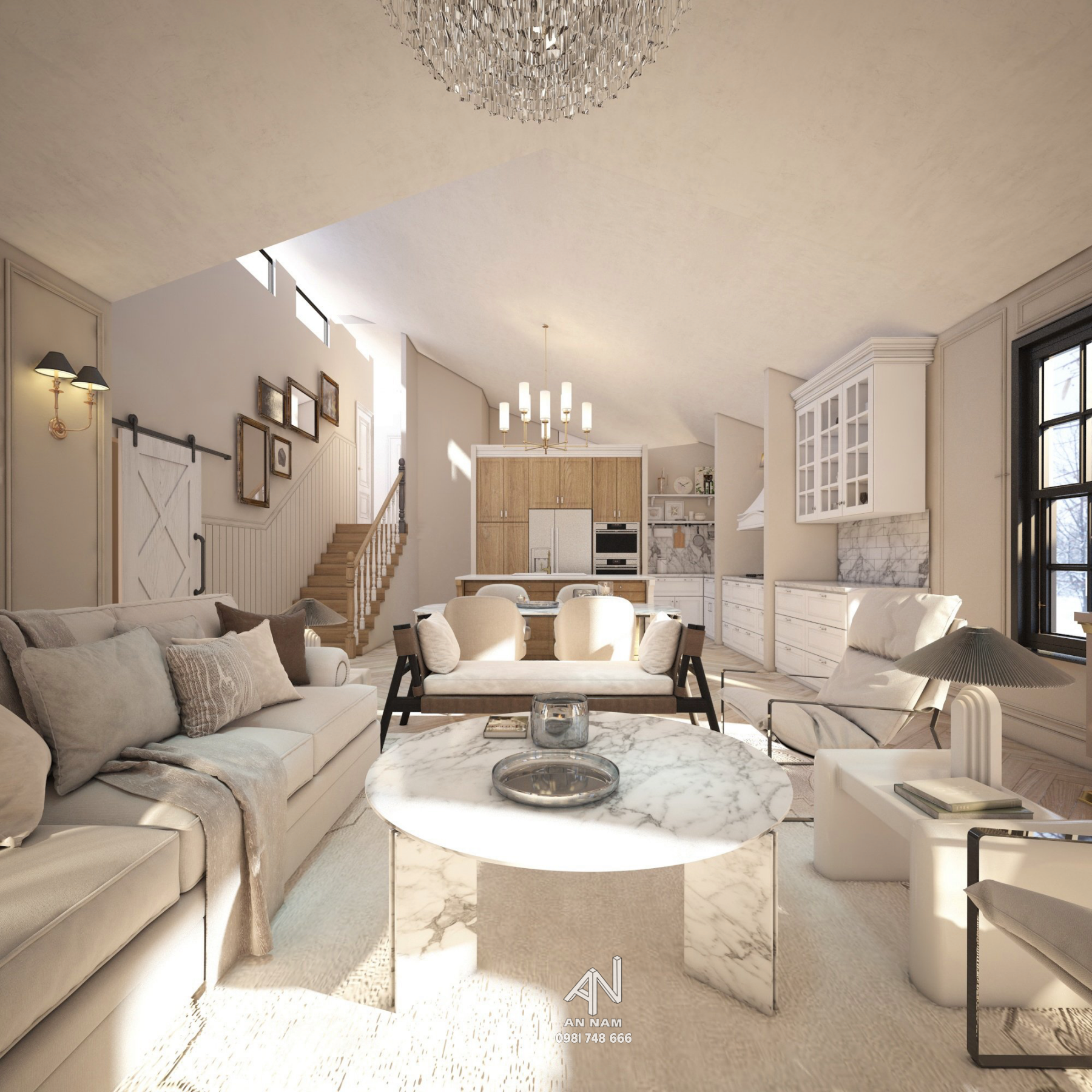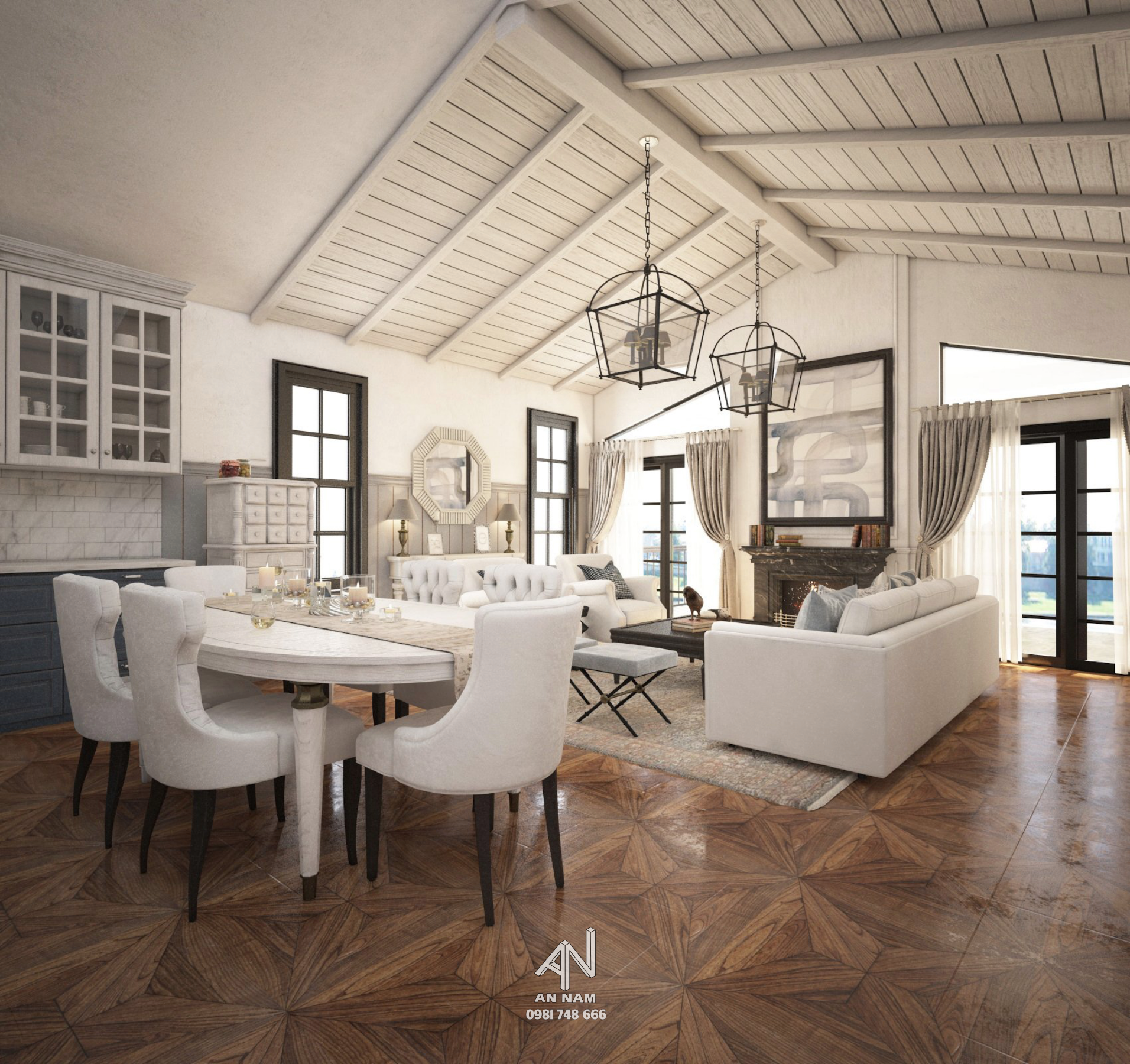 Một căn villa gam màu trắng chủ đạo trên chất liệu cổ điển phảng phất một chút farmhouse, tạo nên diện mạo mới vừa thanh lịch vượt thời gian, vừa đan xen đôi nét hoài niệm xưa cũ.