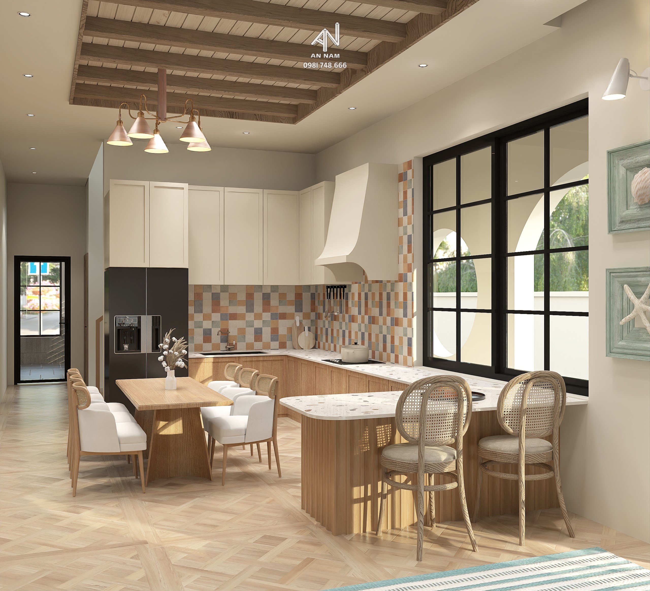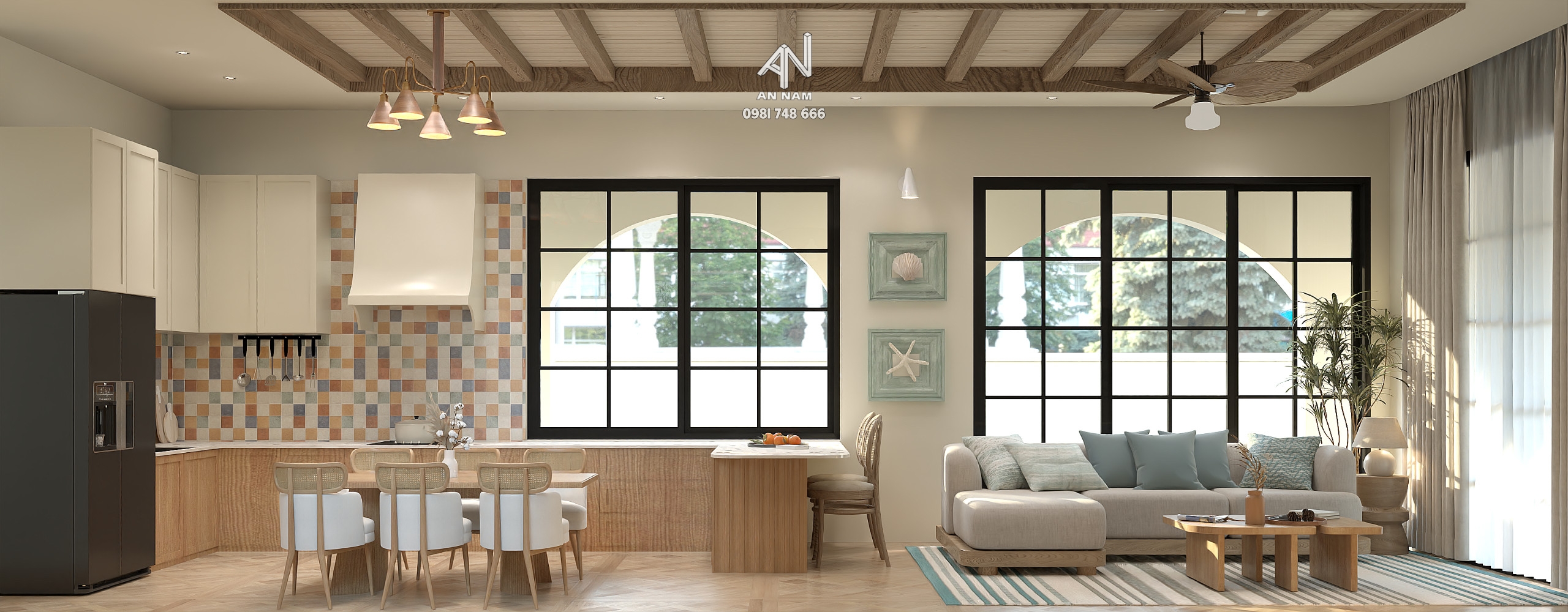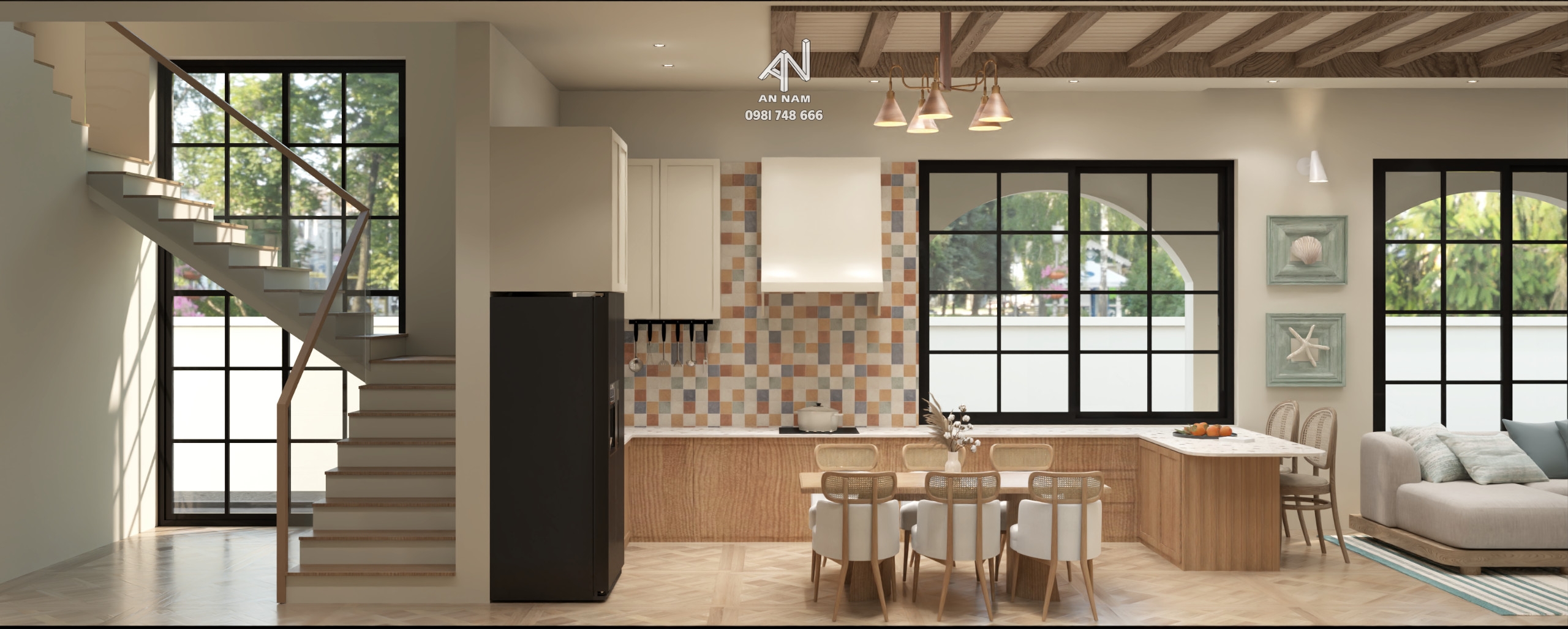Hòa quyện cùng kiến trúc Địa Trung Hải độc đáo ở mặt tiền, không gian nội thất bên trong mang đậm hơi thở hiện đại phóng khoáng, sử dụng gam màu gỗ ấm áp như ôm trọn tâm hồn vào từng góc nhà, mang đến cảm giác thư giãn.