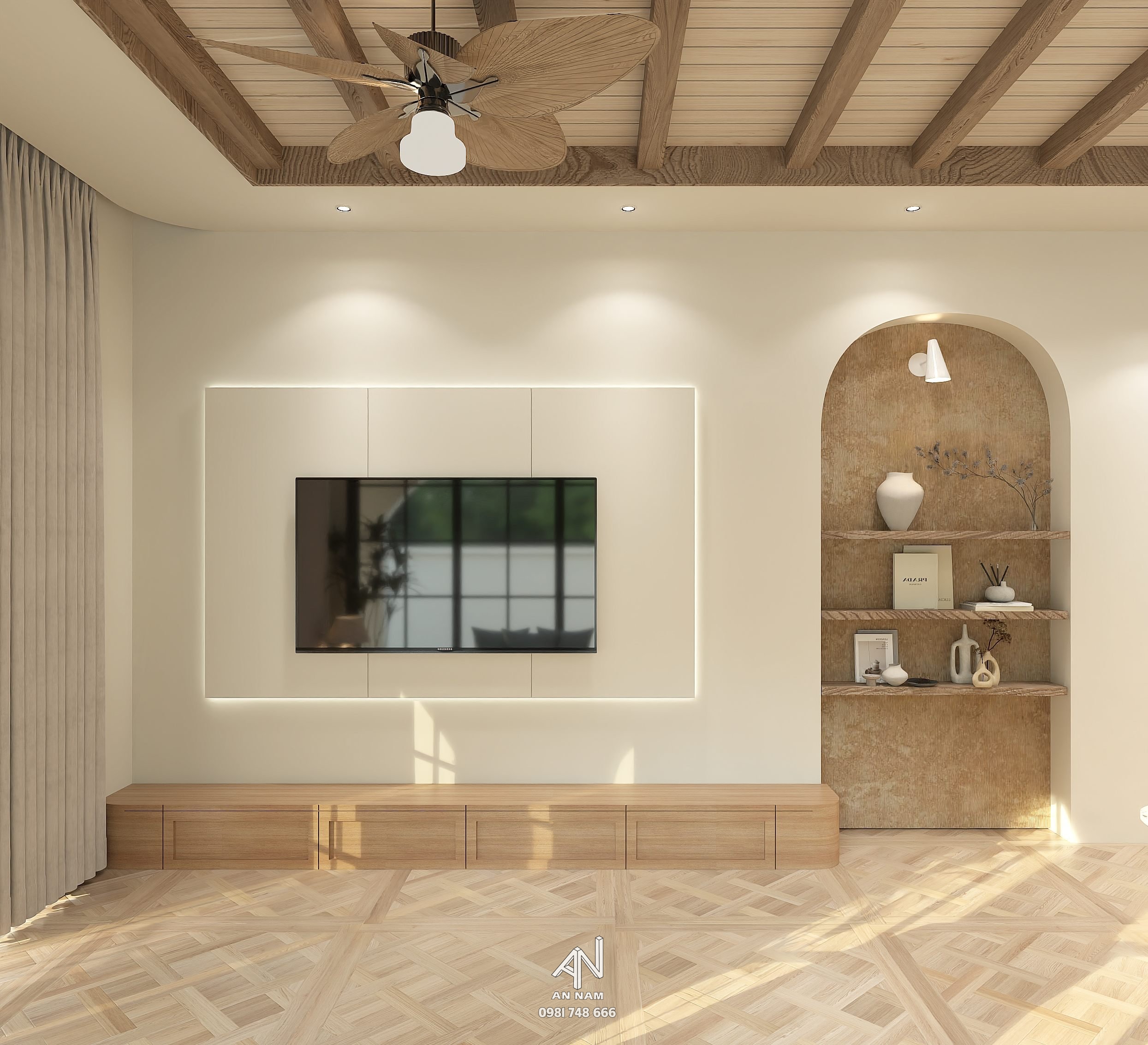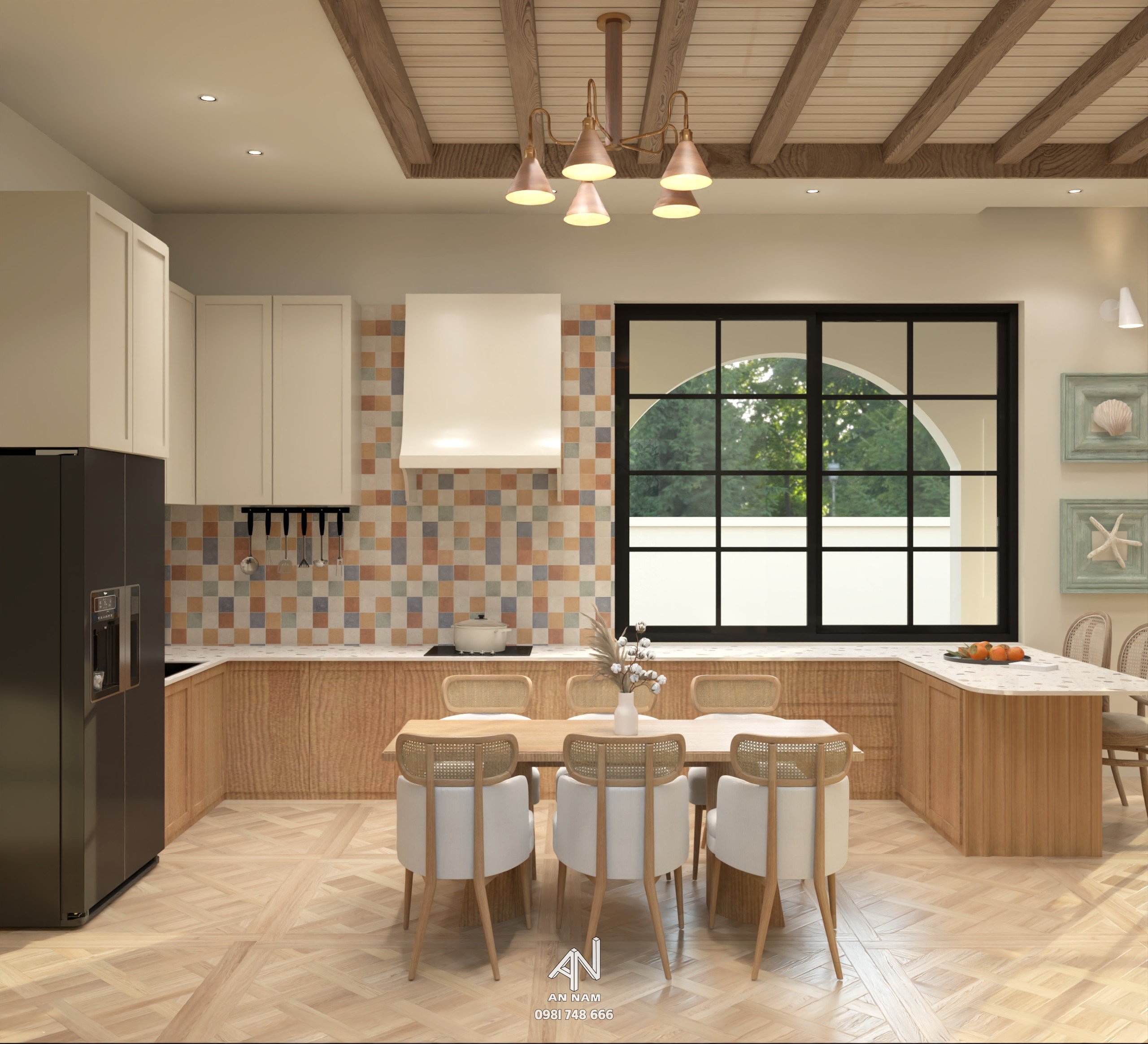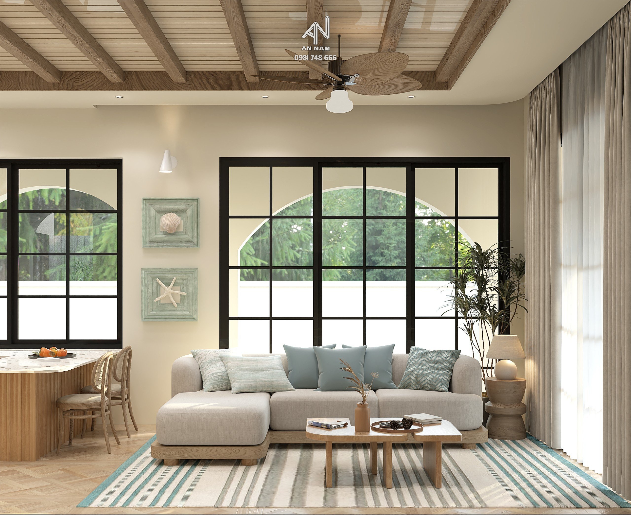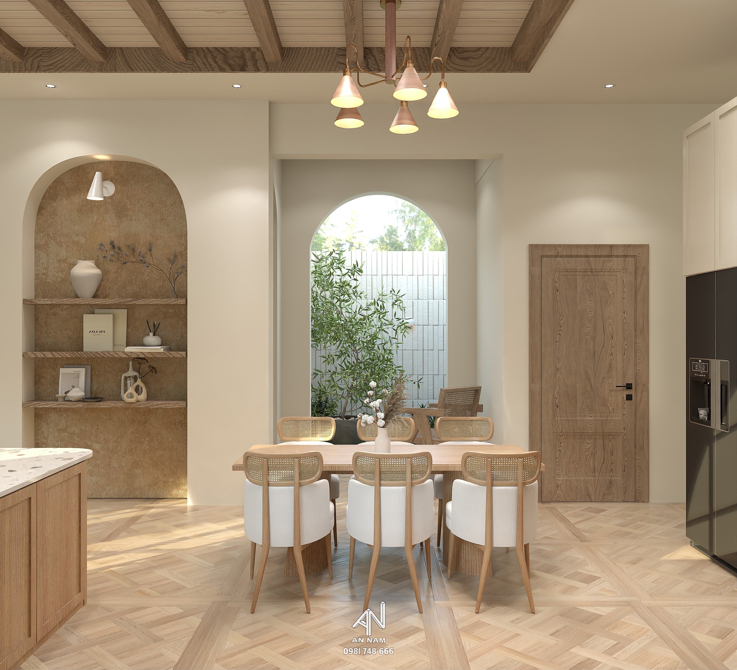 Hòa quyện cùng kiến trúc Địa Trung Hải độc đáo ở mặt tiền, không gian nội thất bên trong mang đậm hơi thở hiện đại phóng khoáng, sử dụng gam màu gỗ ấm áp như ôm trọn tâm hồn vào từng góc nhà, mang đến cảm giác thư giãn.
