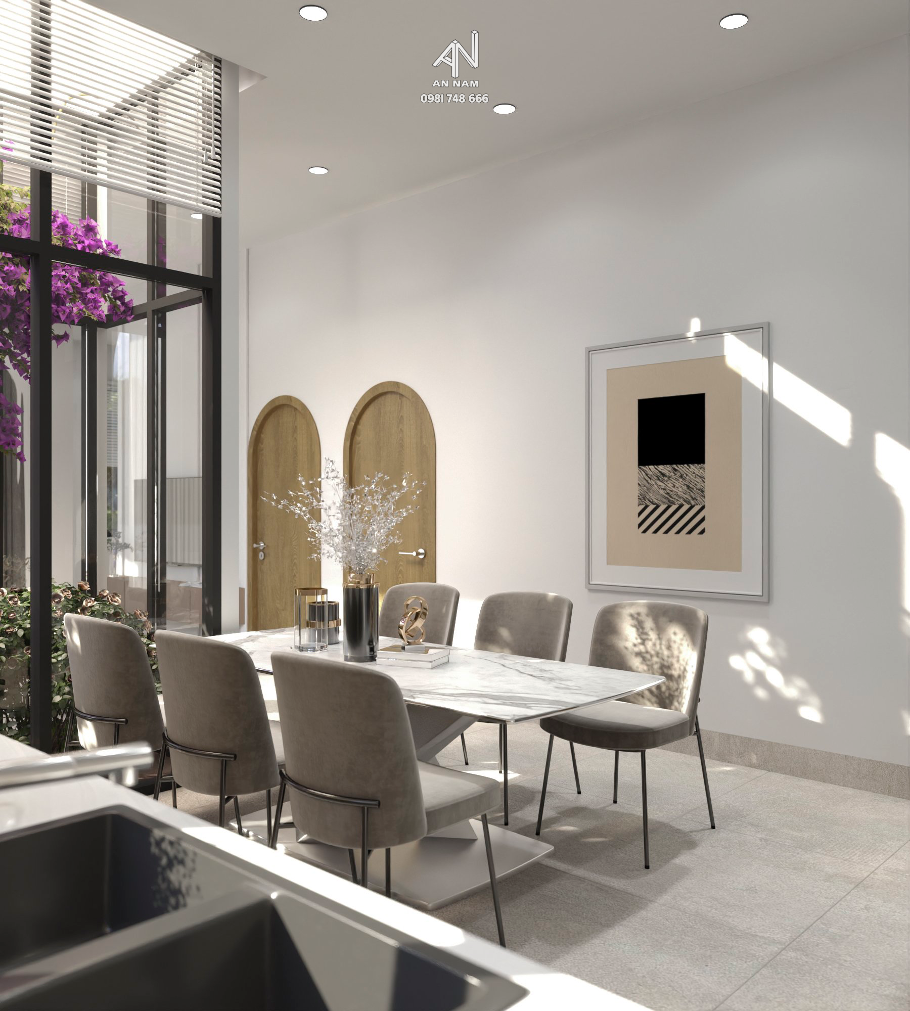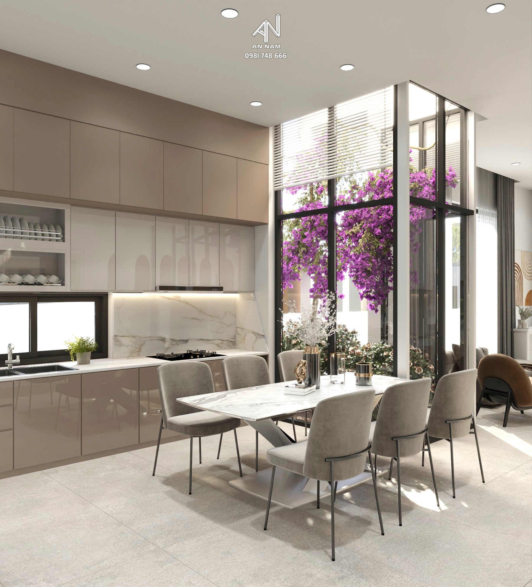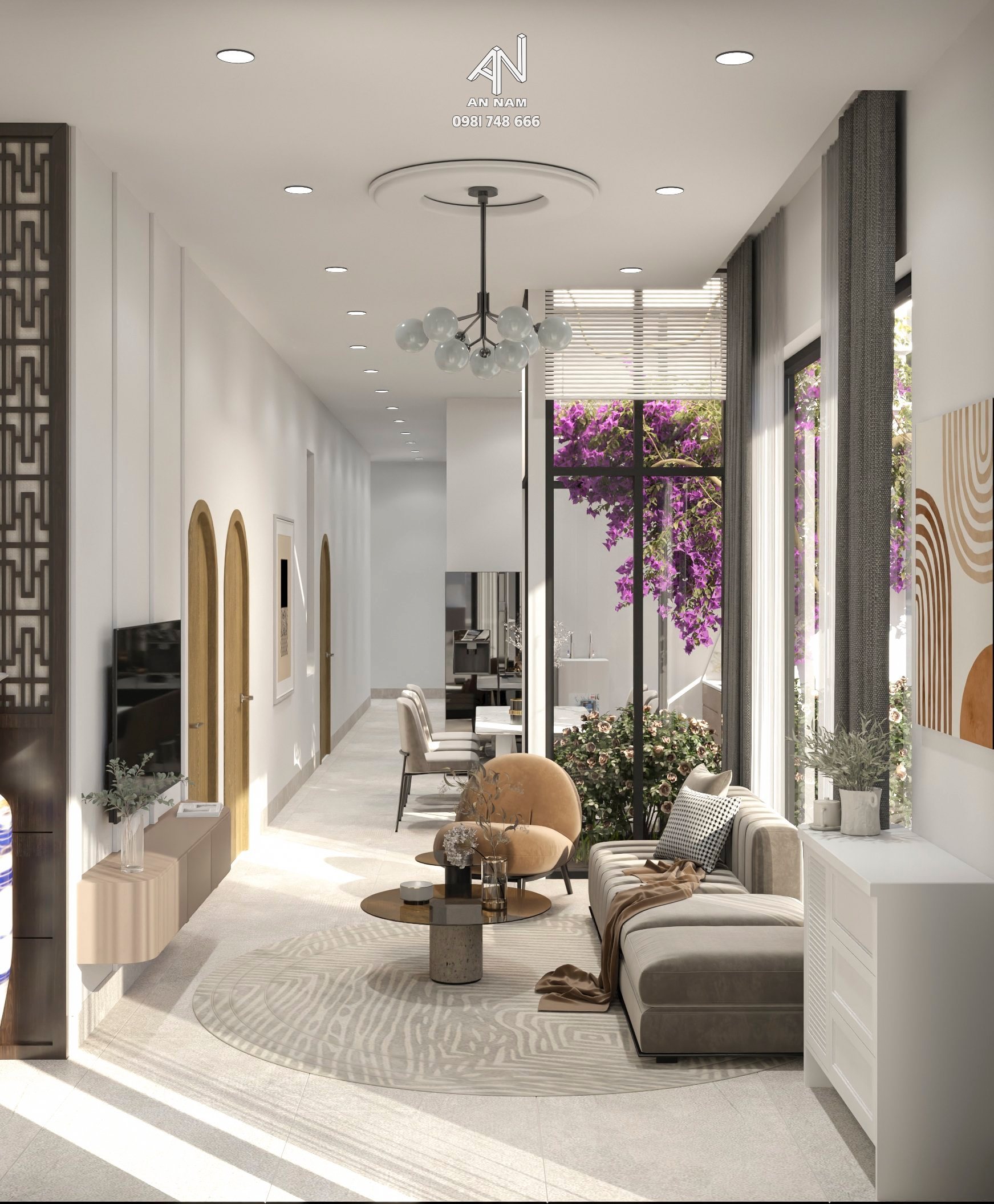 Với hai giếng trời được thiết kế khéo léo, không chỉ mang lại ánh sáng tự nhiên cho ngôi nhà mà còn tạo điều kiện lý tưởng cho việc trồng cây xanh mát. Các cửa sổ và vách kính được bố trí một cách thông minh để tối đa hóa việc lấy ánh sáng, tạo ra một môi trường sống thoáng đãng.