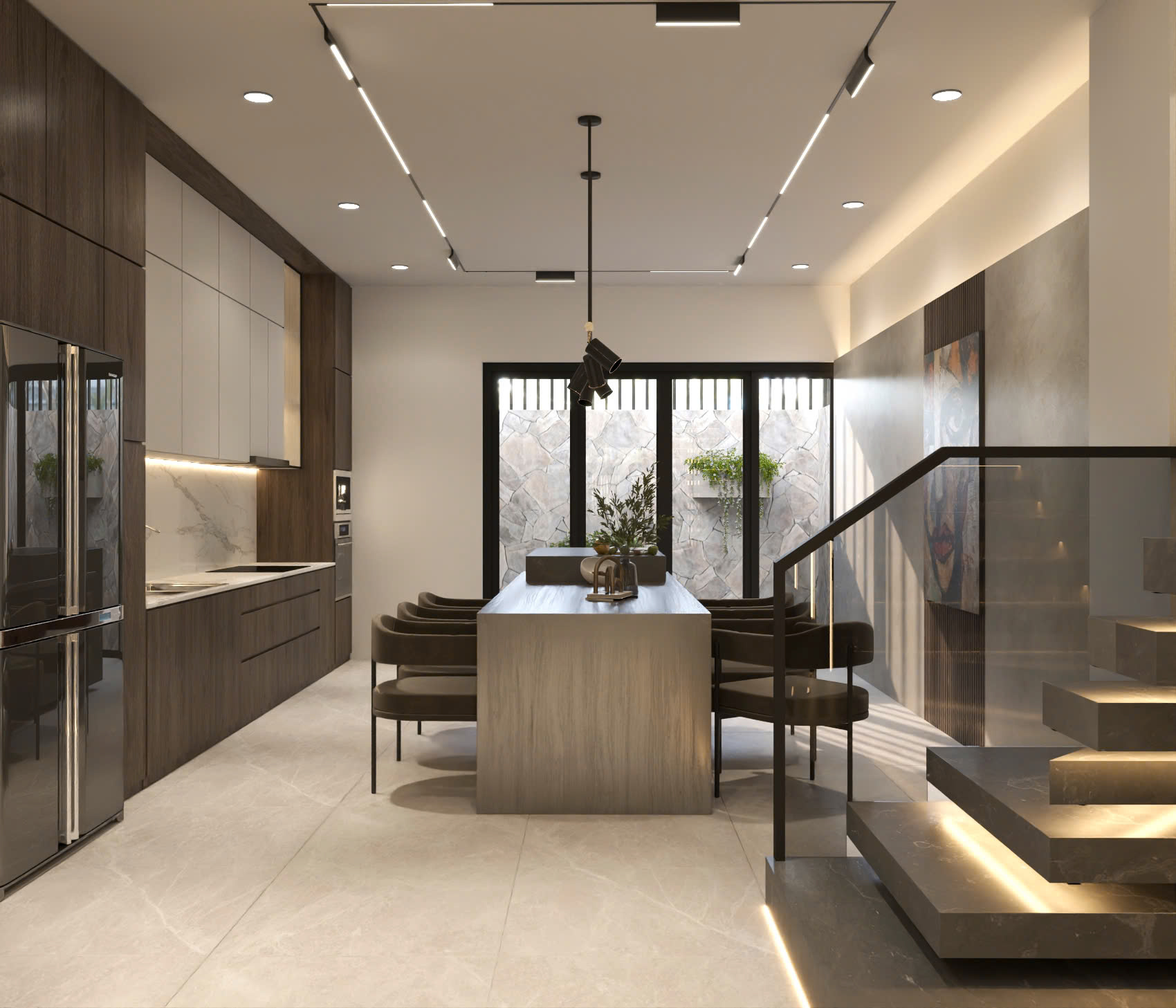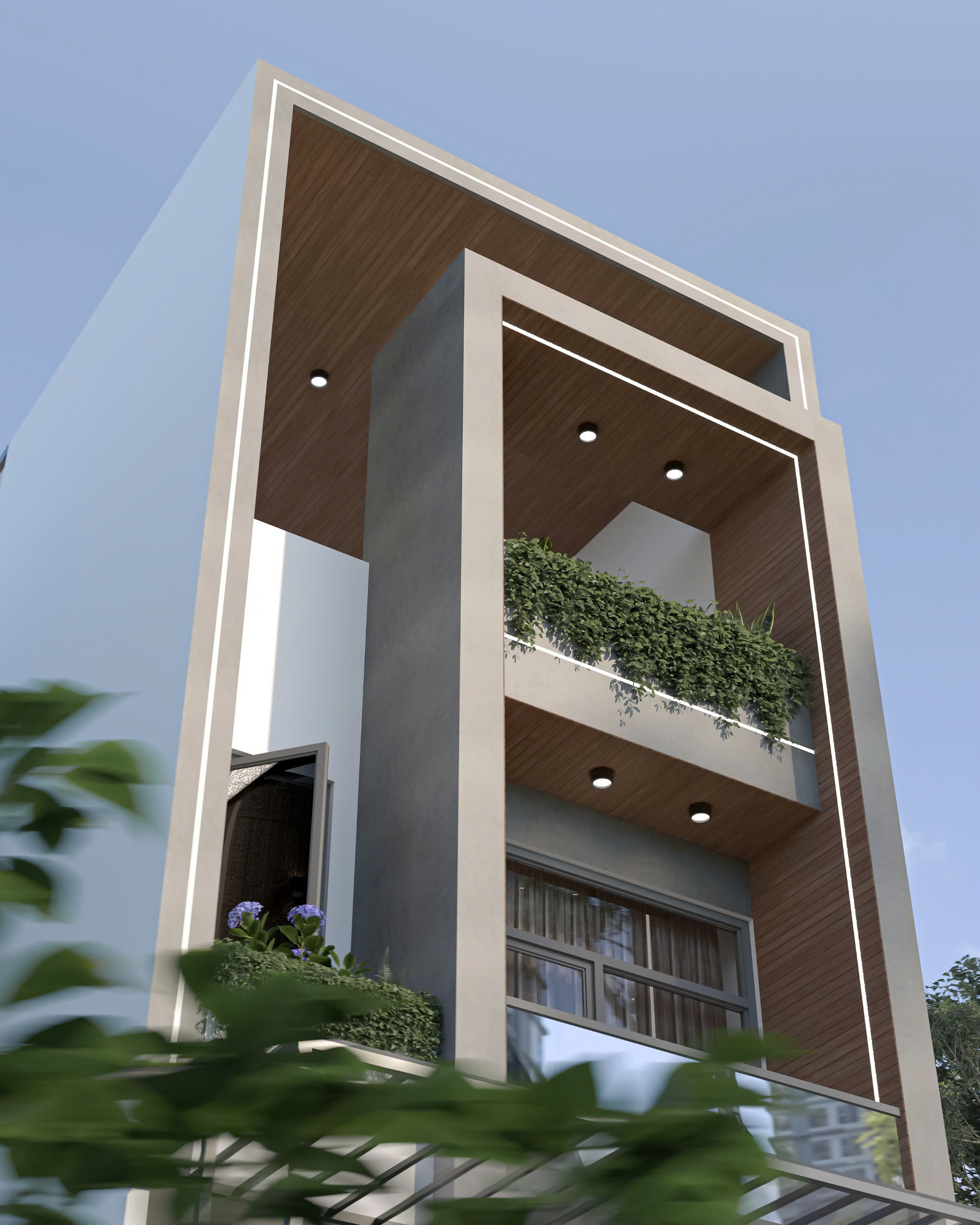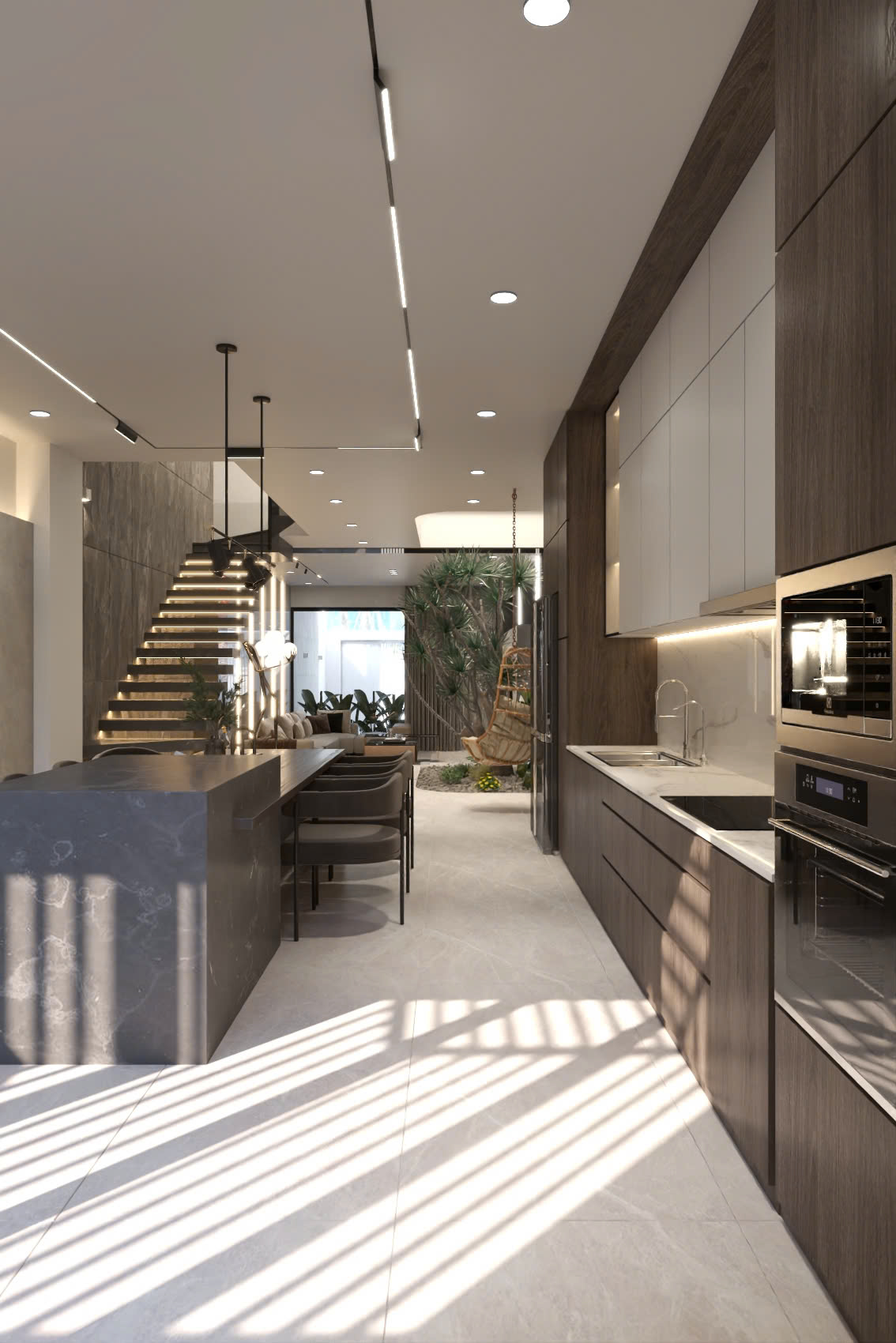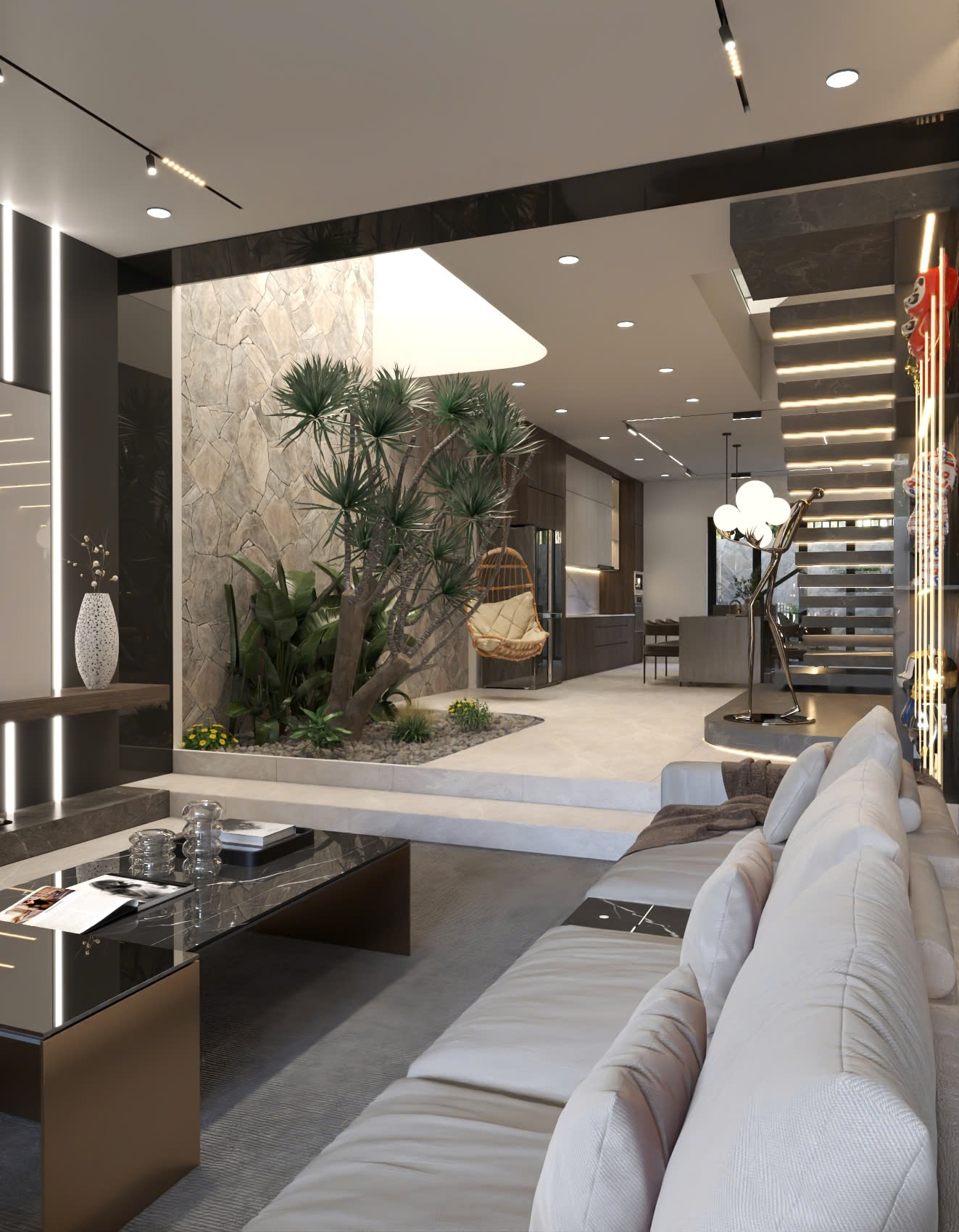 Sự kết hợp giữa giếng trời, cây xanh và cầu thang bay không chỉ mang lại sự thông thoáng mà còn tạo nên một trải nghiệm thị giác ấn tượng, kết nối con người với thiên nhiên ngay trong chính ngôi nhà của mình.