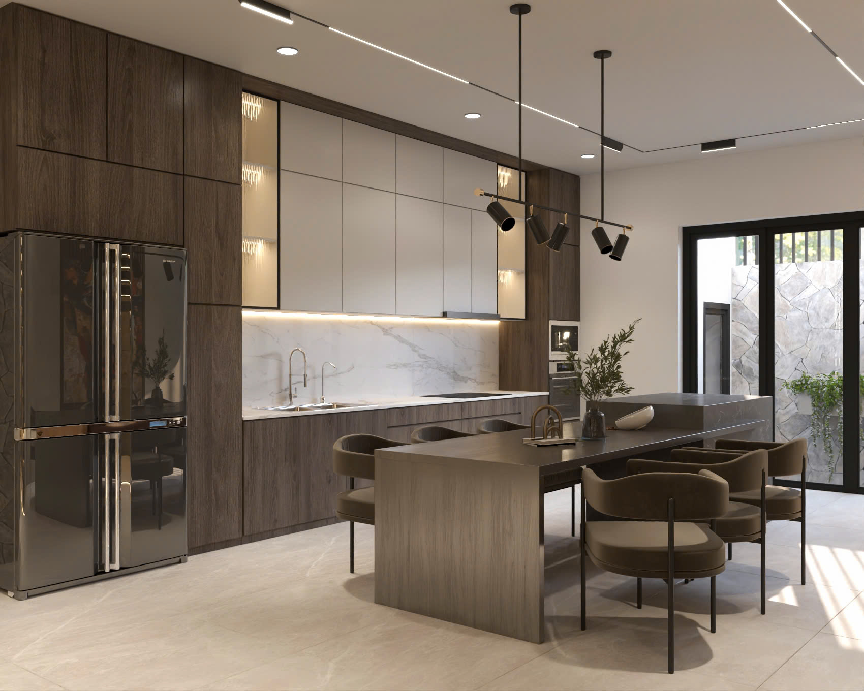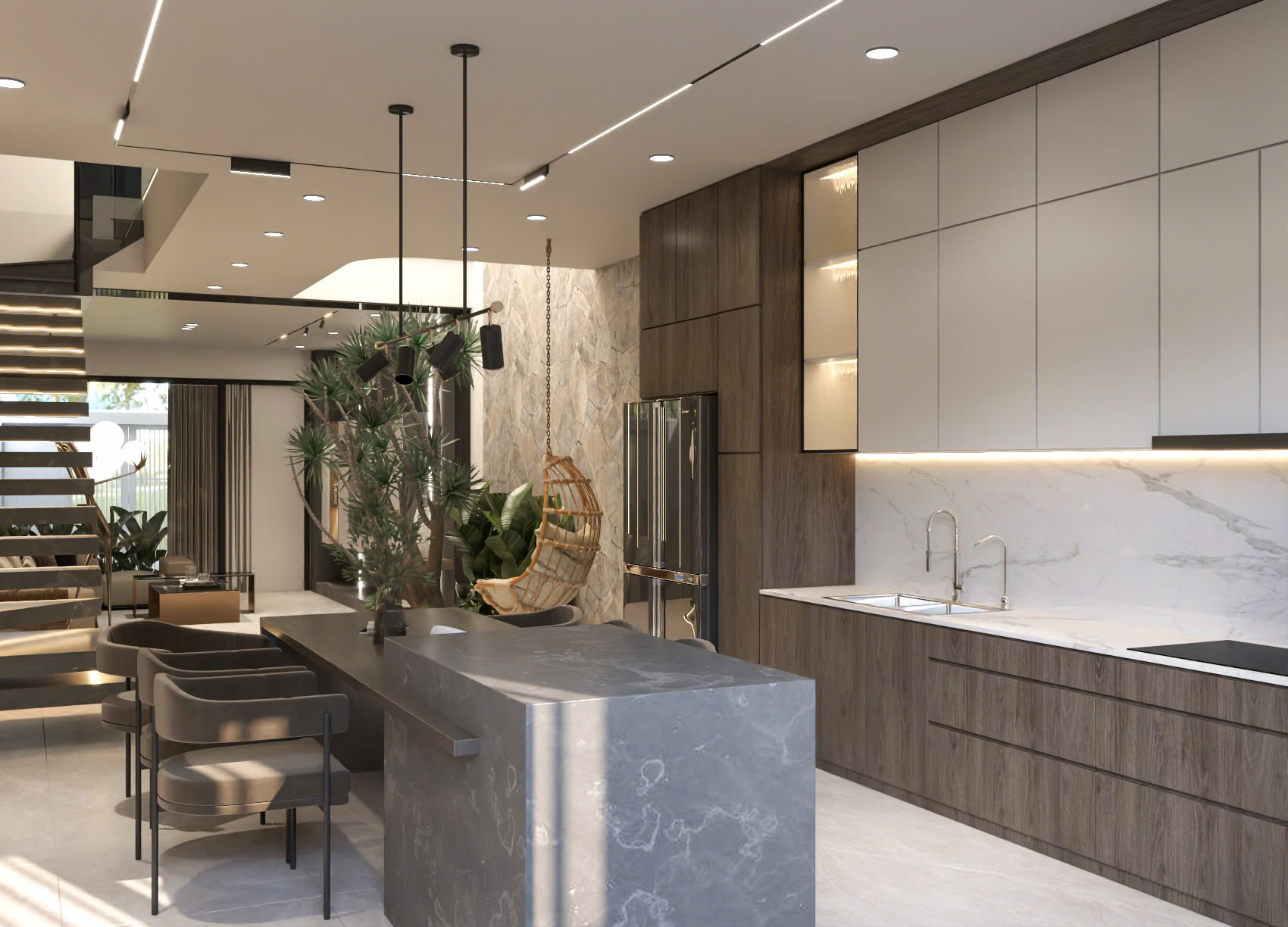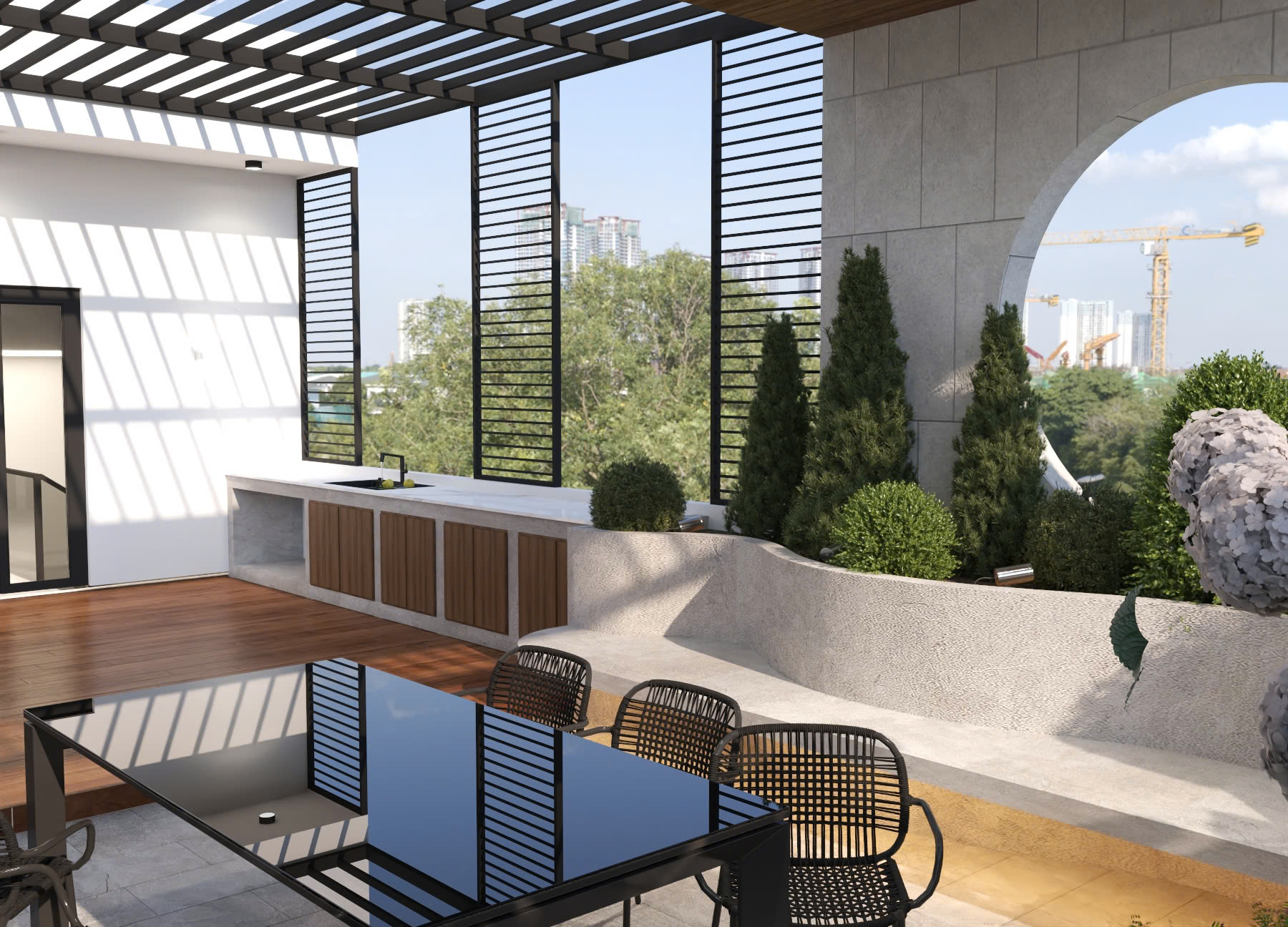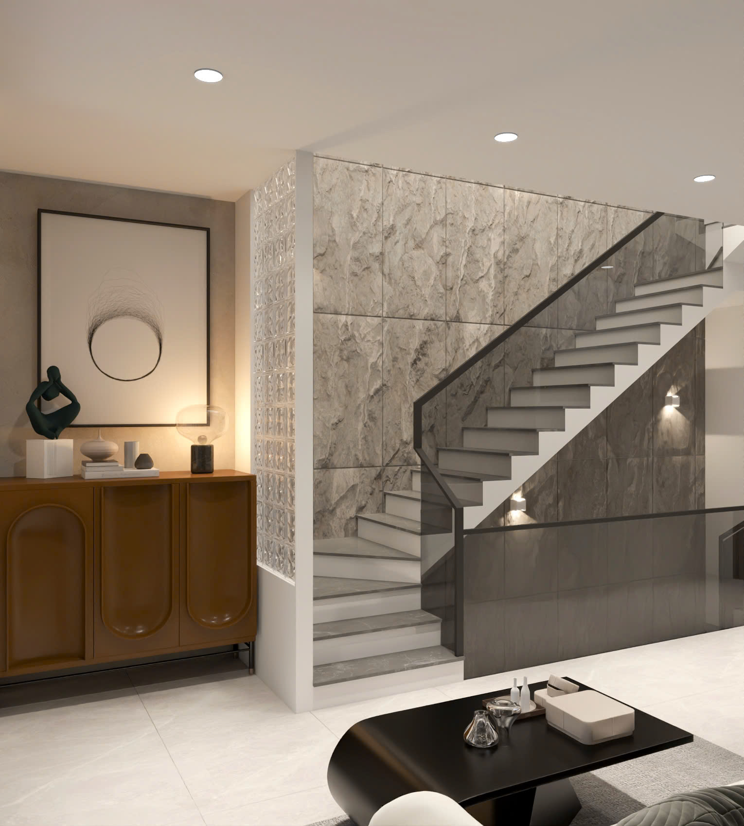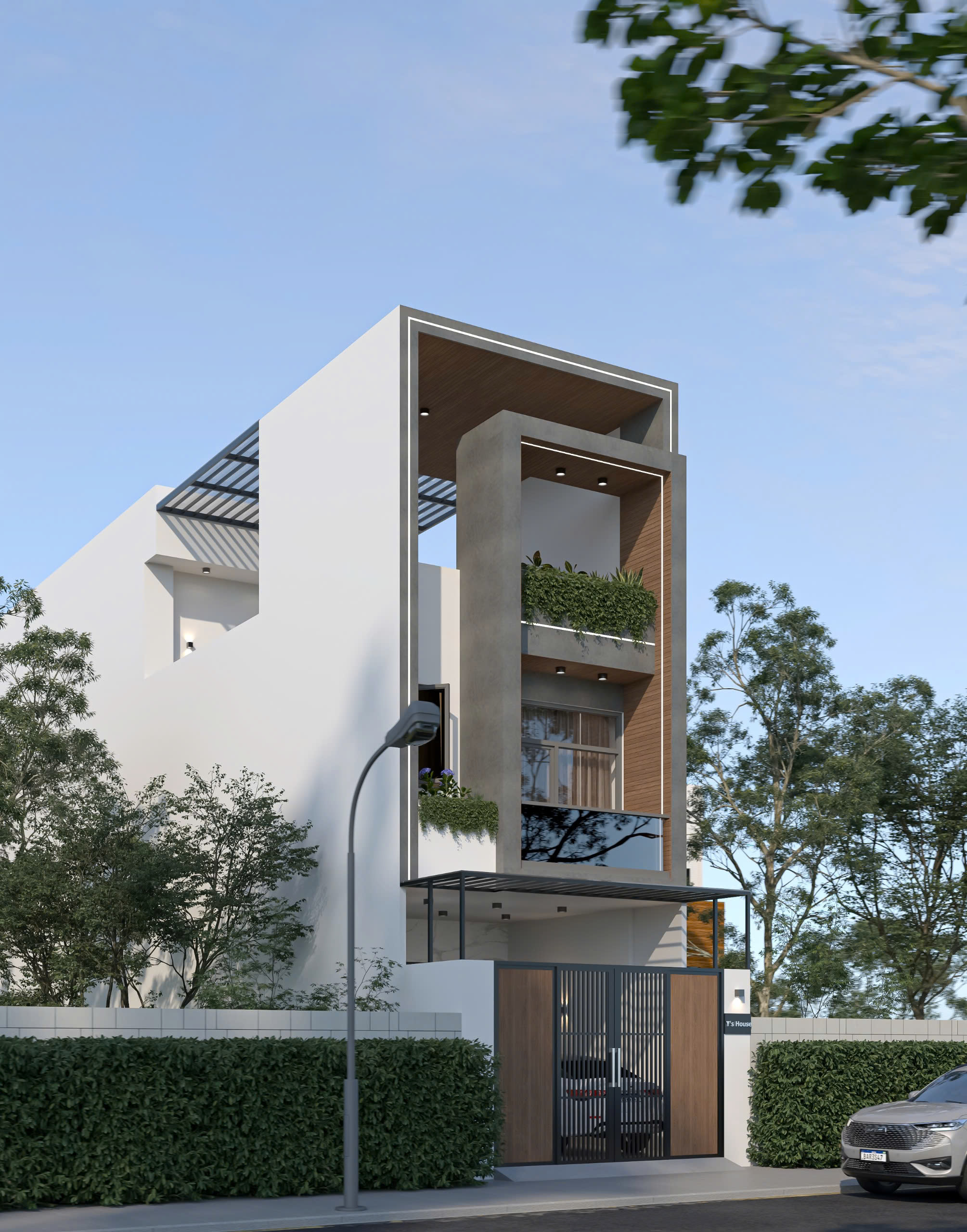 Sự kết hợp giữa giếng trời, cây xanh và cầu thang bay không chỉ mang lại sự thông thoáng mà còn tạo nên một trải nghiệm thị giác ấn tượng, kết nối con người với thiên nhiên ngay trong chính ngôi nhà của mình.