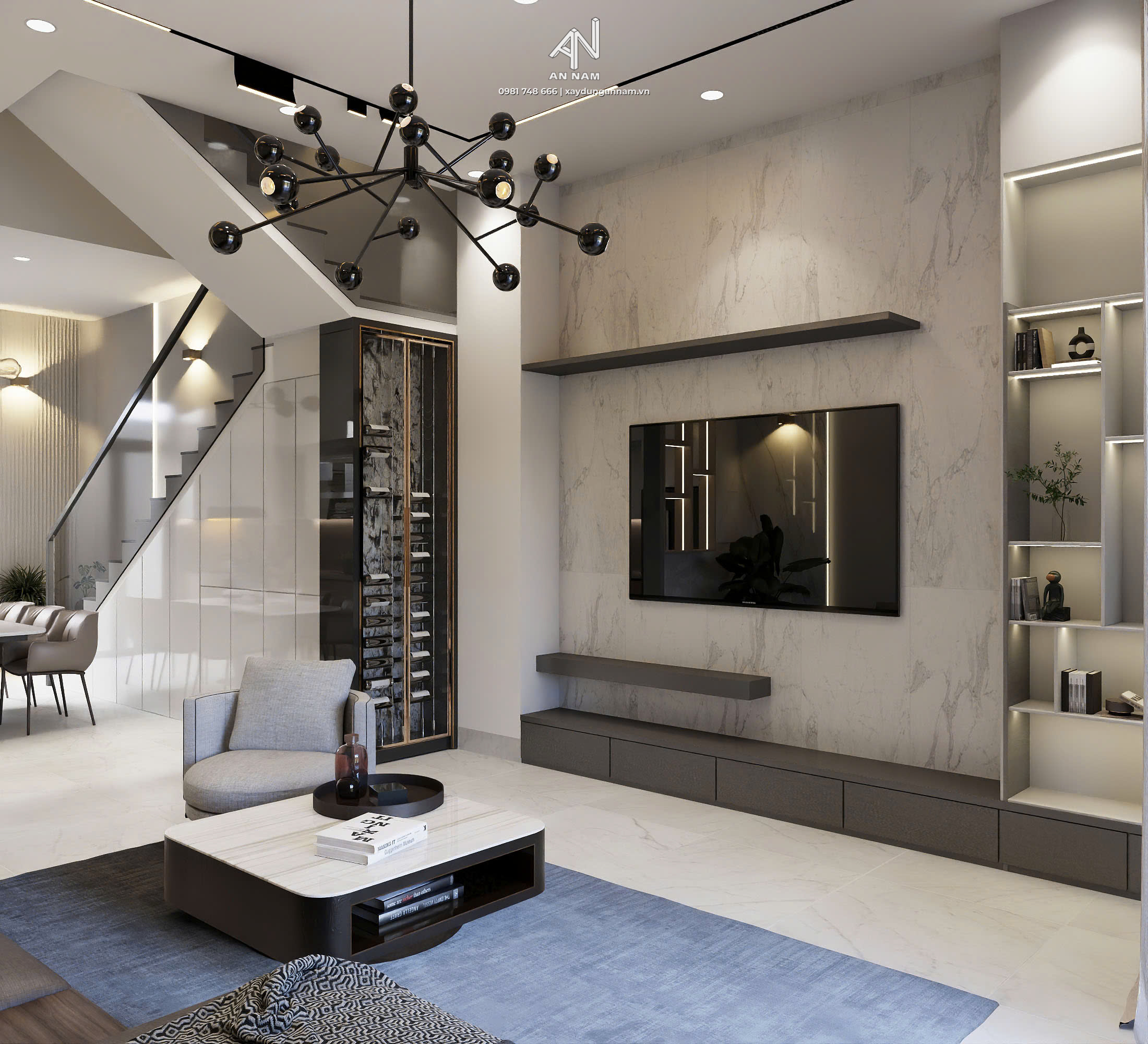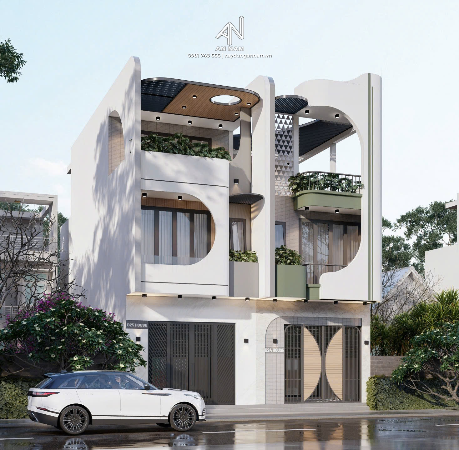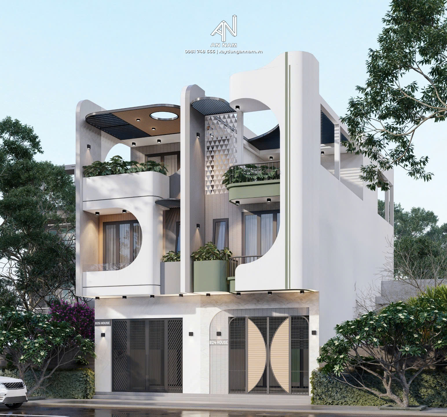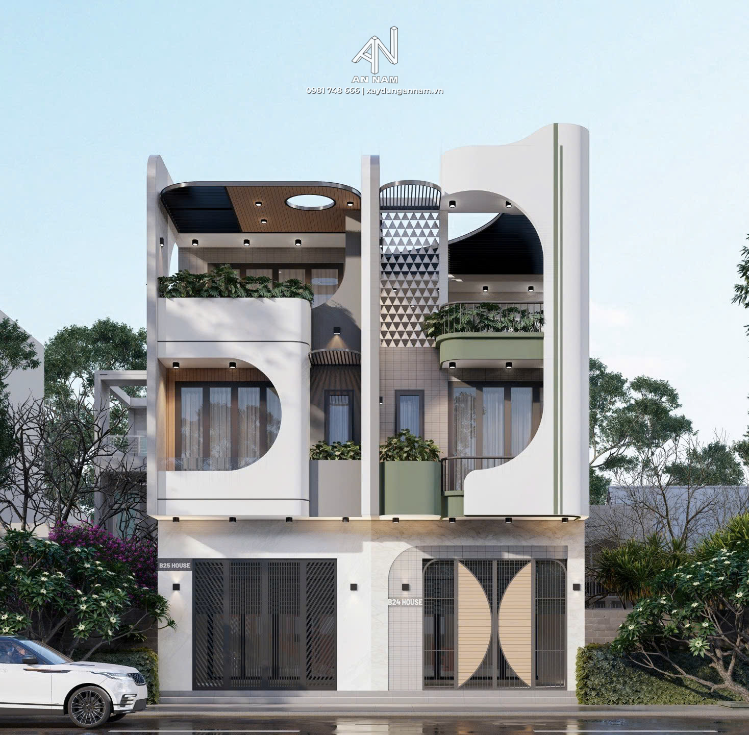 2 khối nhà sử dụng nhiều đường cong mềm mại tạo cảm giác uyển chuyển, khác biệt so với các thiết kế nhà ở truyền thống. Sự tương phản giữa màu trắng và màu xanh không chỉ tạo điểm nhấn thị giác mà còn mang đến mặt tiền nổi bật sự trẻ trung, năng động