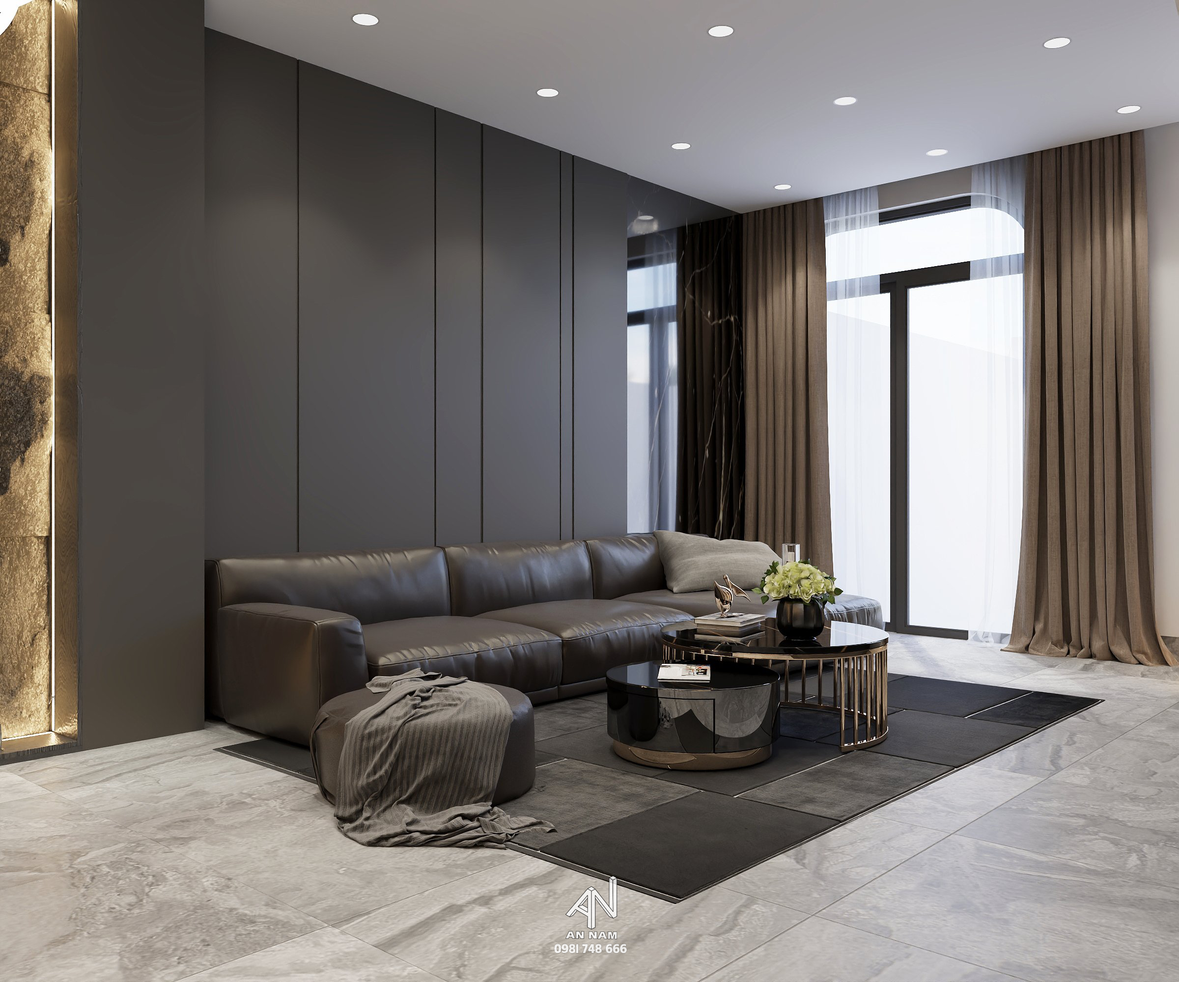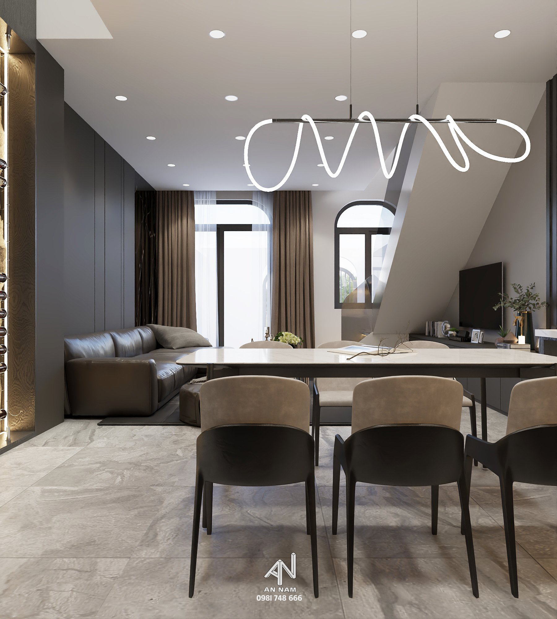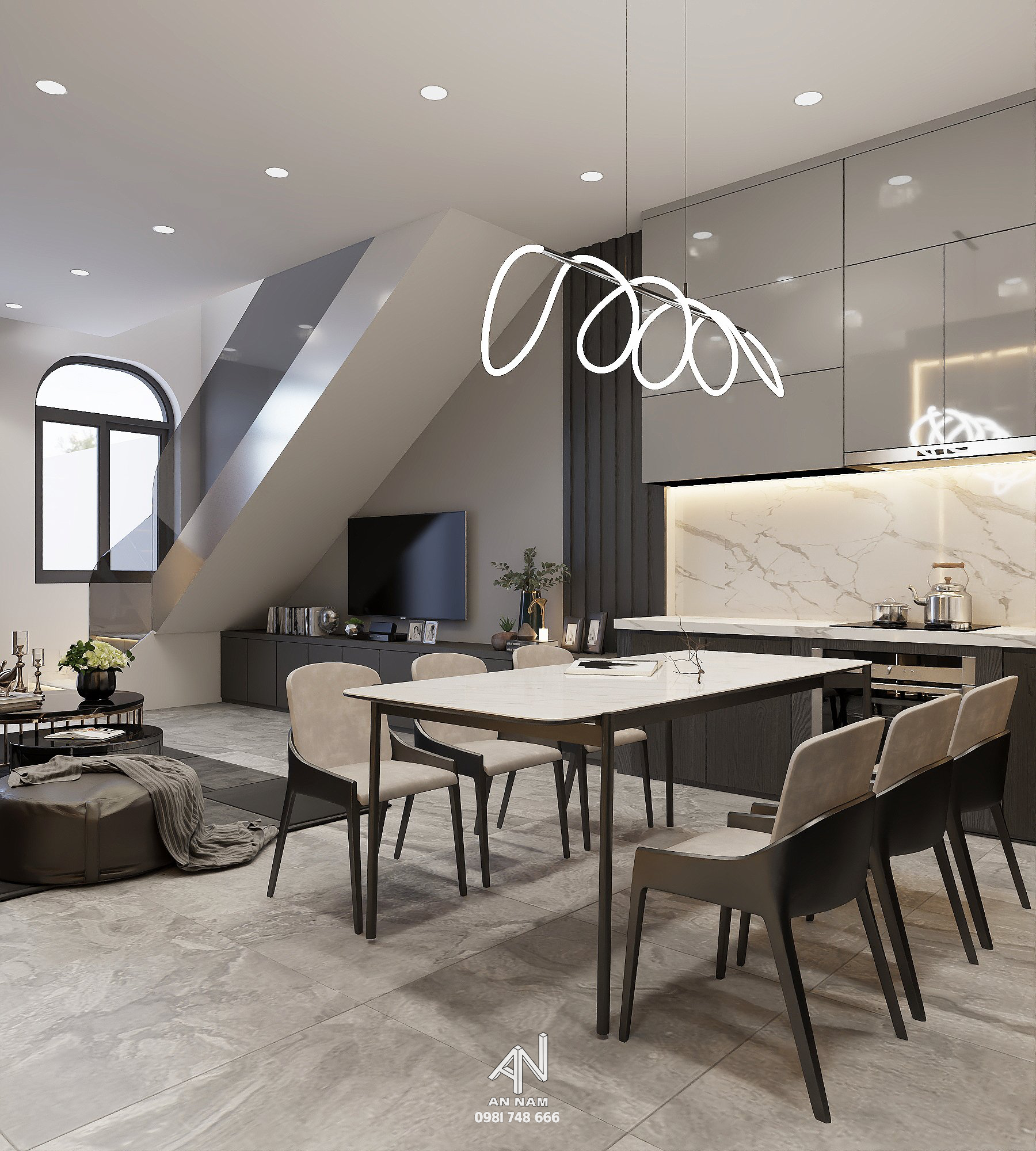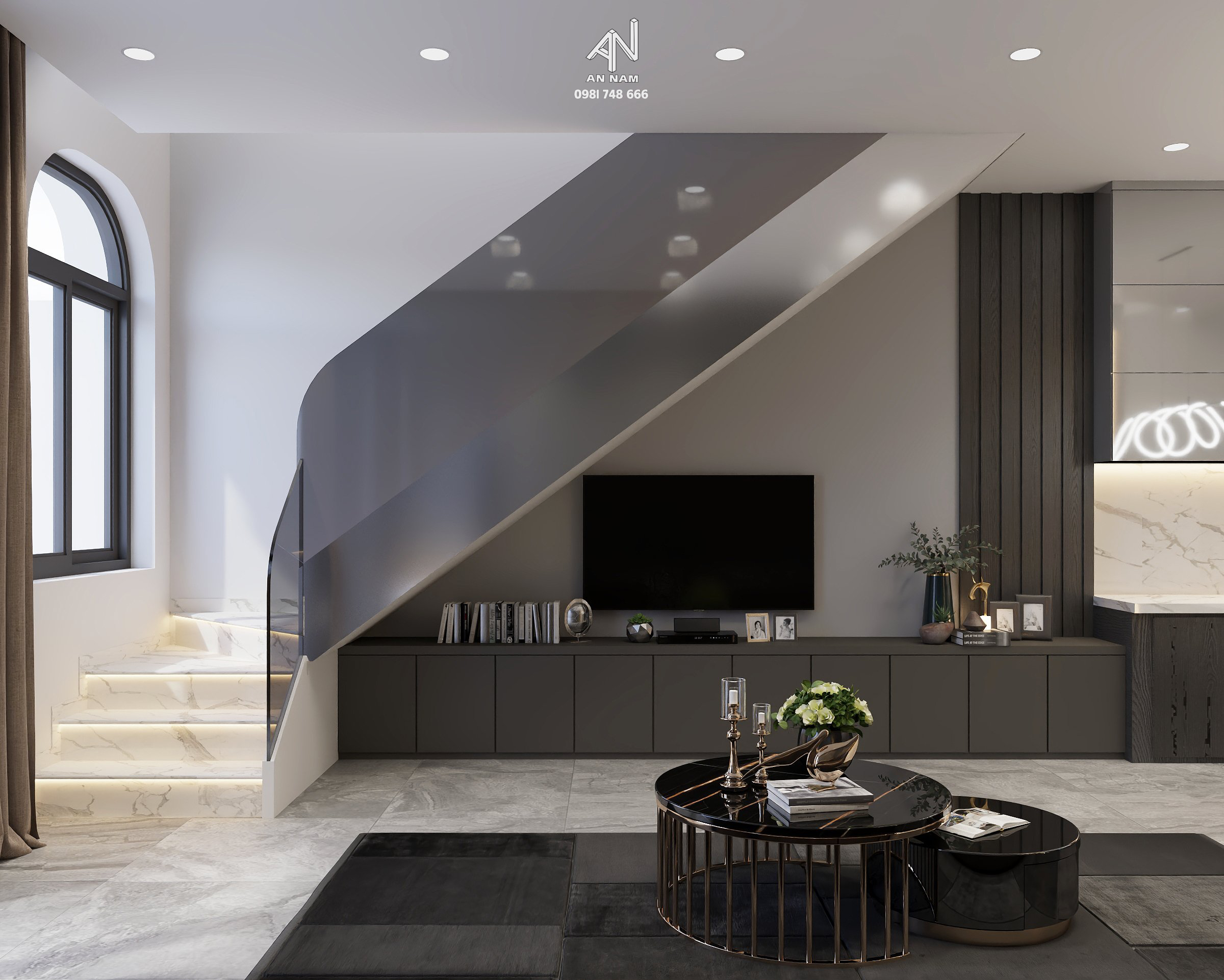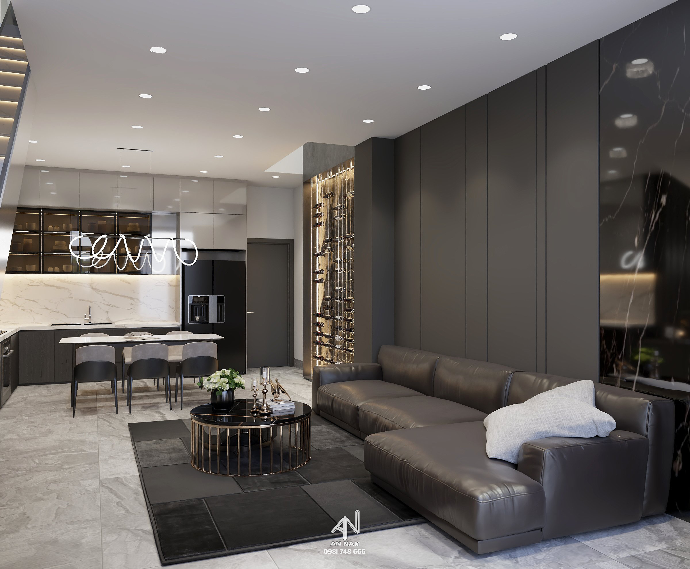 Điểm nhấn của nội thất chính là phần cầu thang, với tay vịn được làm từ cường lực màu đen khói, tạo nên sự sang trọng và đồng thời đảm bảo tính thẩm mỹ. Đèn led được bố trí tinh tế tại các bậc cầu thang không chỉ làm tôn lên vẻ đẹp của không gian mà còn tạo ra ánh sáng mềm mại, tạo điểm nhấn cho không gian.