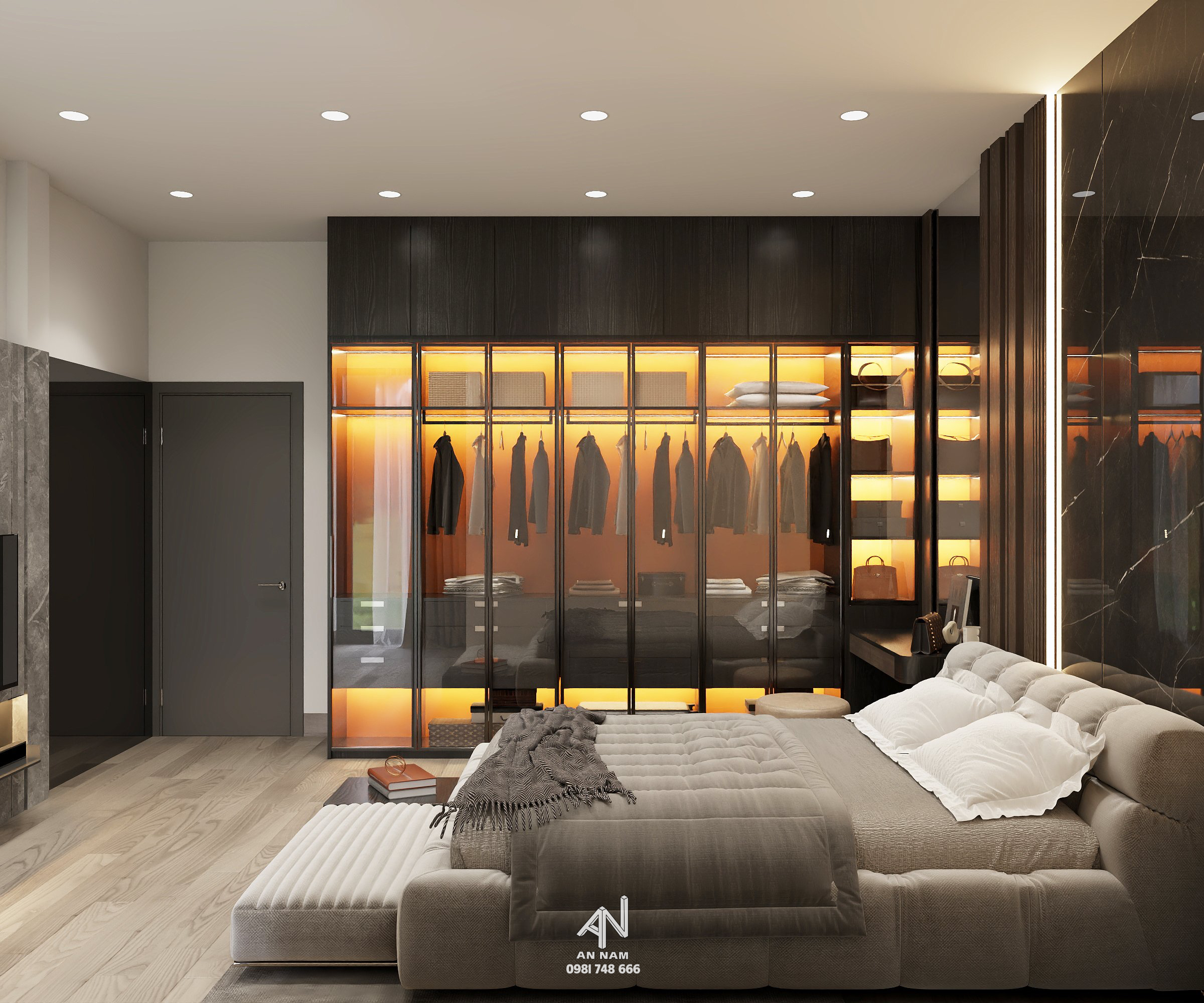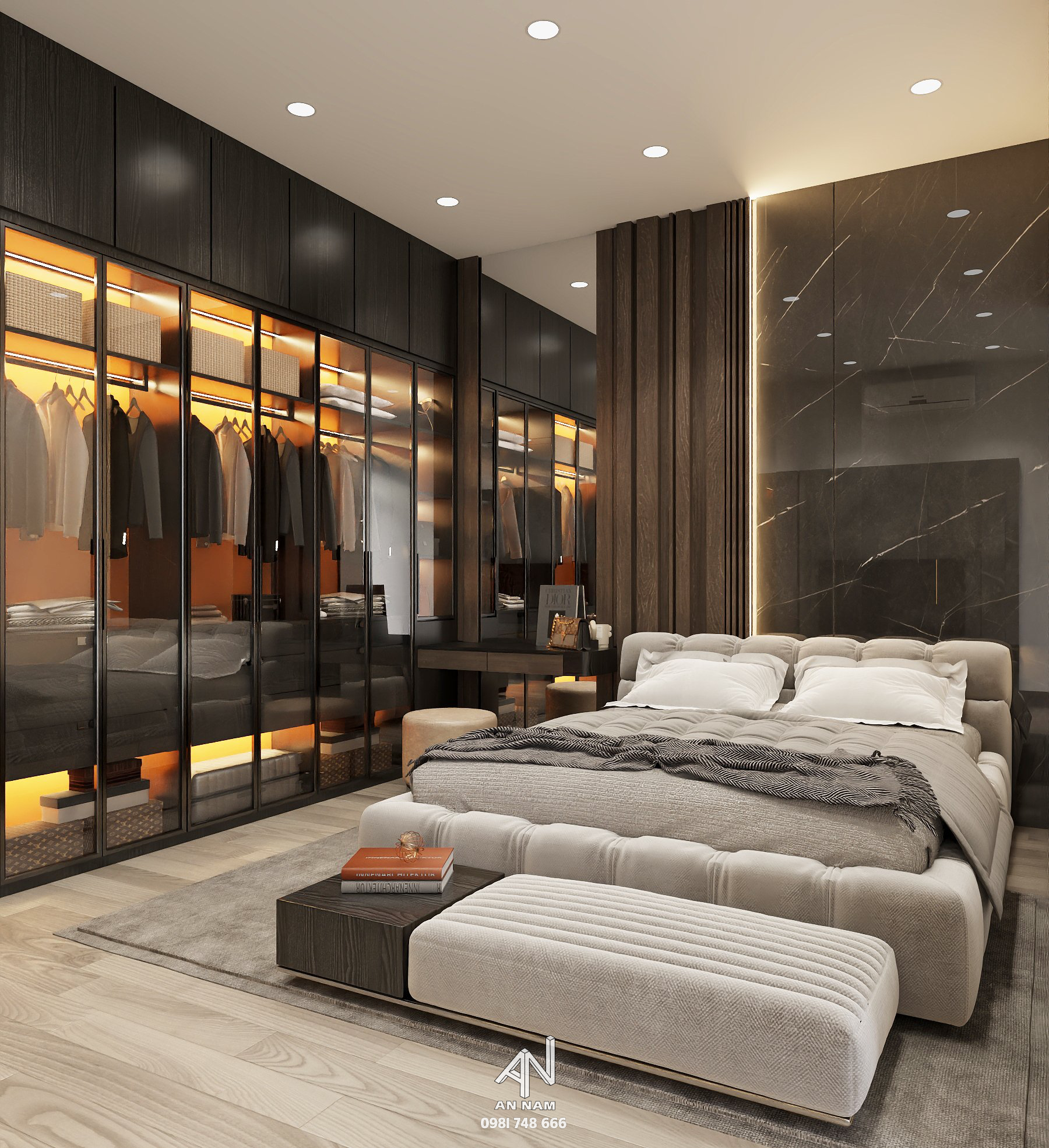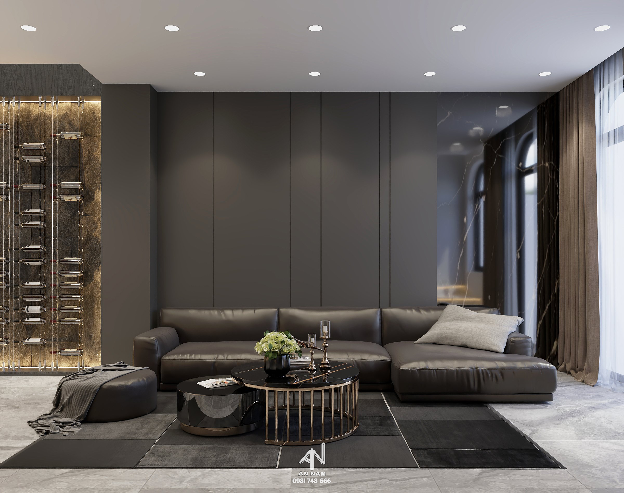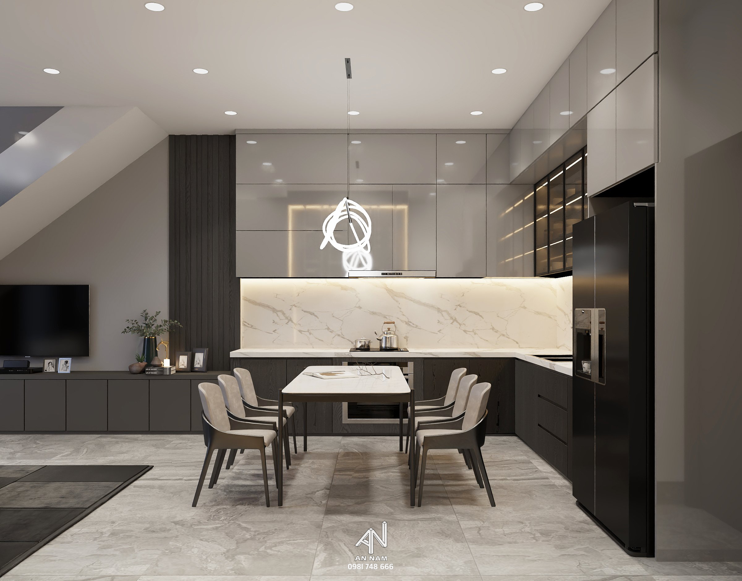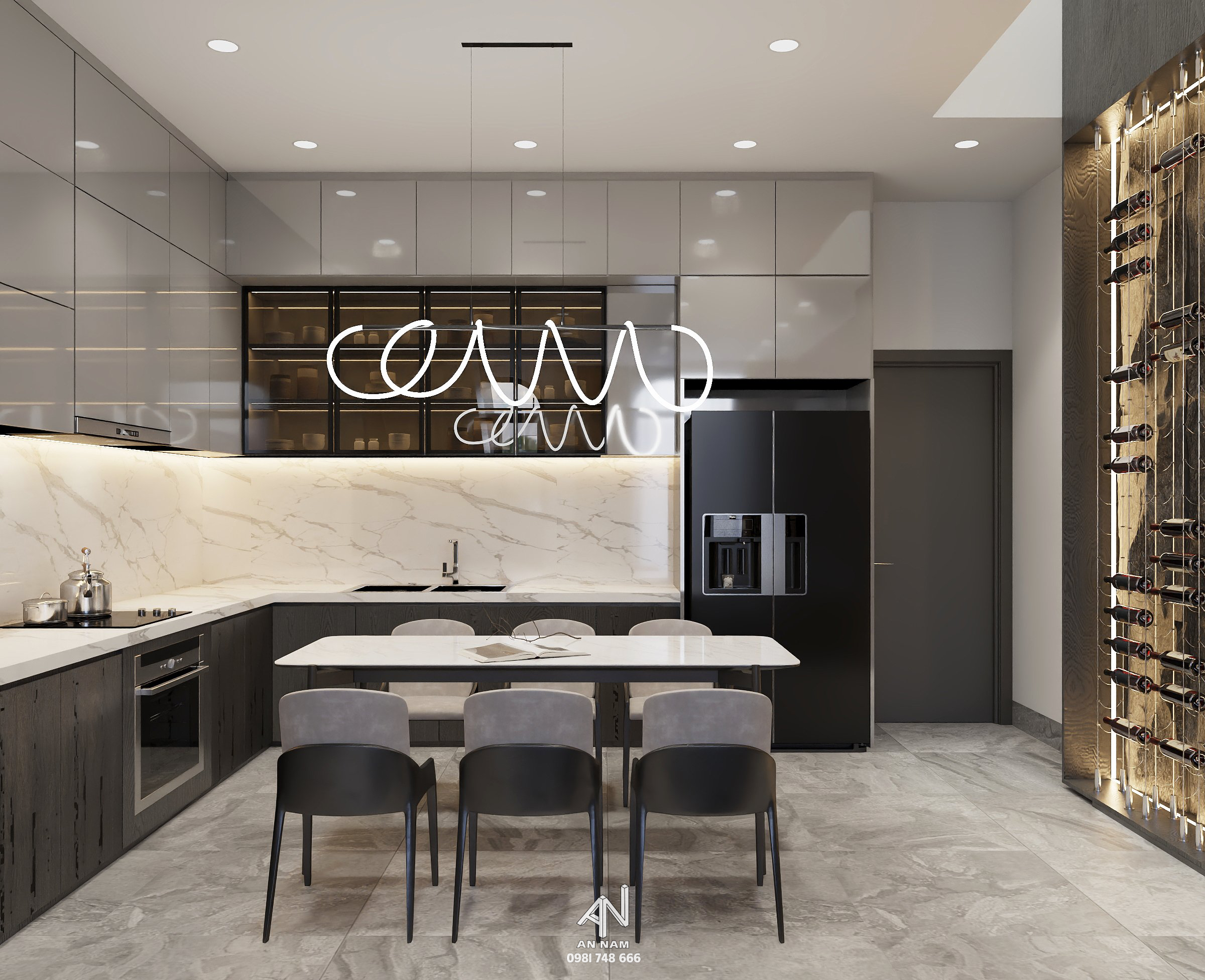 Điểm nhấn của nội thất chính là phần cầu thang, với tay vịn được làm từ cường lực màu đen khói, tạo nên sự sang trọng và đồng thời đảm bảo tính thẩm mỹ. Đèn led được bố trí tinh tế tại các bậc cầu thang không chỉ làm tôn lên vẻ đẹp của không gian mà còn tạo ra ánh sáng mềm mại, tạo điểm nhấn cho không gian.