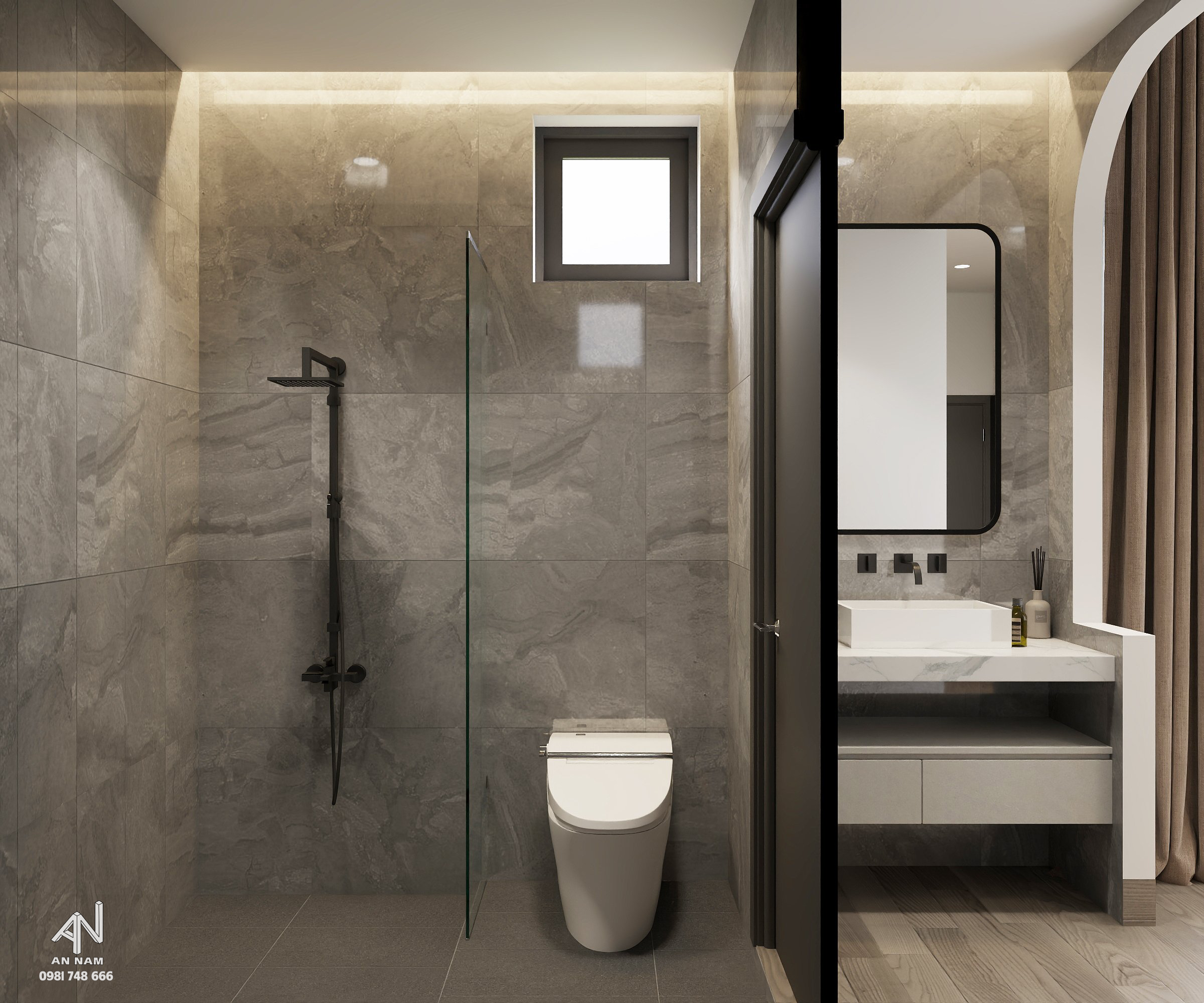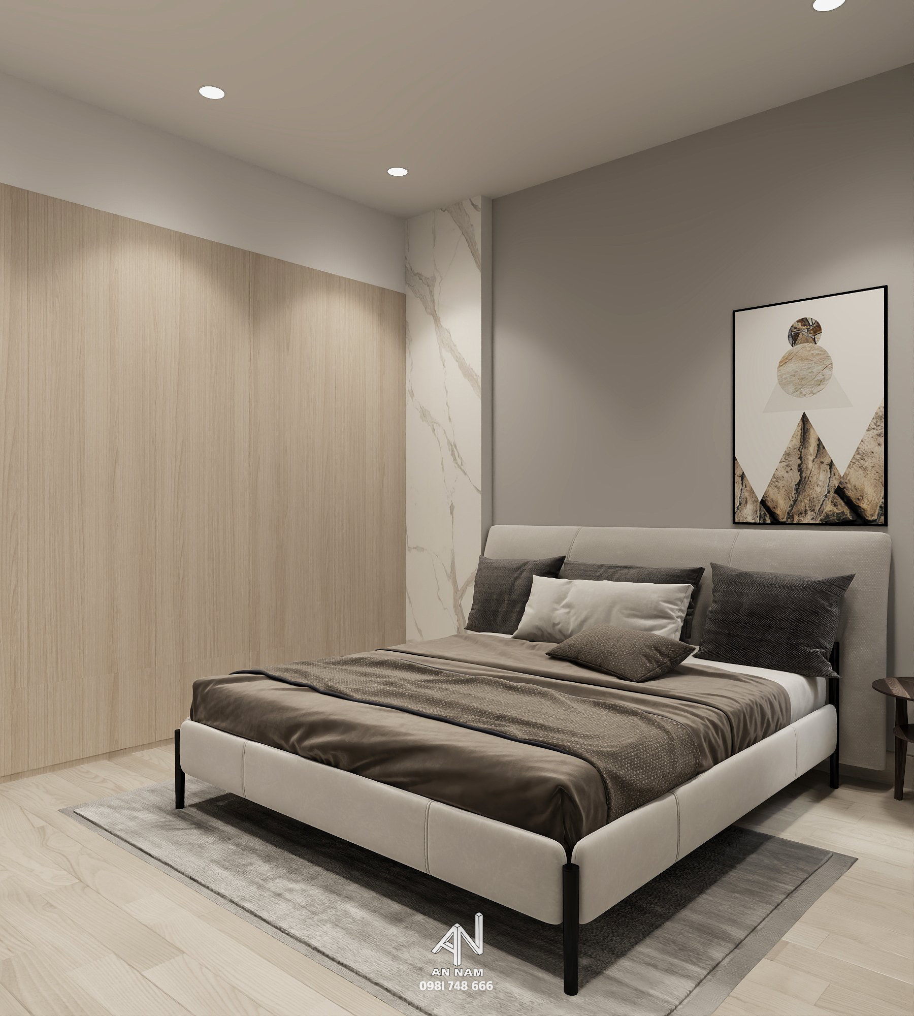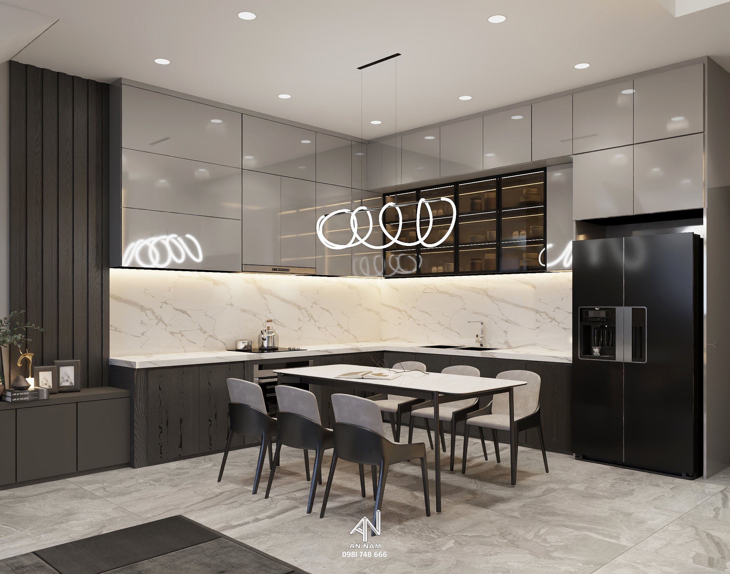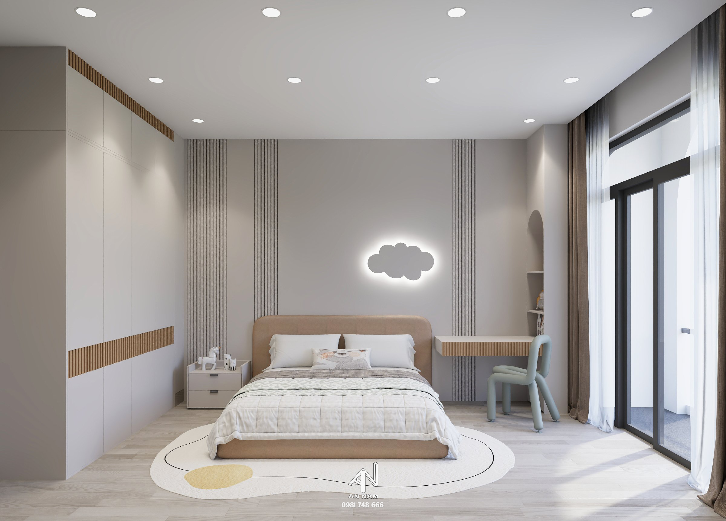 Điểm nhấn của nội thất chính là phần cầu thang, với tay vịn được làm từ cường lực màu đen khói, tạo nên sự sang trọng và đồng thời đảm bảo tính thẩm mỹ. Đèn led được bố trí tinh tế tại các bậc cầu thang không chỉ làm tôn lên vẻ đẹp của không gian mà còn tạo ra ánh sáng mềm mại, tạo điểm nhấn cho không gian.