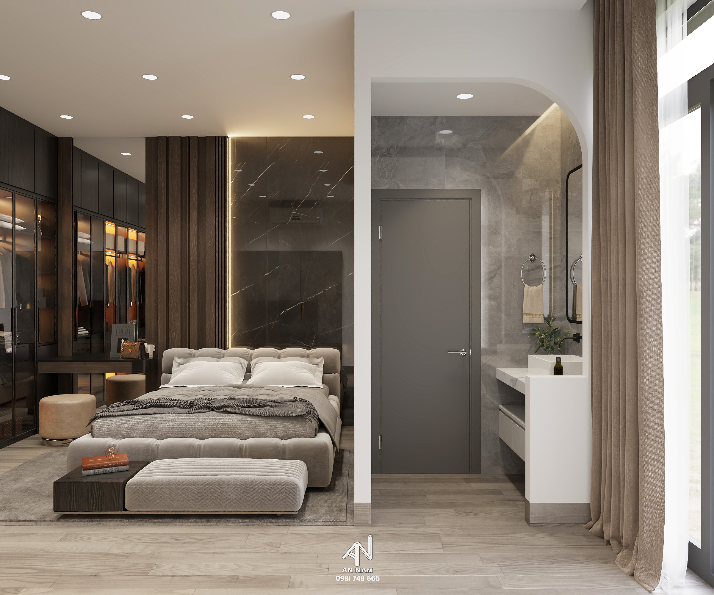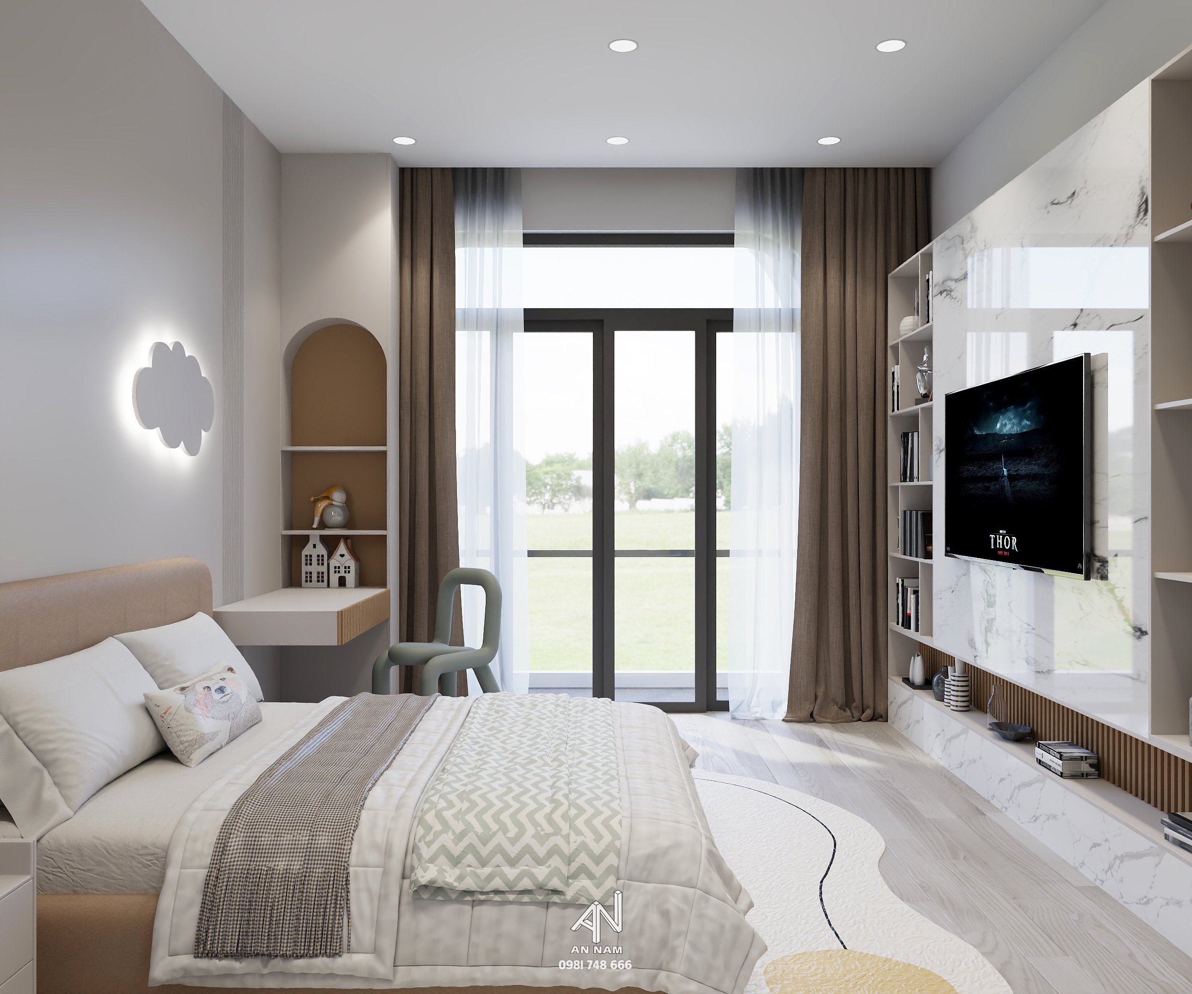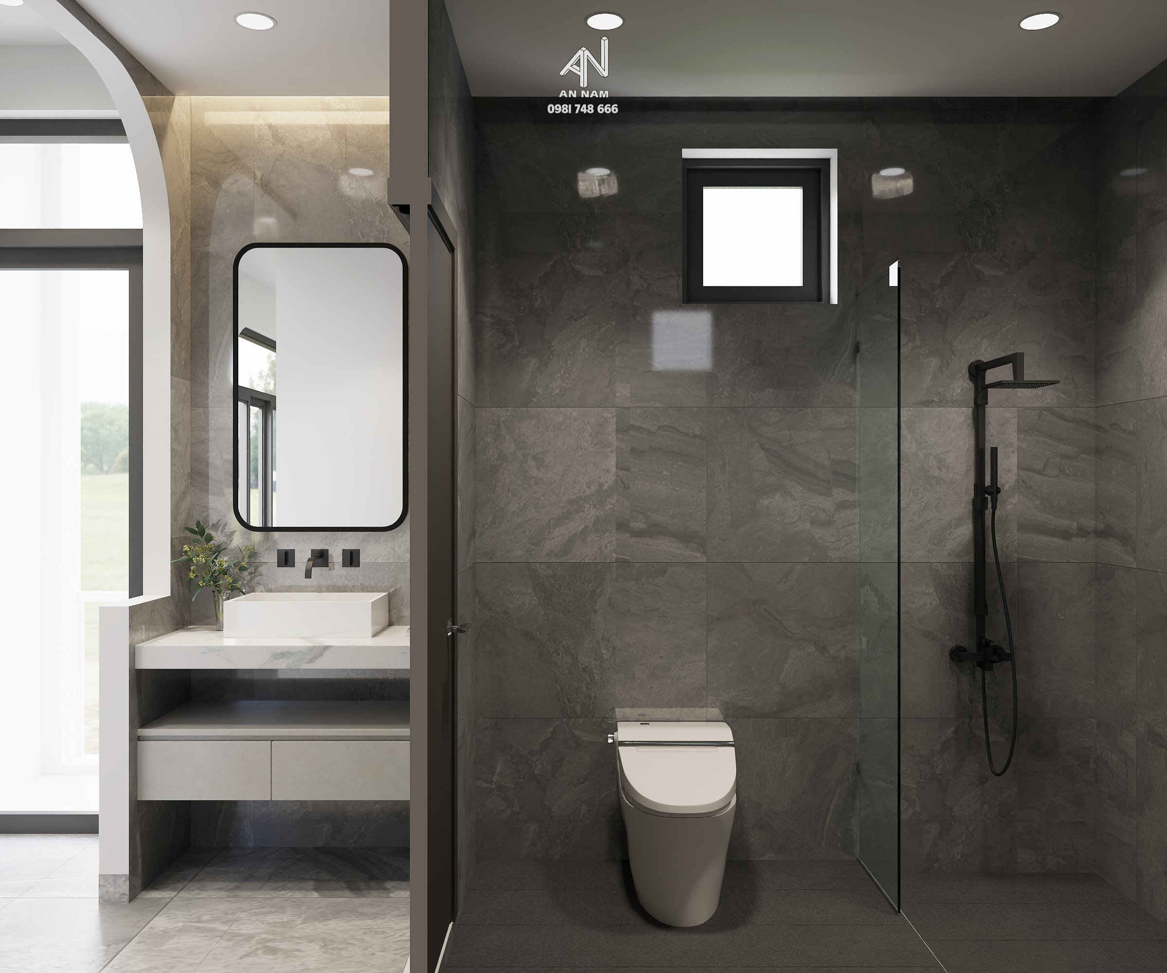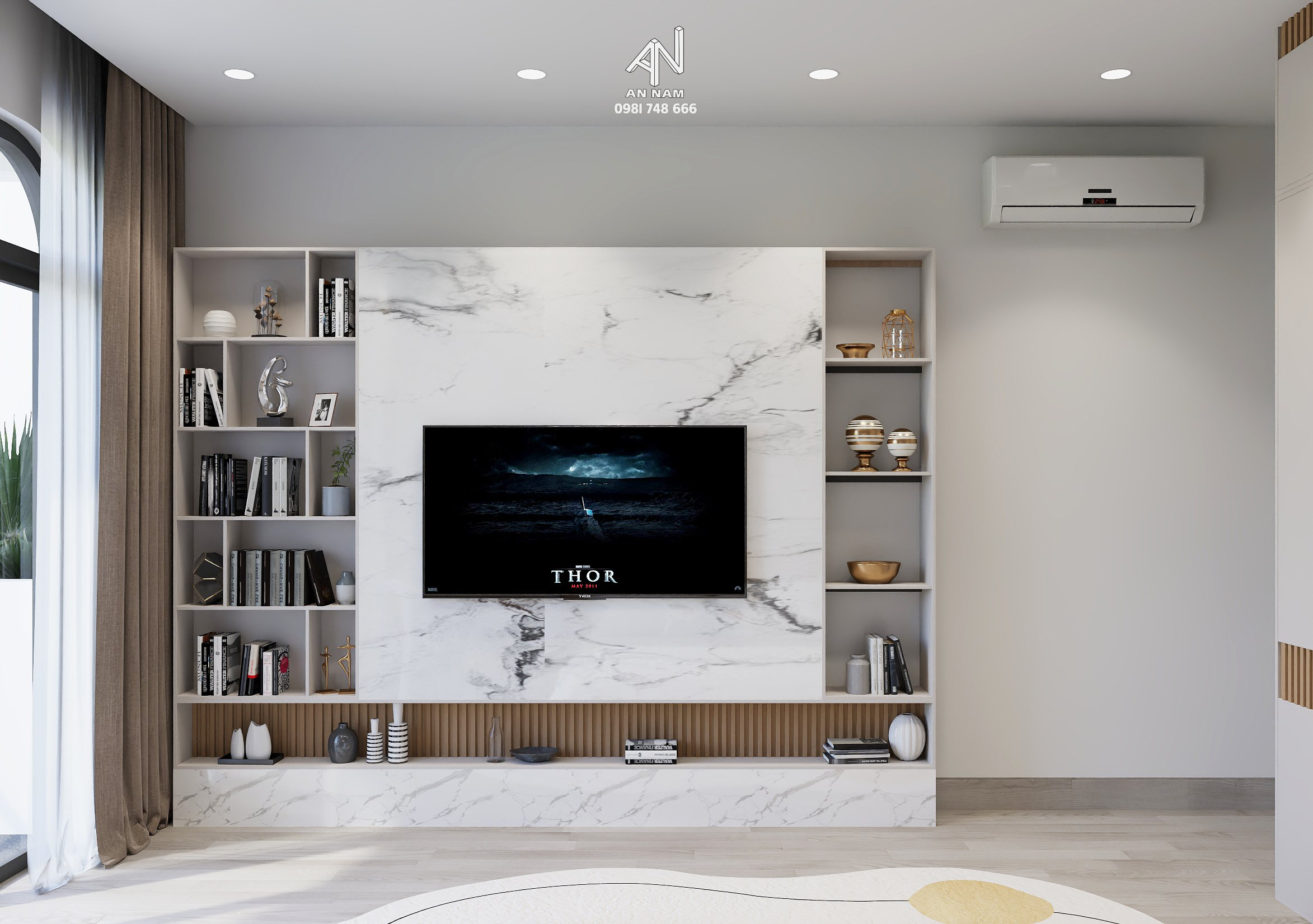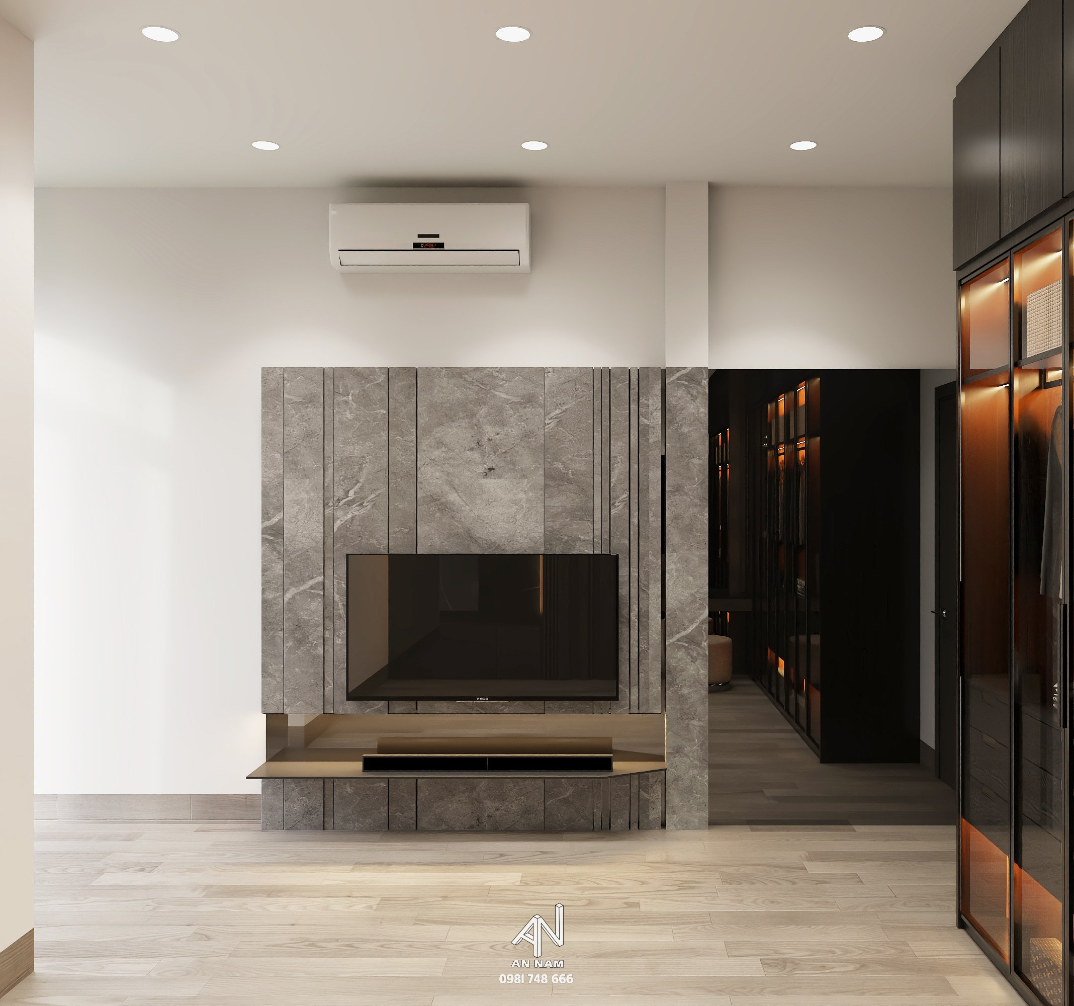 Điểm nhấn của nội thất chính là phần cầu thang, với tay vịn được làm từ cường lực màu đen khói, tạo nên sự sang trọng và đồng thời đảm bảo tính thẩm mỹ. Đèn led được bố trí tinh tế tại các bậc cầu thang không chỉ làm tôn lên vẻ đẹp của không gian mà còn tạo ra ánh sáng mềm mại, tạo điểm nhấn cho không gian.