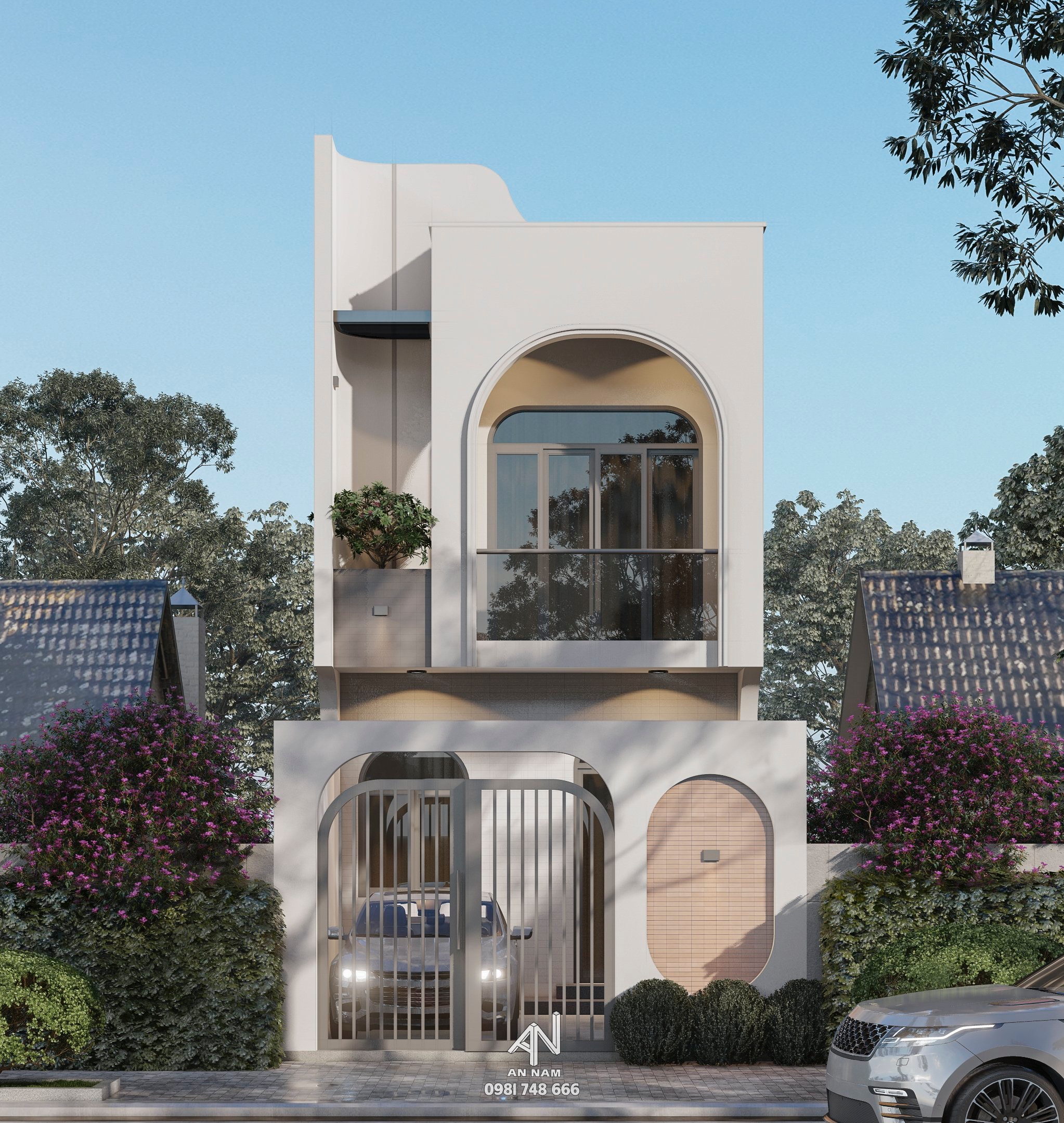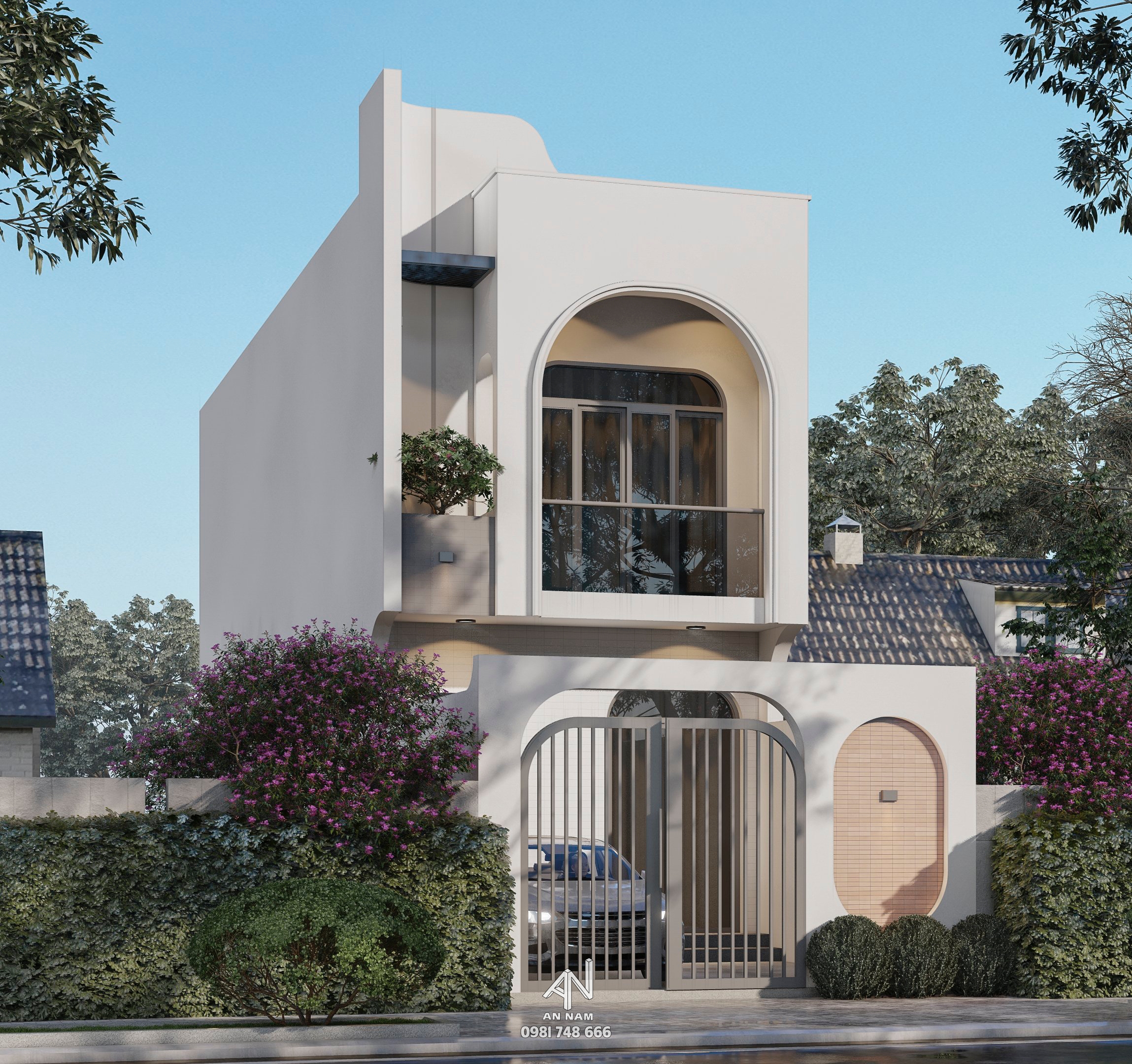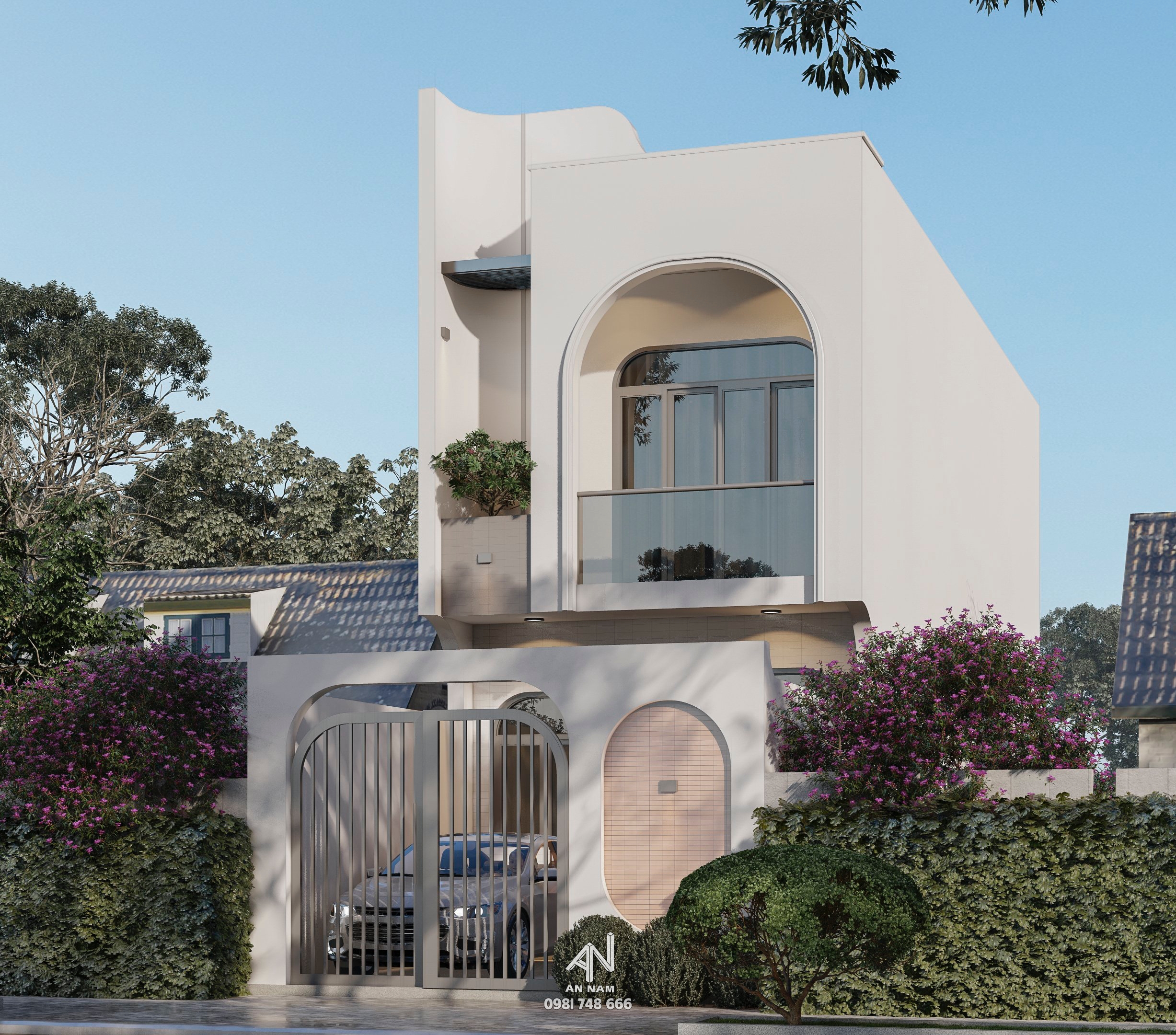Mặt tiền ngôi nhà mang tone màu trắng và kem, cùng những đường cong mềm mại tạo điểm nhấn kiến trúc độc đáo.