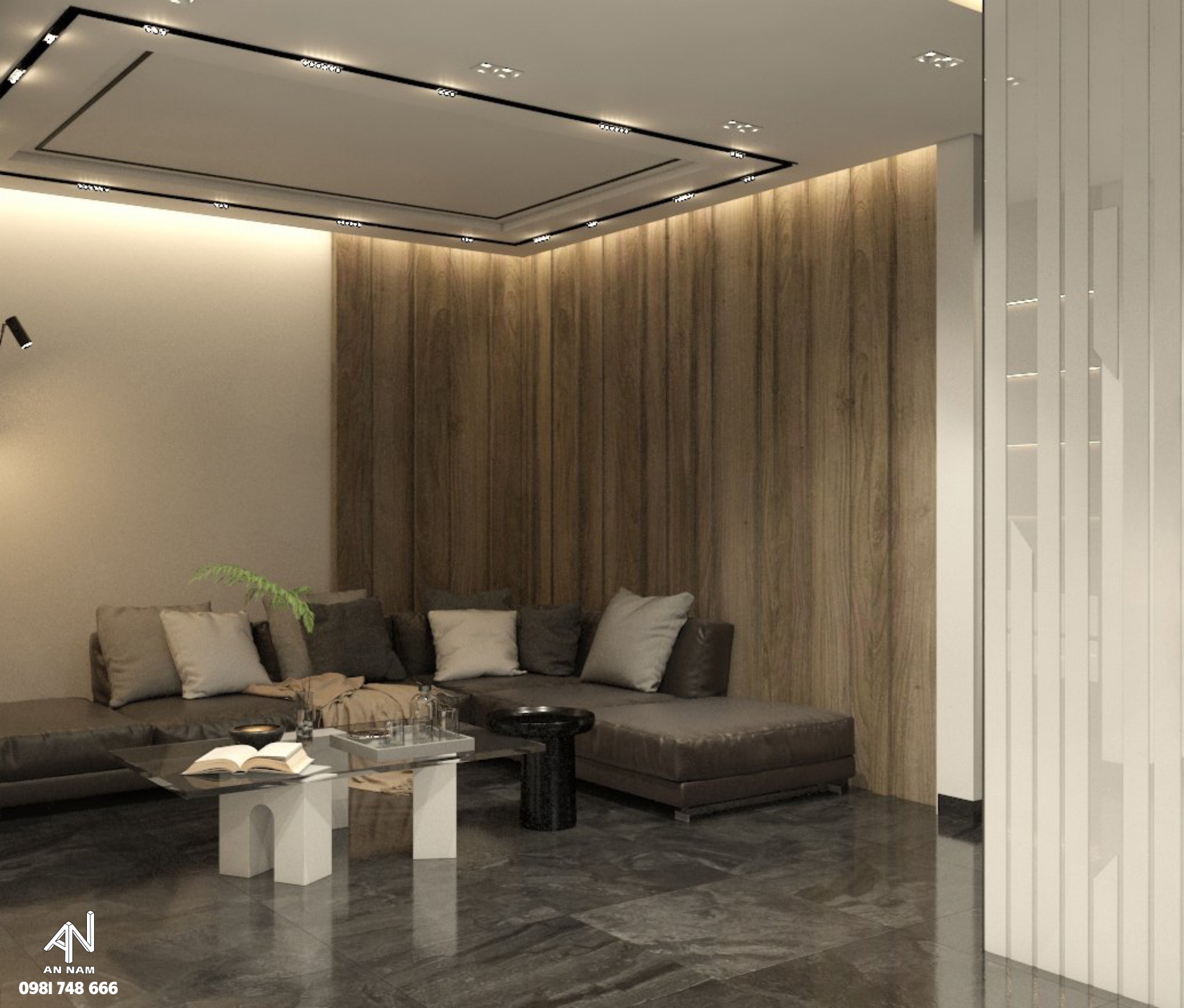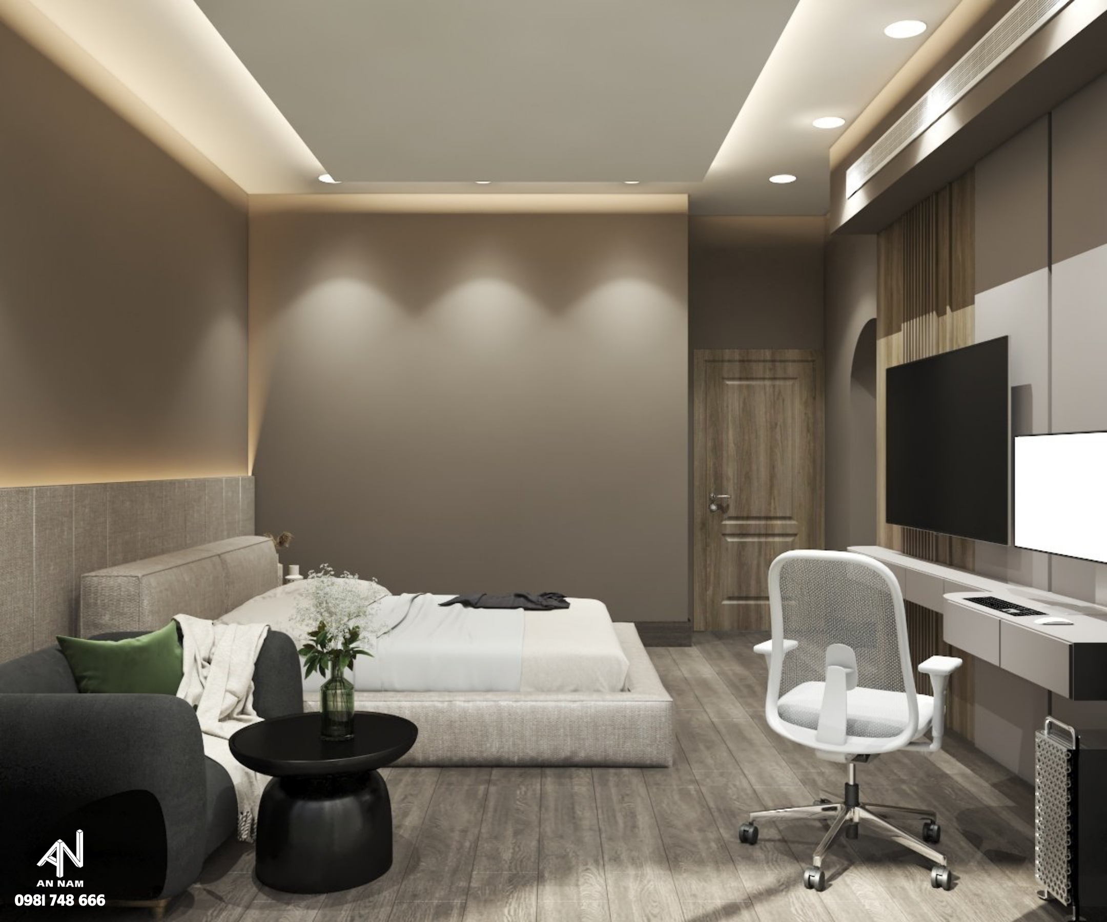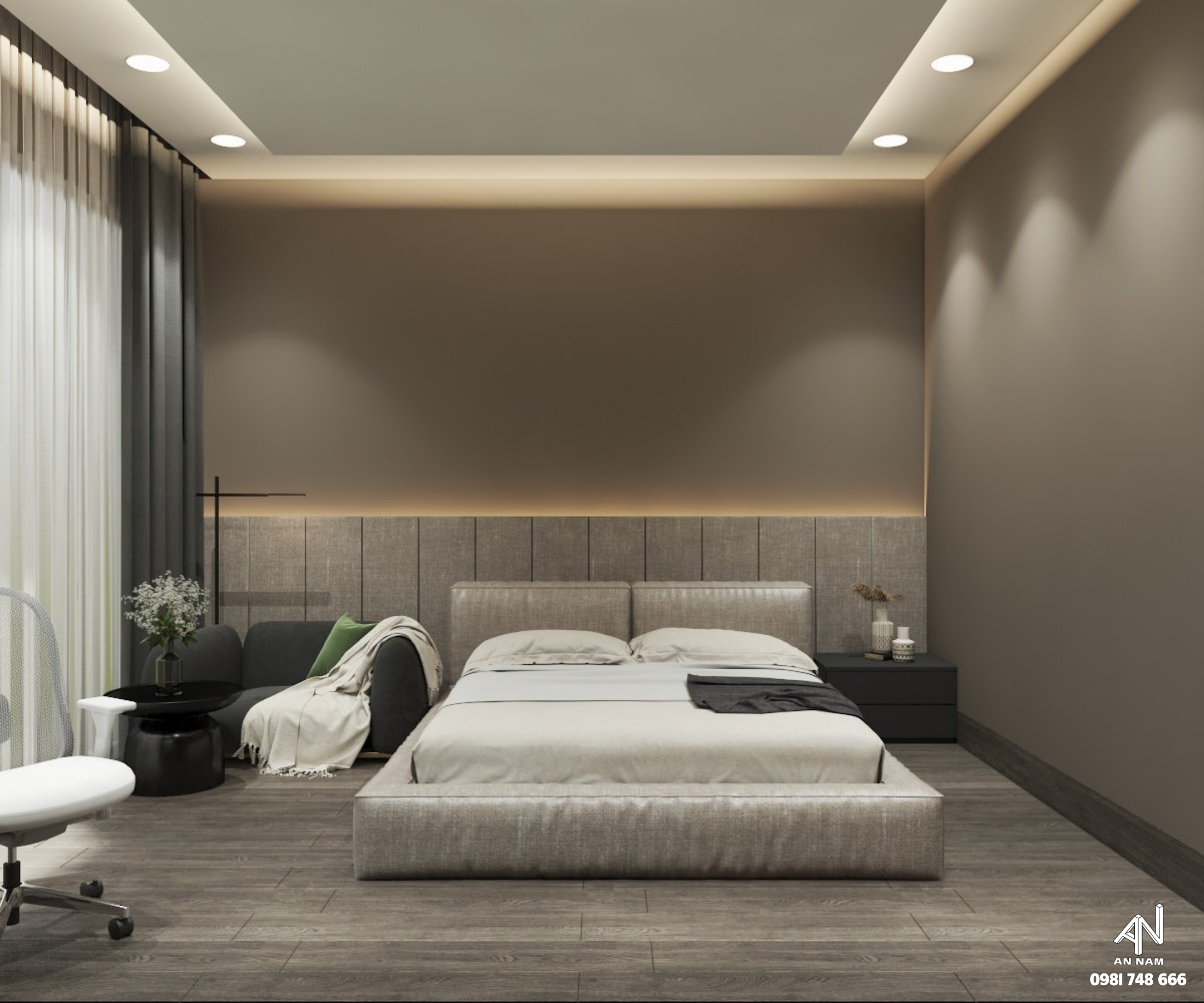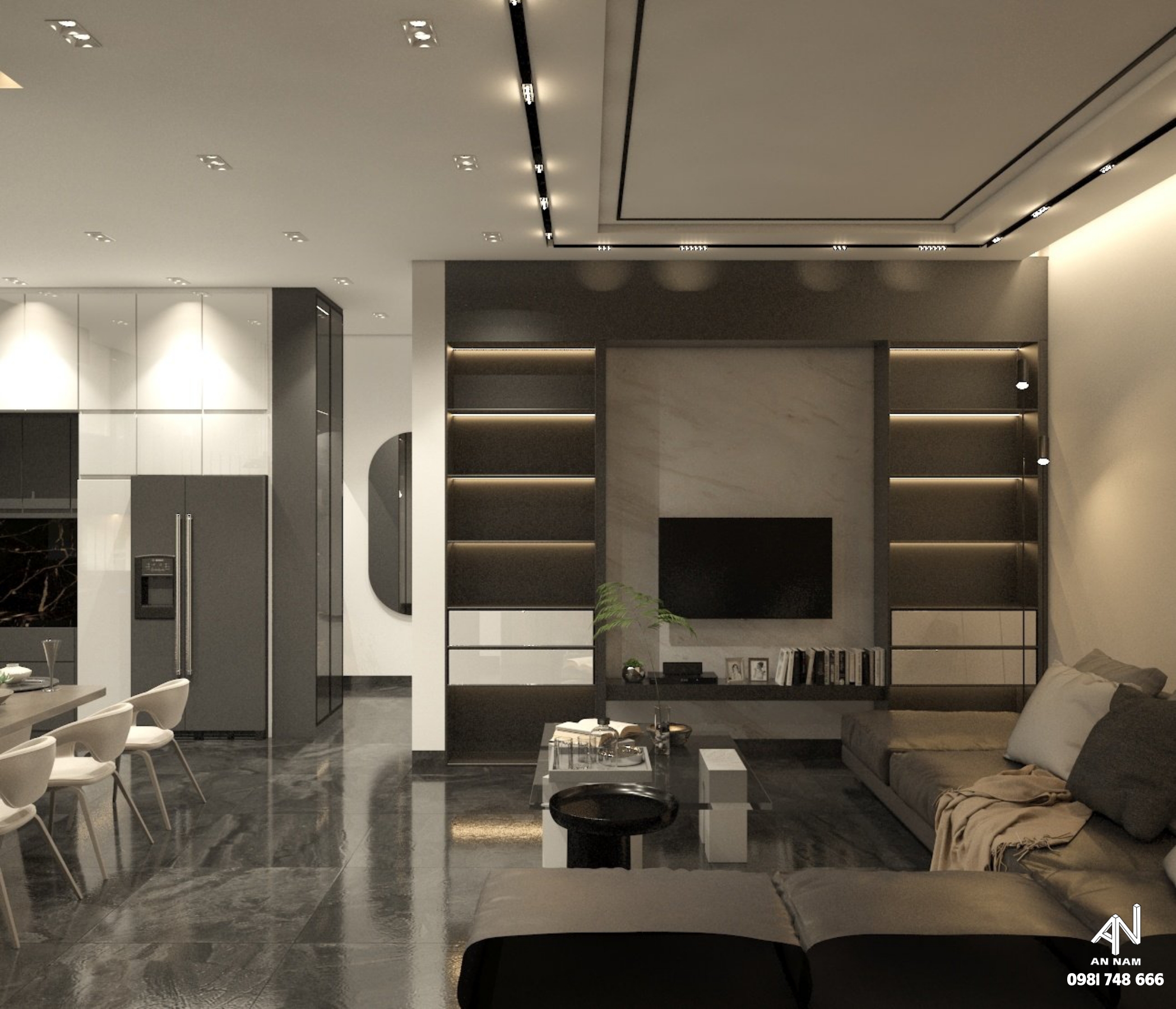 Ngôi nhà 2 mặt tiền với diện tích 8.4mx18m, được thiết kế theo phong cách hiện đại, tối giản và sang trọng. Nội thất phòng khách và phòng ngủ sử dụng gam màu tối, mang lại nét cá tính và sang trọng cho chủ đầu tư.