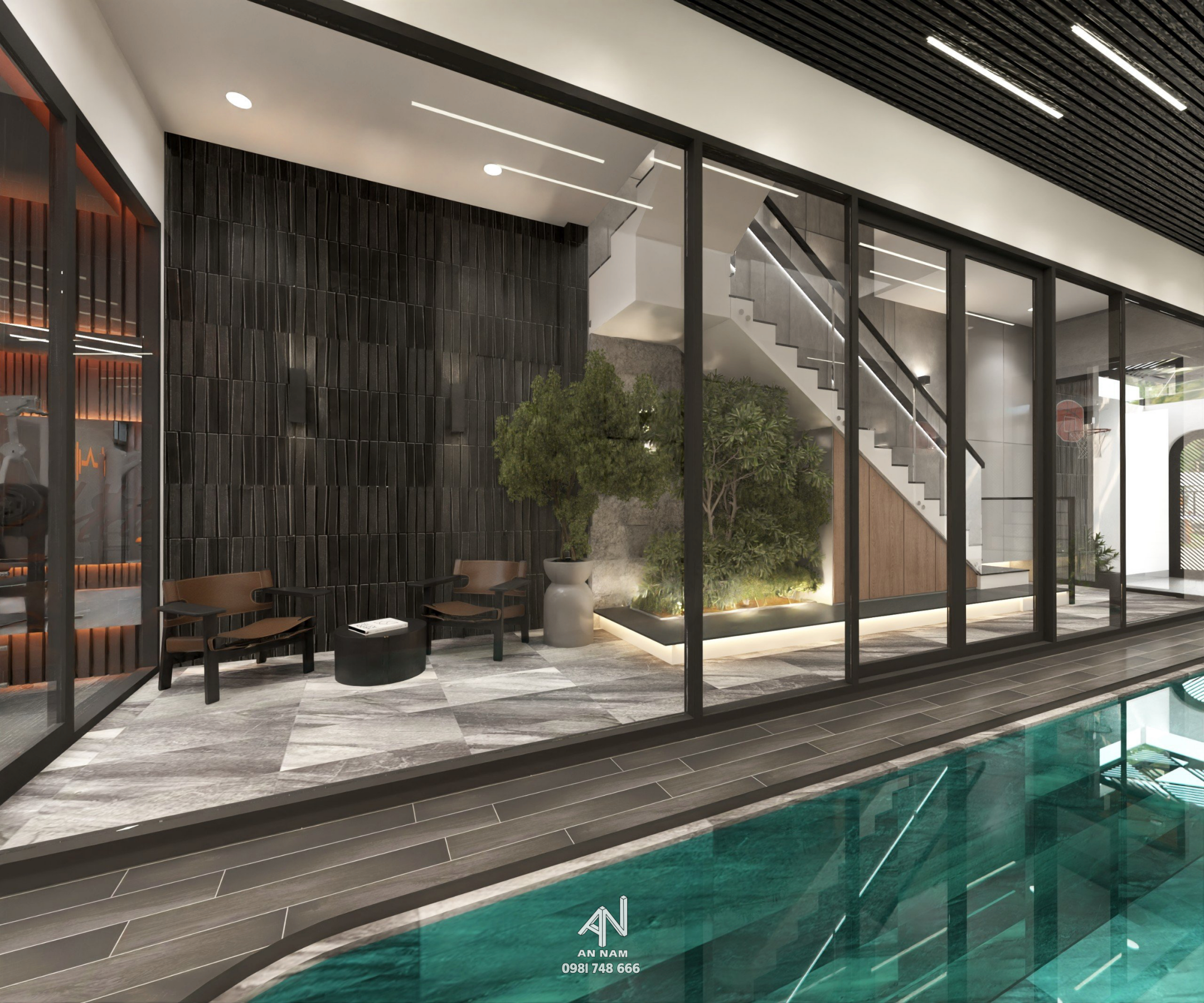 Phòng khách, nhà bếp không bố trí ở tầng trệt như các căn nhà truyền thống. Mà thay vào đó, tầng 1 của căn nhà được sử dụng cho 3 mục đích: gara xe hơi, hồ bơi và phòng gym.