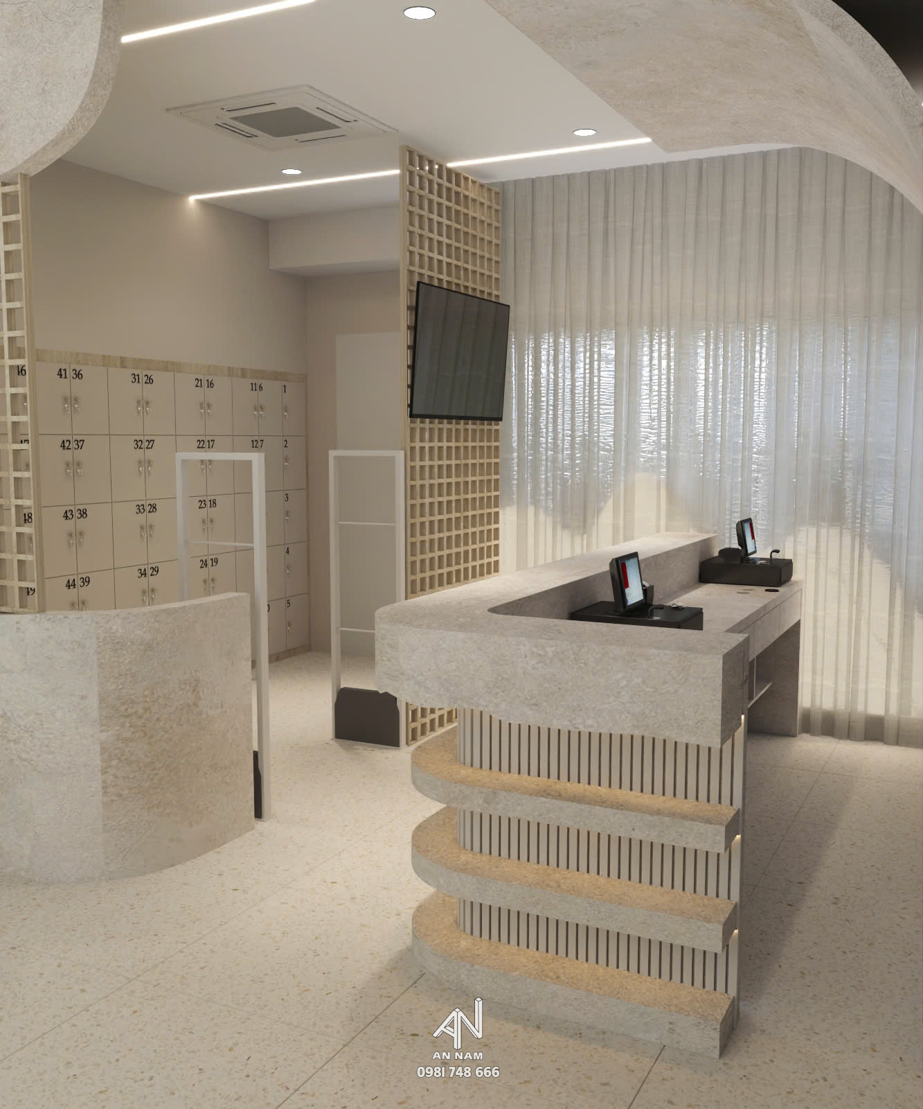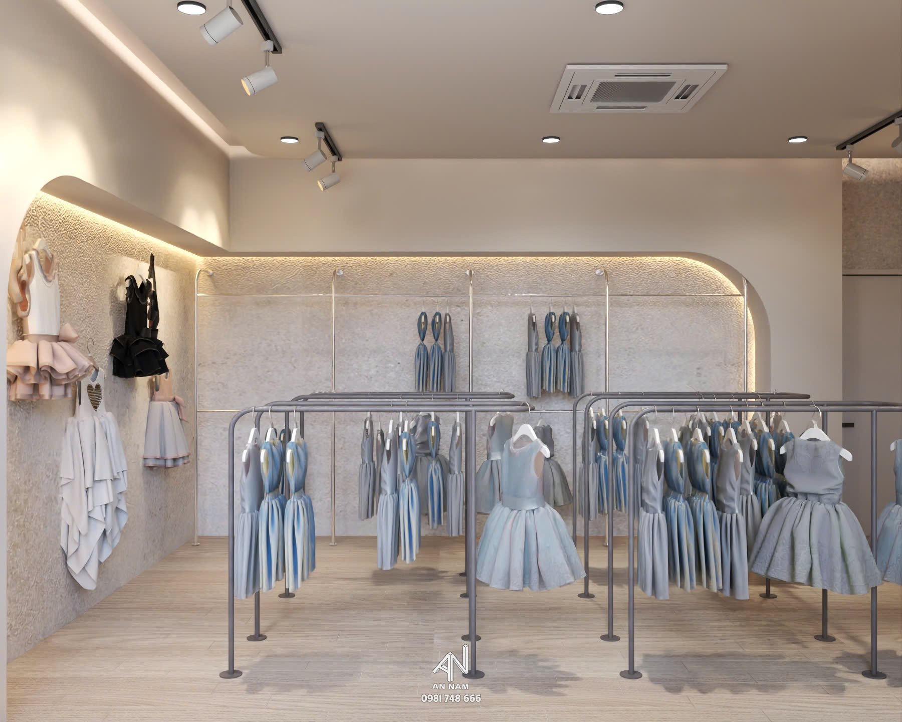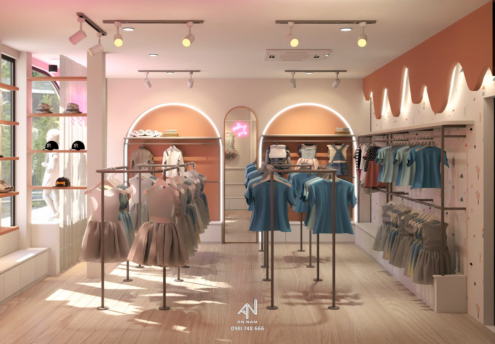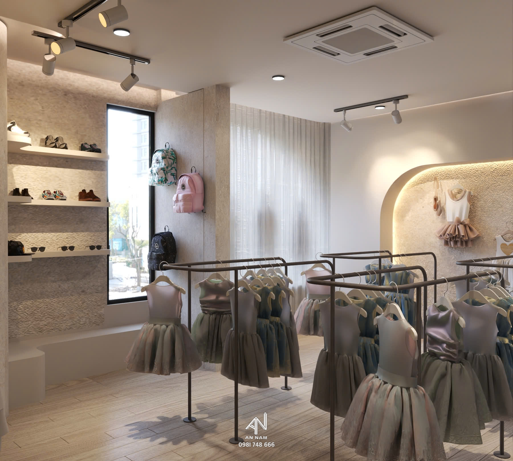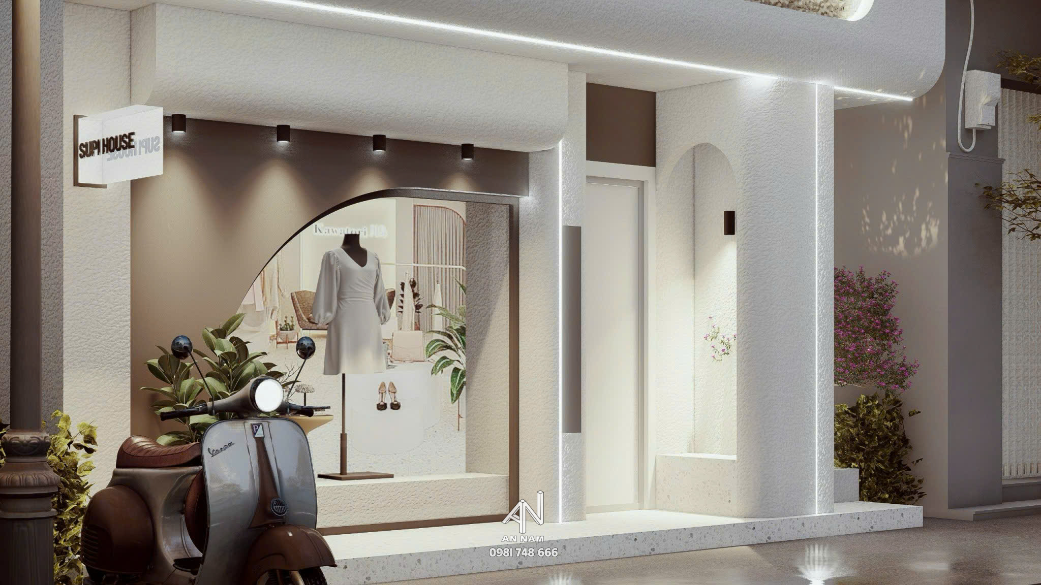 Cửa hàng có thiết kế khá tối giản với tông màu trắng chủ đạo, tạo cảm giác trẻ trung và tinh tế. Các đường nét kiến trúc được cách điệu nhẹ nhàng, mang đến vẻ đẹp mang hơi hướng hiện đại. Cửa kính được thiết kế với hình dáng cong mềm mại, tạo điểm nhấn độc đáo cho mặt tiền. Thiết kế này cũng giúp mở rộng không gian thị giác và mang đến cảm giác thoáng đãng.