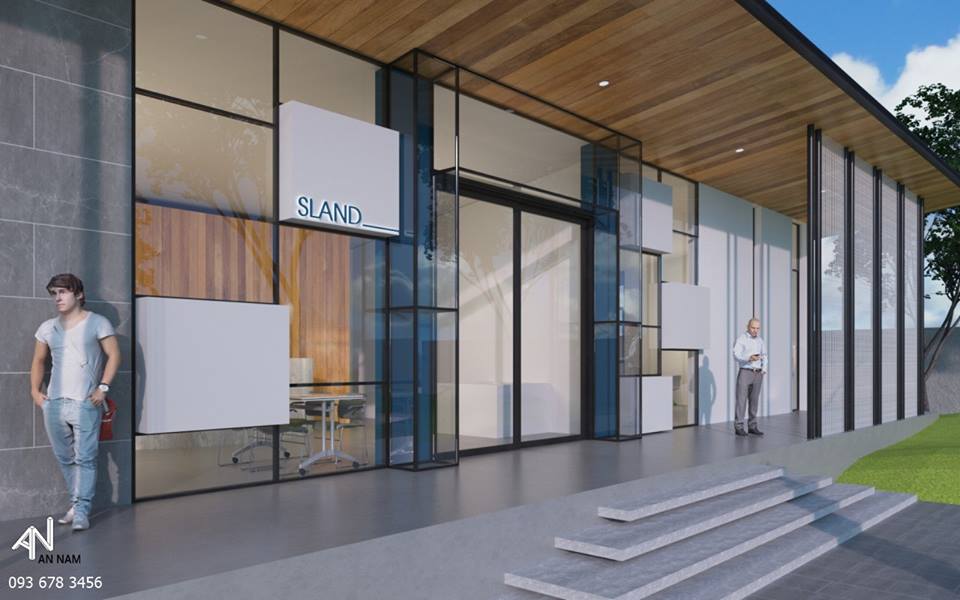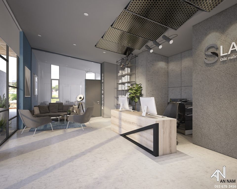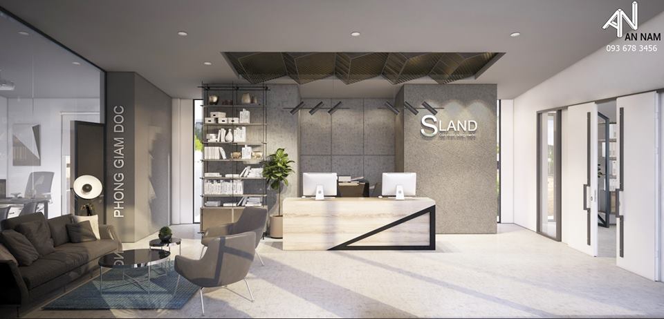 AN NAM lấy cảm hứng từ phong cách công nghiệp hiện đại, văn phòng BĐS S Land mạnh mẽ và cá tính với gam màu chính là xám, trắng ,nhấn xanh.