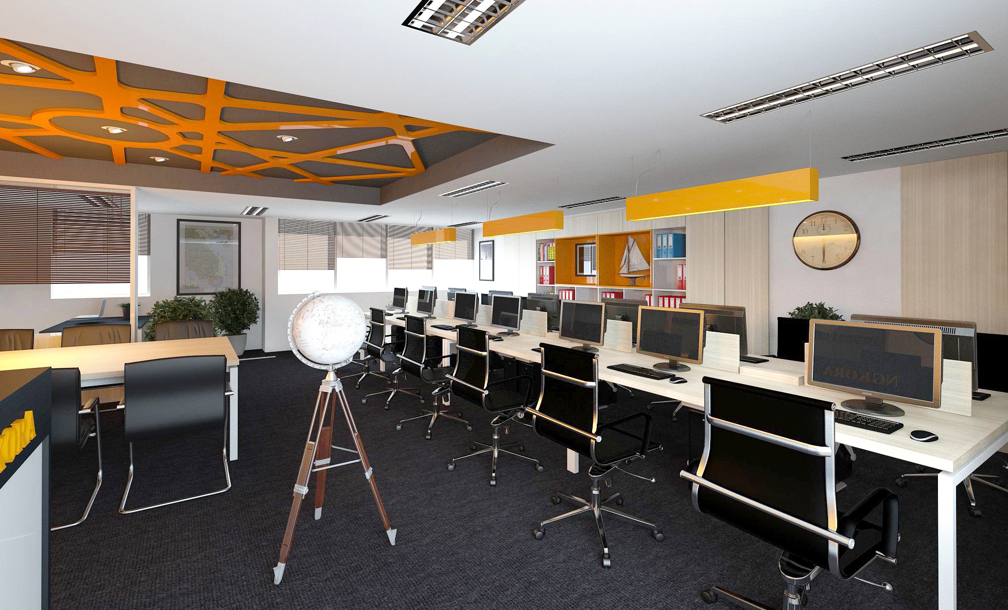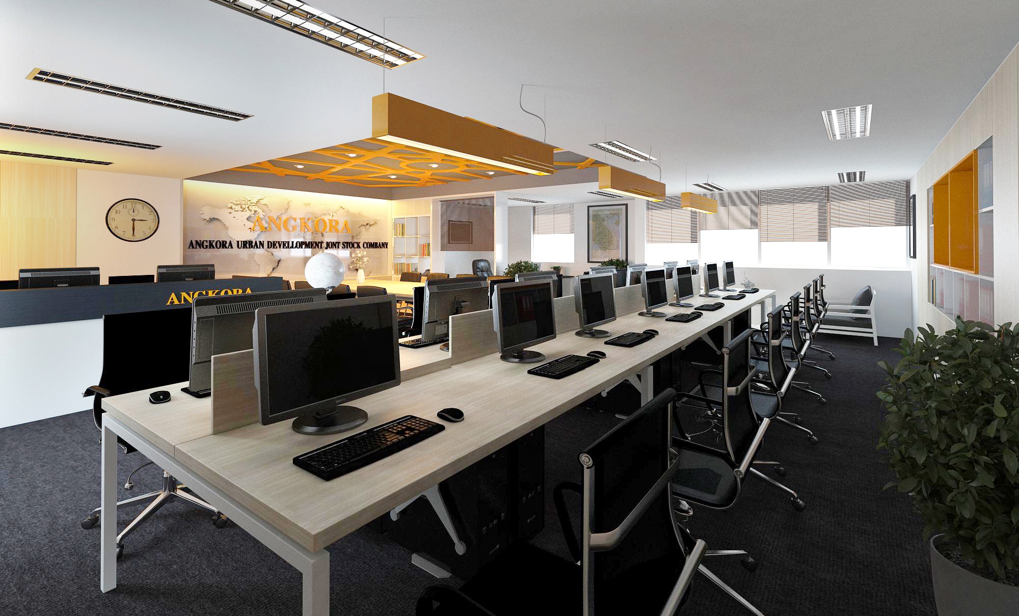 Văn phòng gồm: Khu vực lễ tân + khu vực tủ hồ sơ + bàn họp +chỗ ngồi 20 nhân viên + 1 phòng Giám đốc +1 Bàn tiếp khách